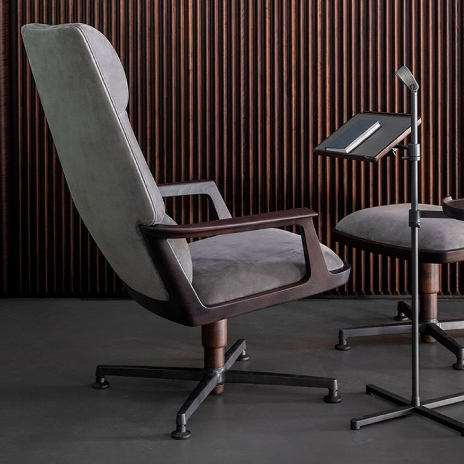 Estructura de nogal macizo Tapizado con espuma viscoelástica. La base incluye cuatro radios de aluminio con acabado bronce. El sillón está disponible tapizado en tela o en piel.