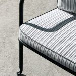 Con su línea moderna, Borea es una butaca de comedor apilable en aluminio pintado para uso en exteriores. Particularmente atractiva es la parte inferior del marco que se curva ligeramente hacia afuera cuando se apoya en el suelo.