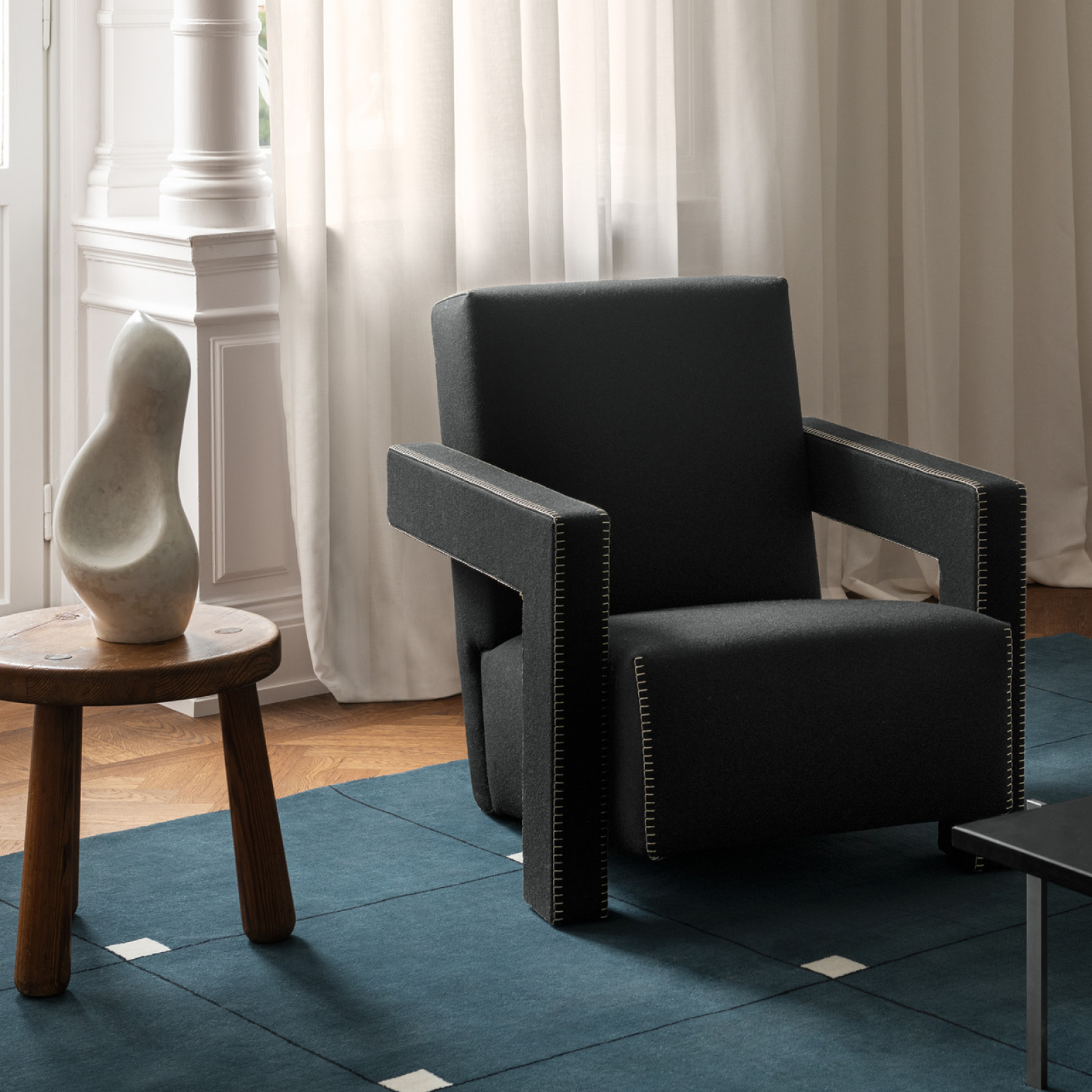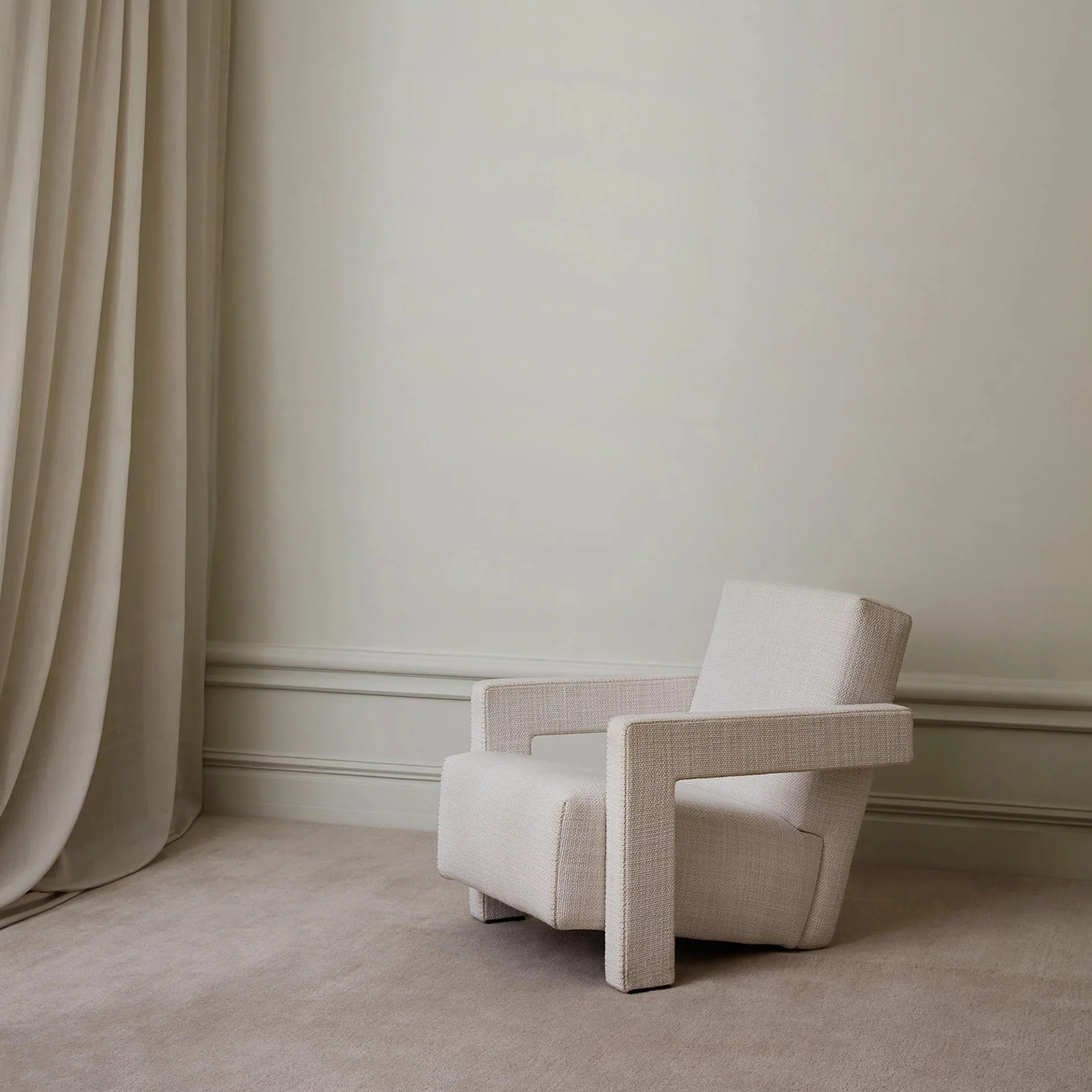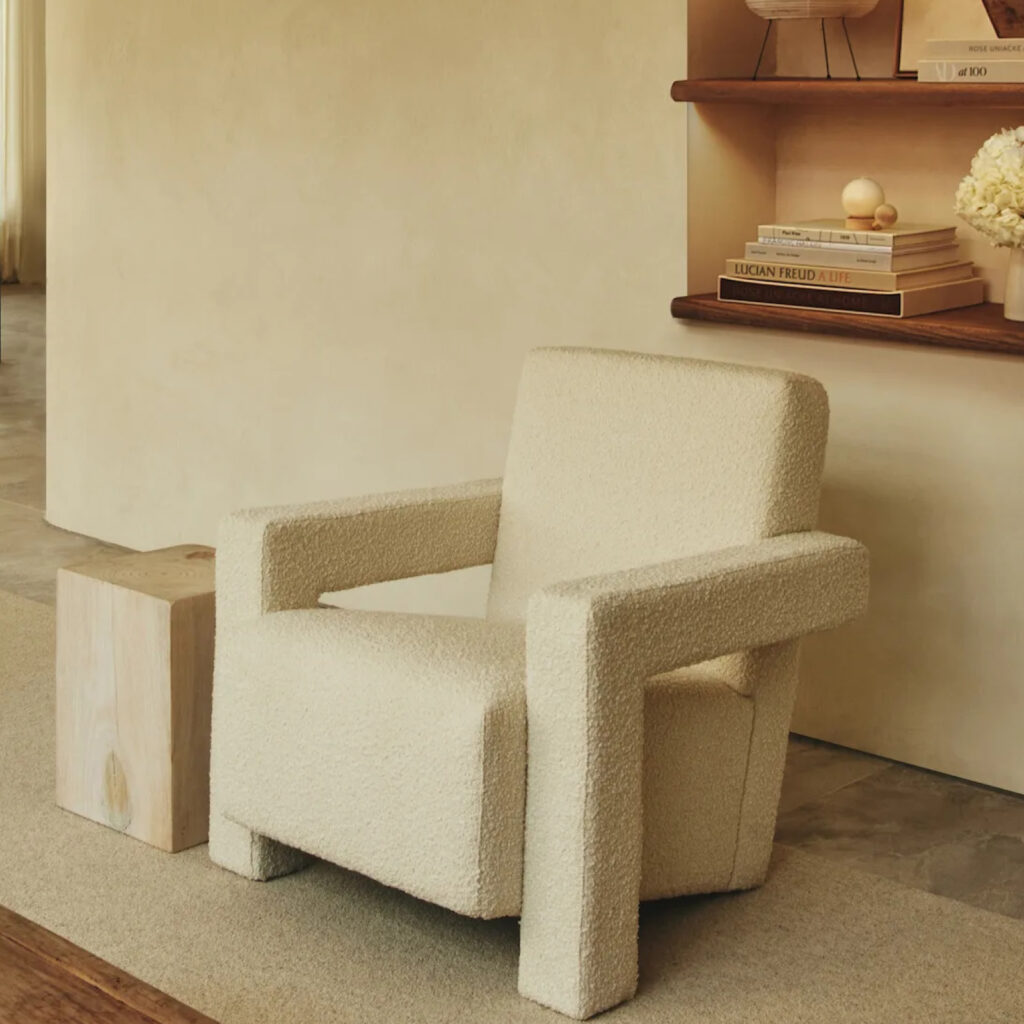 La yuxtaposición de ángulos rectos -respaldo y asiento que se unen en el suelo y reposabrazos que se transforman en piezas de apoyo- son rasgos distintivos del sillón Utrecht, que se convirtió en un símbolo del movimiento neoplástico.