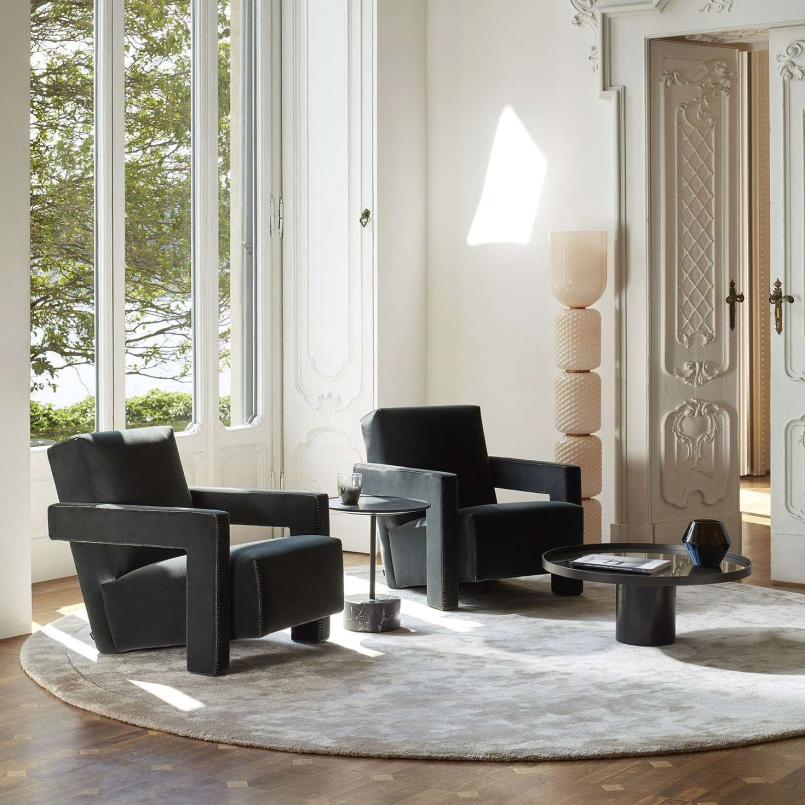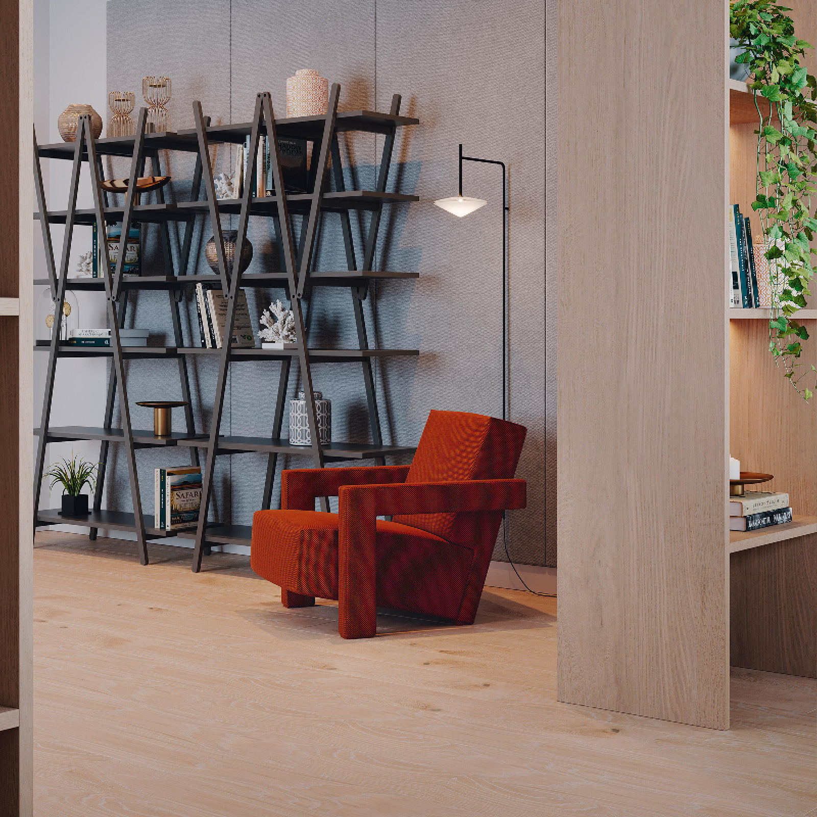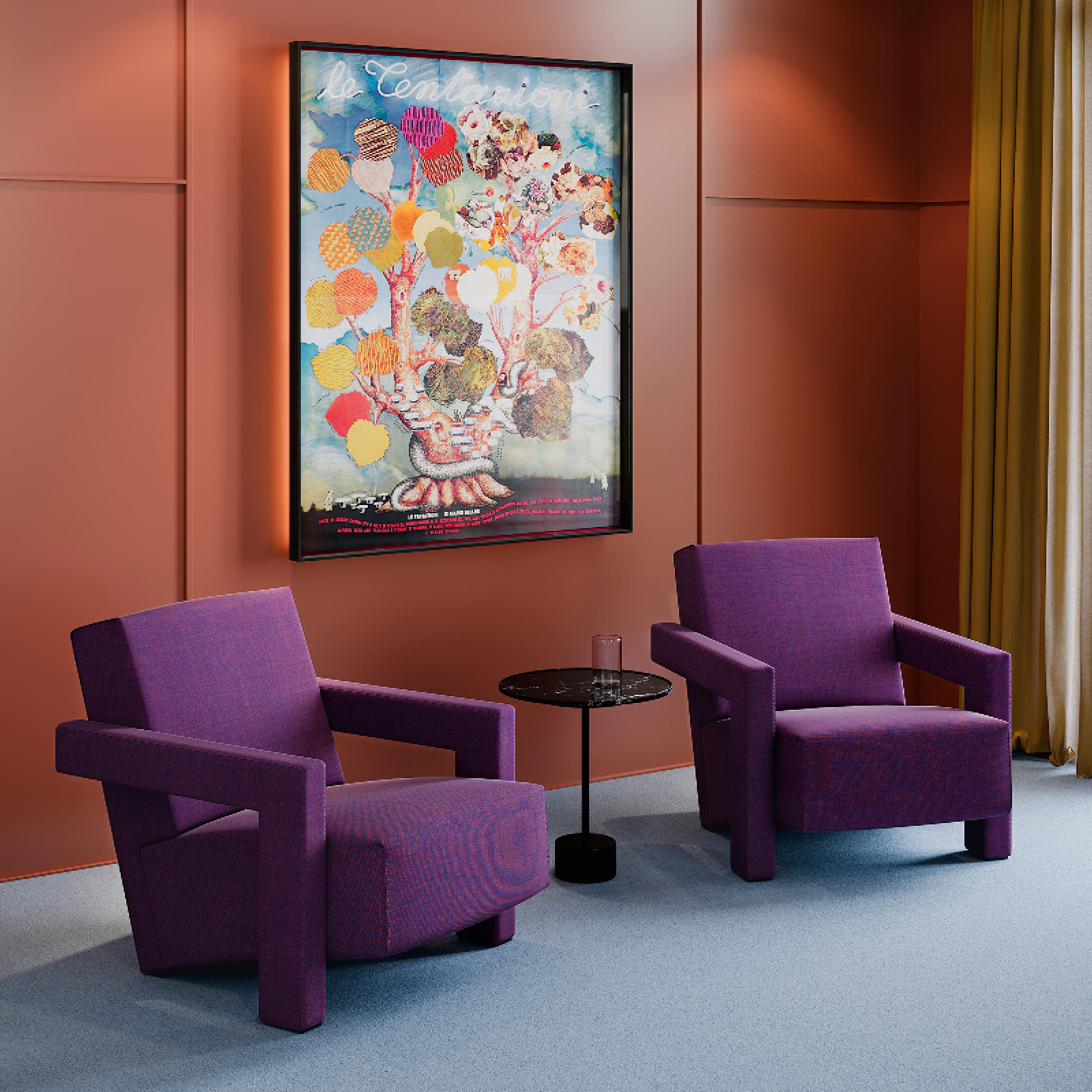 La yuxtaposición de ángulos rectos -respaldo y asiento que se unen en el suelo y reposabrazos que se transforman en piezas de apoyo- son rasgos distintivos del sillón Utrecht, que se convirtió en un símbolo del movimiento neoplástico.