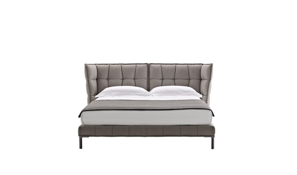 La cama de diseño Husk, tapizada en tela o piel, presenta un cabecero con gran personalidad que admite un somier, disponible en cuatro tamaños. Suave y acogedor, simple pero complejo en su geometría, el cabecero está decorado con detalles de capitoné. La cama Husk refleja la misma búsqueda de suavidad y confort que inspiró al sillón del mismo nombre, origen de una colección que incluye también sofá, sillas y mesas auxiliares.