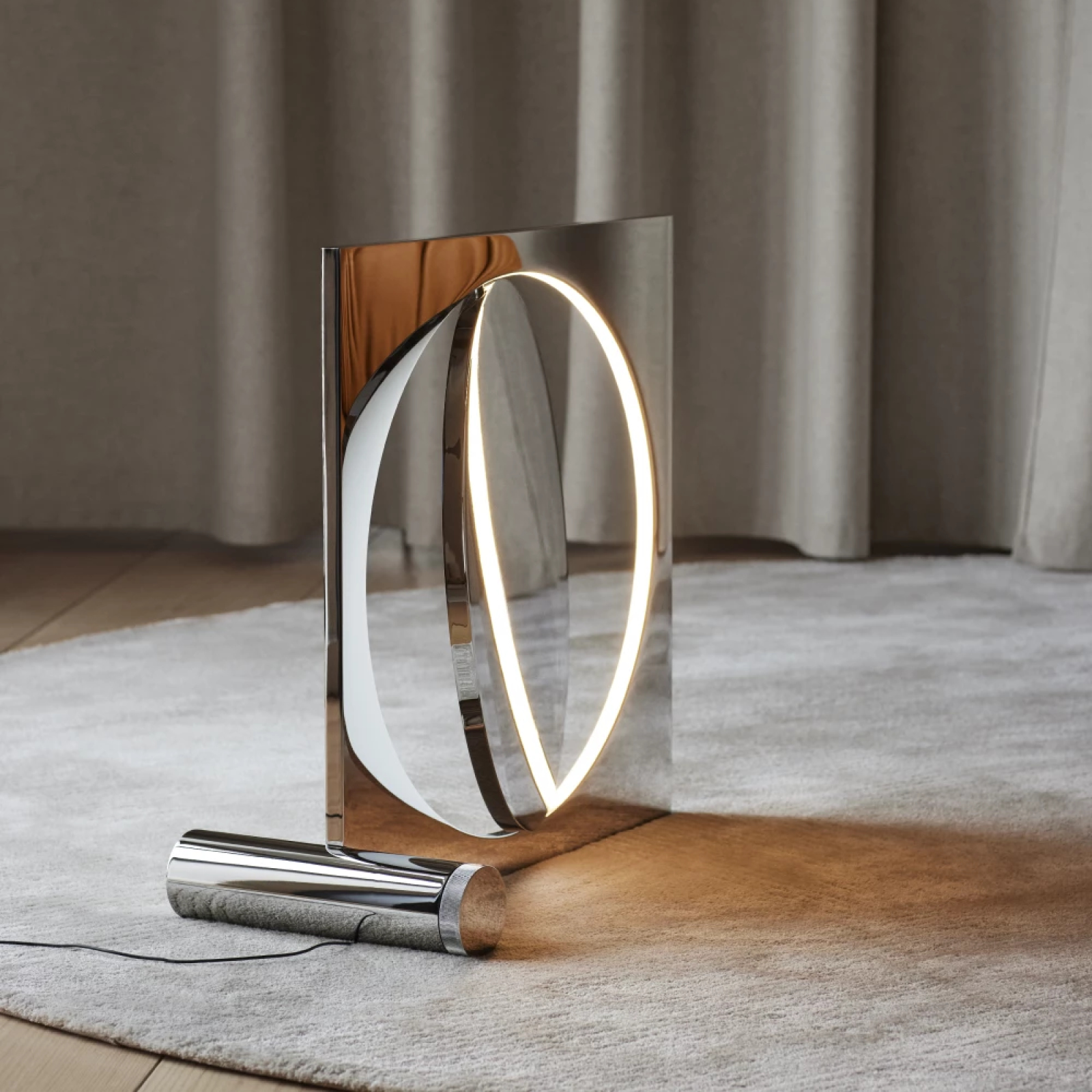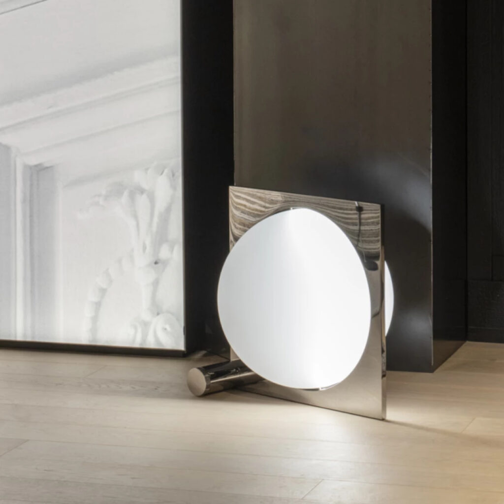 La estética escultórica de la lámpara de pie ocupa un lugar central en cualquier interior, casi como una obra de arte. Su disco rotatorio de 360°, que tiene un acabado diferente en cada lado, nos permite jugar y decidir cómo se debe reflejar la luz en la habitación y exactamente cómo la habitación debe reflejarse en la superficie espejo de la lámpara. Moonsetter nos invita a interactuar y explorar, viendo no solo la calidad del diseño, sino también sintiéndola y percibiéndola. Moonsetter difumina las líneas entre escultura y fuente de luz, cumpliendo una función estética y funcional. El tamaño impactante de Moonsetter atrae naturalmente la atención y crea una habitación dentro de la habitación que puede ser moldeada a través de reflexiones y luz. Las lámparas están numeradas en ediciones de 100 piezas por edición y serán grabadas con el número de edición y un número secuencial único del 1 al 100.