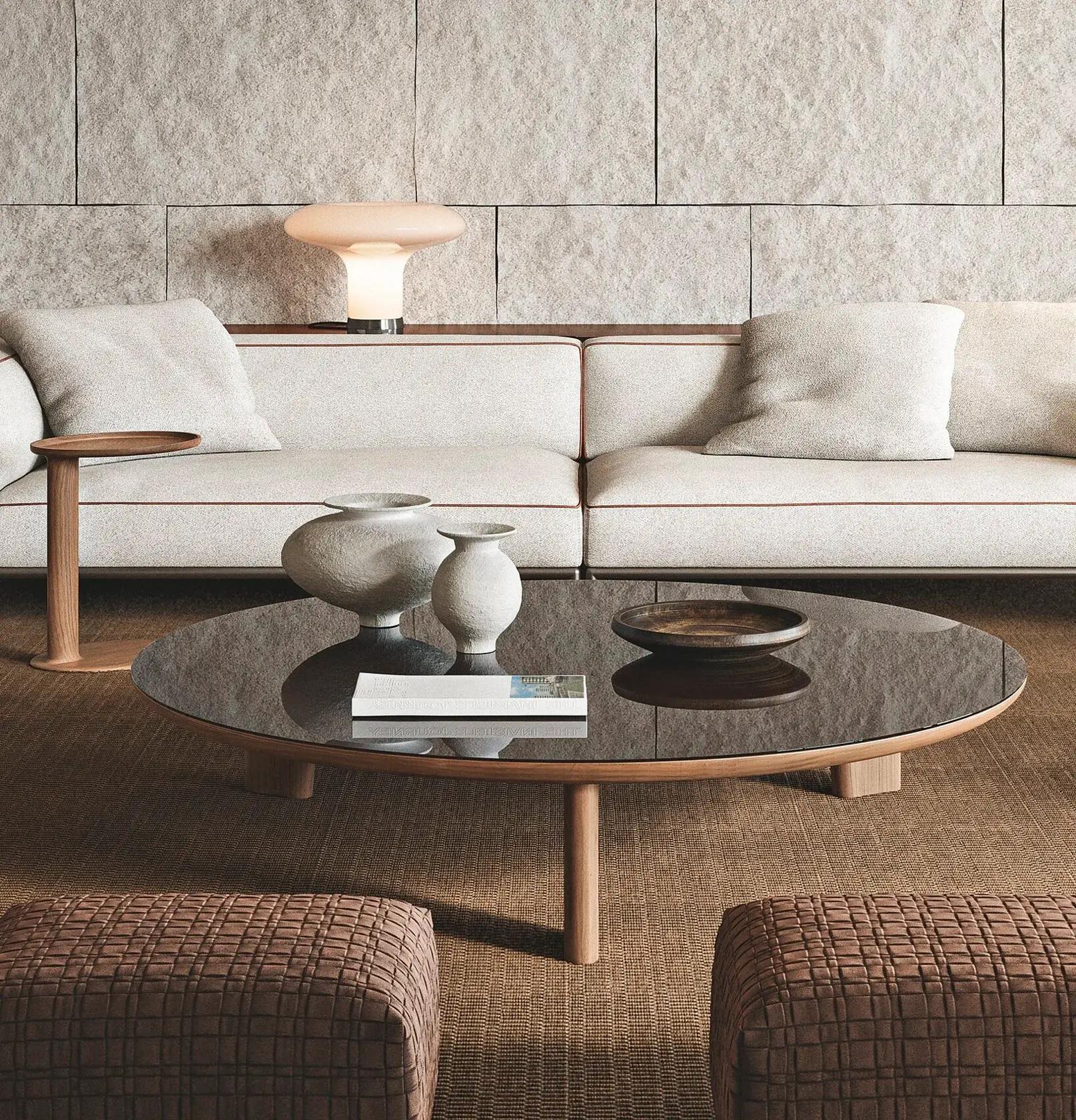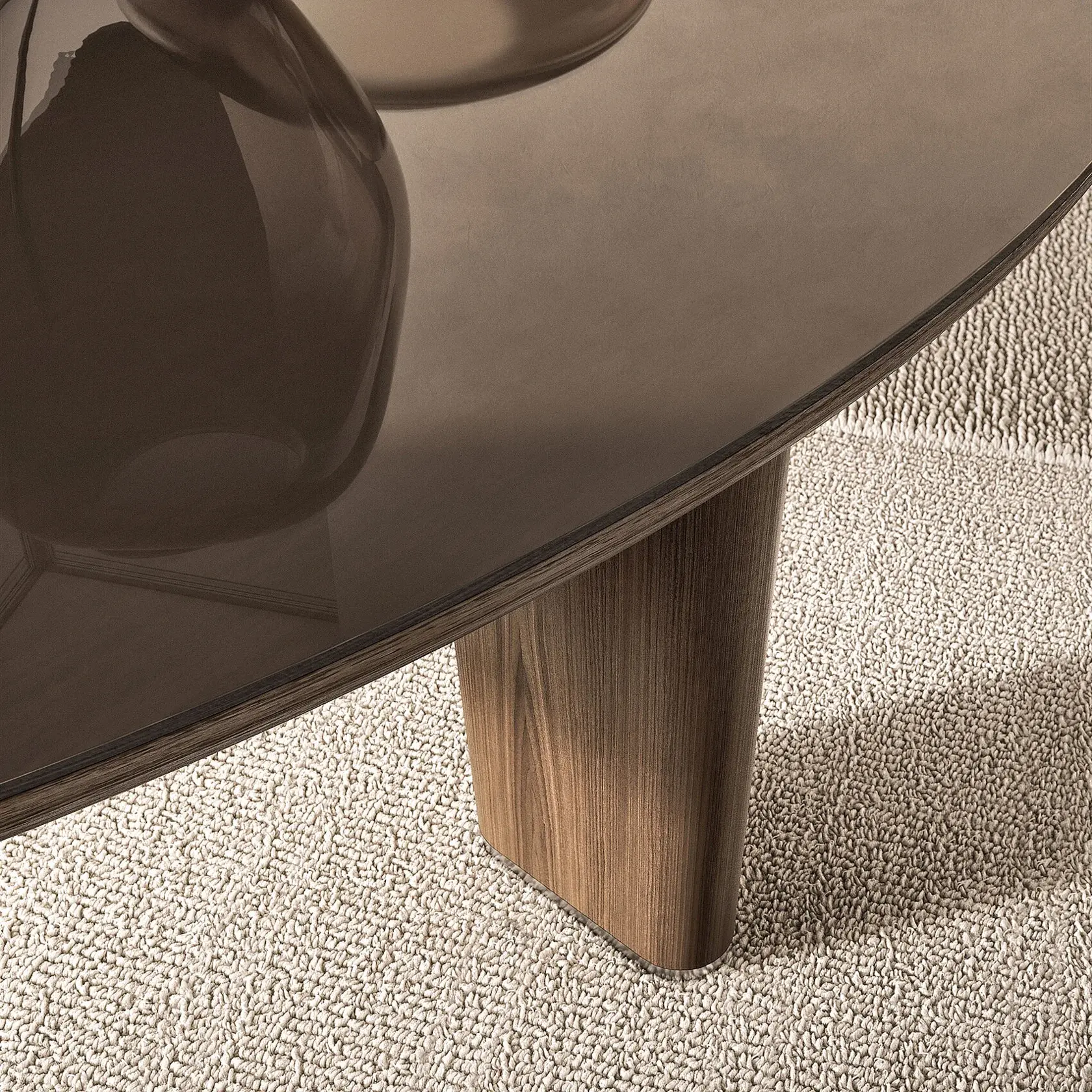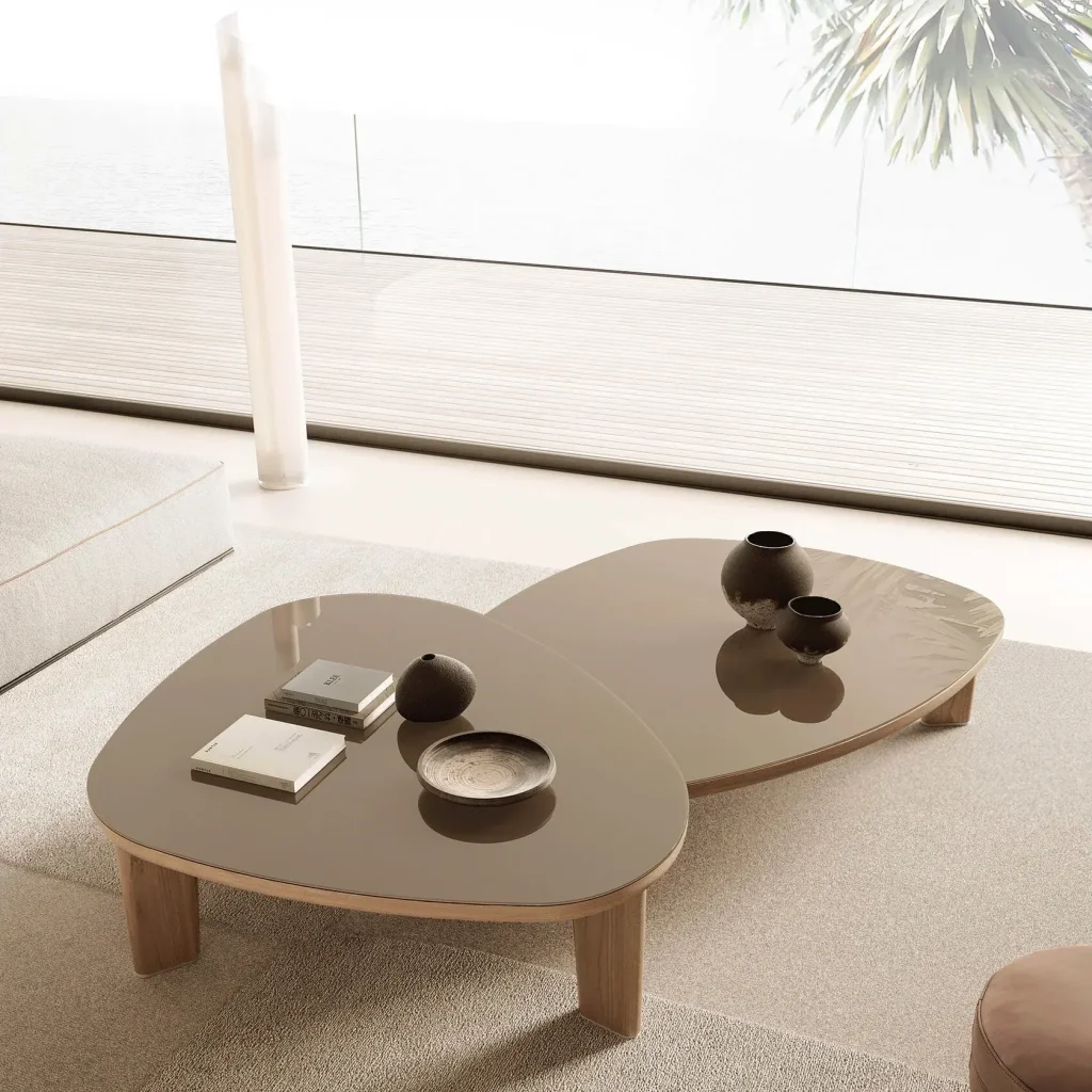 Una familia de mesas de centro caracterizadas por líneas esenciales, que a la tradición le añaden una expresión contemporánea. El diseño de las patas y su posición oblicua aporta dinamismo al proyecto. El espesor del tablero de la mesa y el de las patas le da solidez al conjunto. Aunque el diseño se basa en un concepto de monomaterialidad, el tablero puede realizarse tanto en madera chapada como en vidrio pintado, en una gama de colores refinados.
