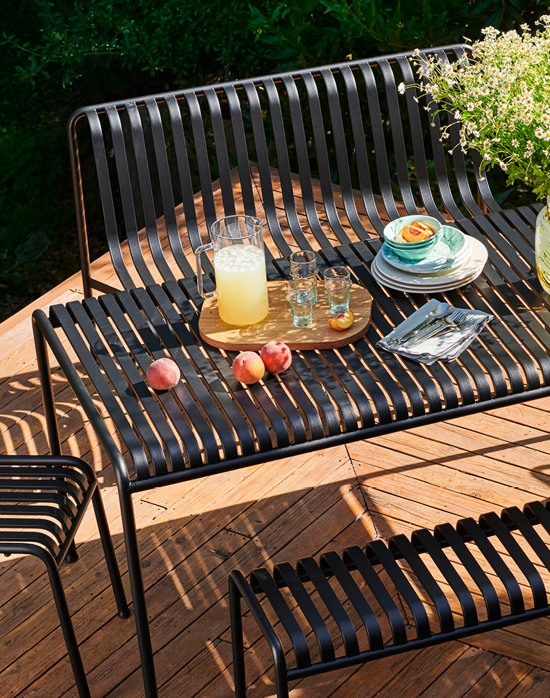 Creado para su uso al aire libre, esta colección equilibrada se compone de 13 diferentes tipos de muebles que comparten el mismo principio geométrico. La colección se ha desarrollado en el transcurso de dos años de Ronan y Erwan Bouroullec para Hay. Los diseños finales están creados a partir de acero con recubrimiento de polvo e incluyen sillas de comedor, mesas, taburete, taburete de bar, banco, banco de comedor, sillón y sofá. La colección Palissade es visualmente ligera pero con fuerza; es clásica en la forma y de construcción sencilla. Cada pieza individual ha sido cuidadosamente diseñada para mantener el cuerpo en un equilibrio perfecto. Hay cambios casi imperceptibles, pero significativos en los ángulos, curvas y la yuxtaposición entre el marco y las lamas en cada tipología es diferente. El diseño en sí ofrece comodidad y elegancia, mientras que la paleta de colores de color gris claro, antracita o verde oliva permiten que las piezas estén en un entorno de casa, en paisajes naturales y el medio urbano. La colección Palissade también está disponible con un acabado galvanizado por inmersión en caliente, que ofrece una larga vida útil sin mantenimiento.