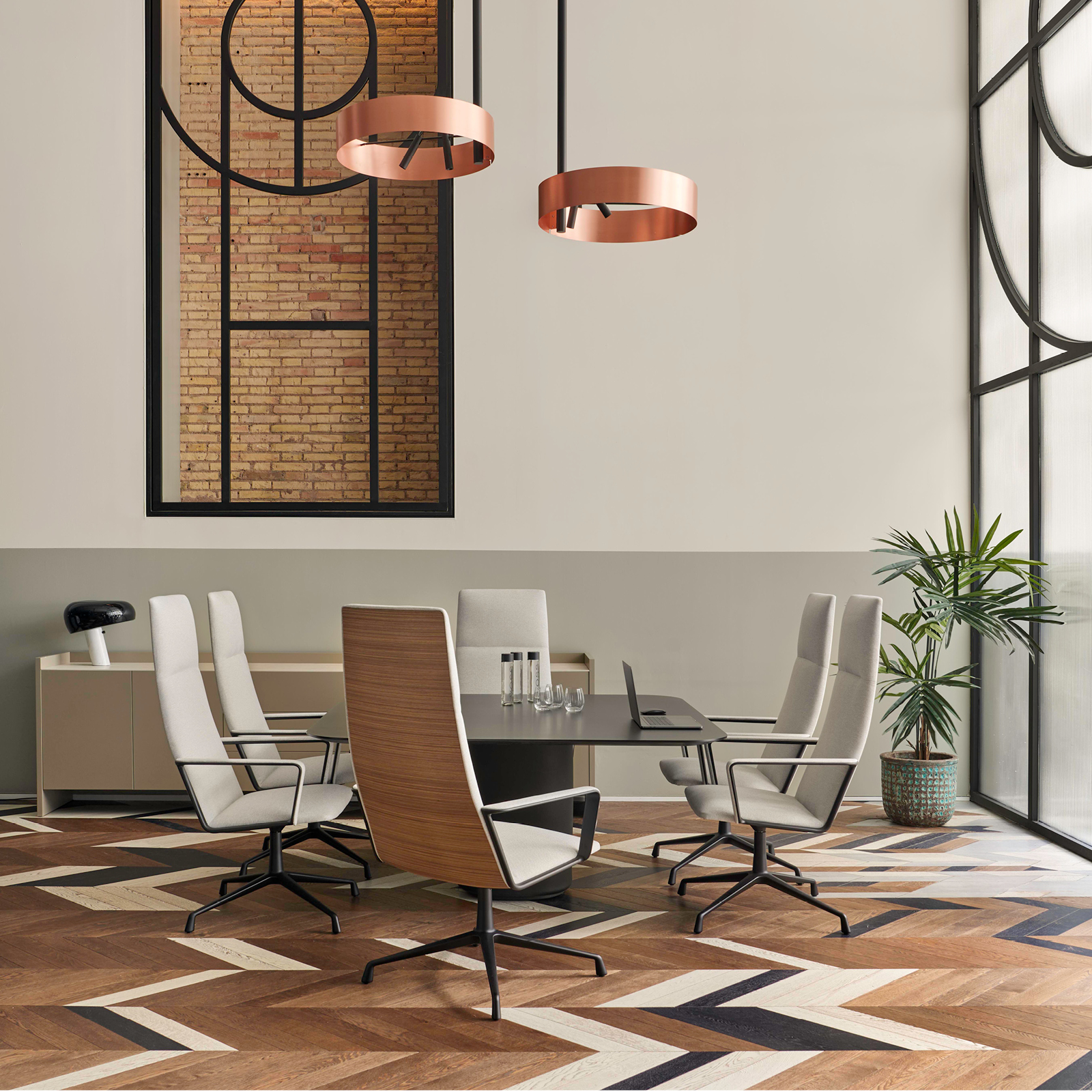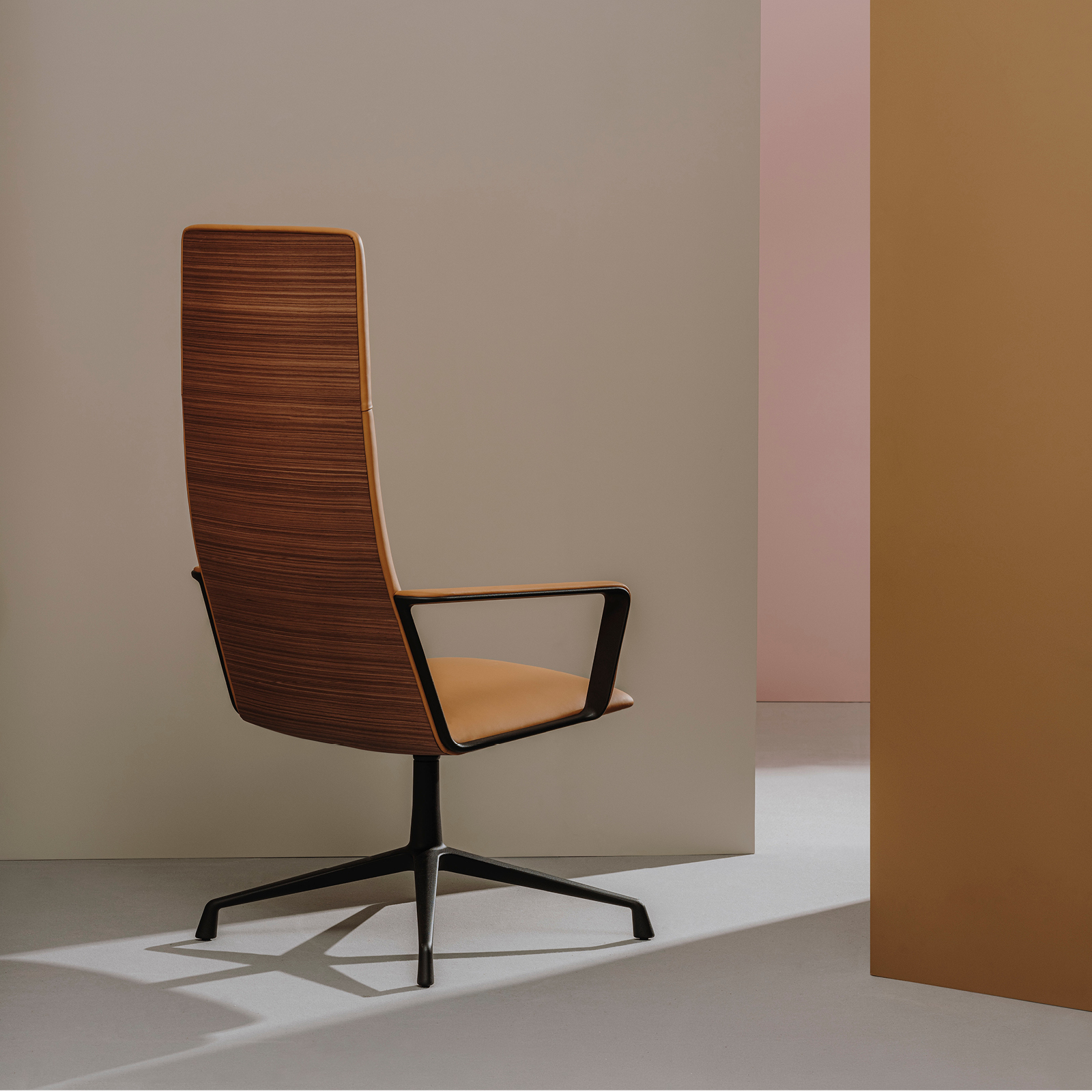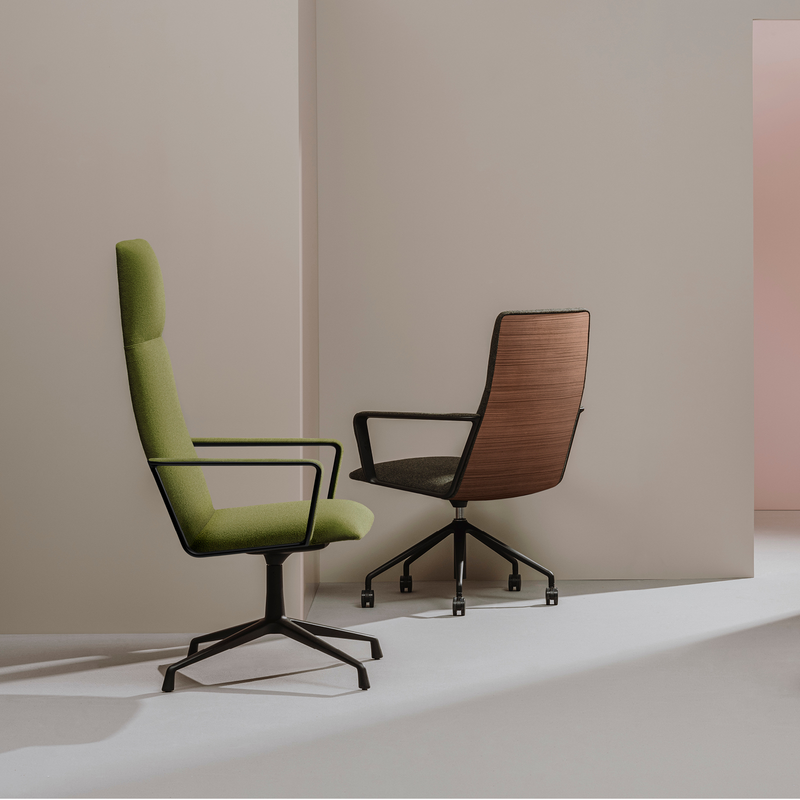 Con una presencia singular, Capri Executive está disponible en diferentes versiones: sin brazos o con brazos tapizados, en tres alturas de respaldo y bases de cuatro aspas o cinco ruedas fabricadas en aluminio 100% reciclable. Opcionalmente, se encuentra con respaldo de nogal, que le dota de elegancia y calidez. Su diseño se adapta a distintos entornos y usos corporativos o ejecutivos, pero también la hacen idónea para espacios más privados.