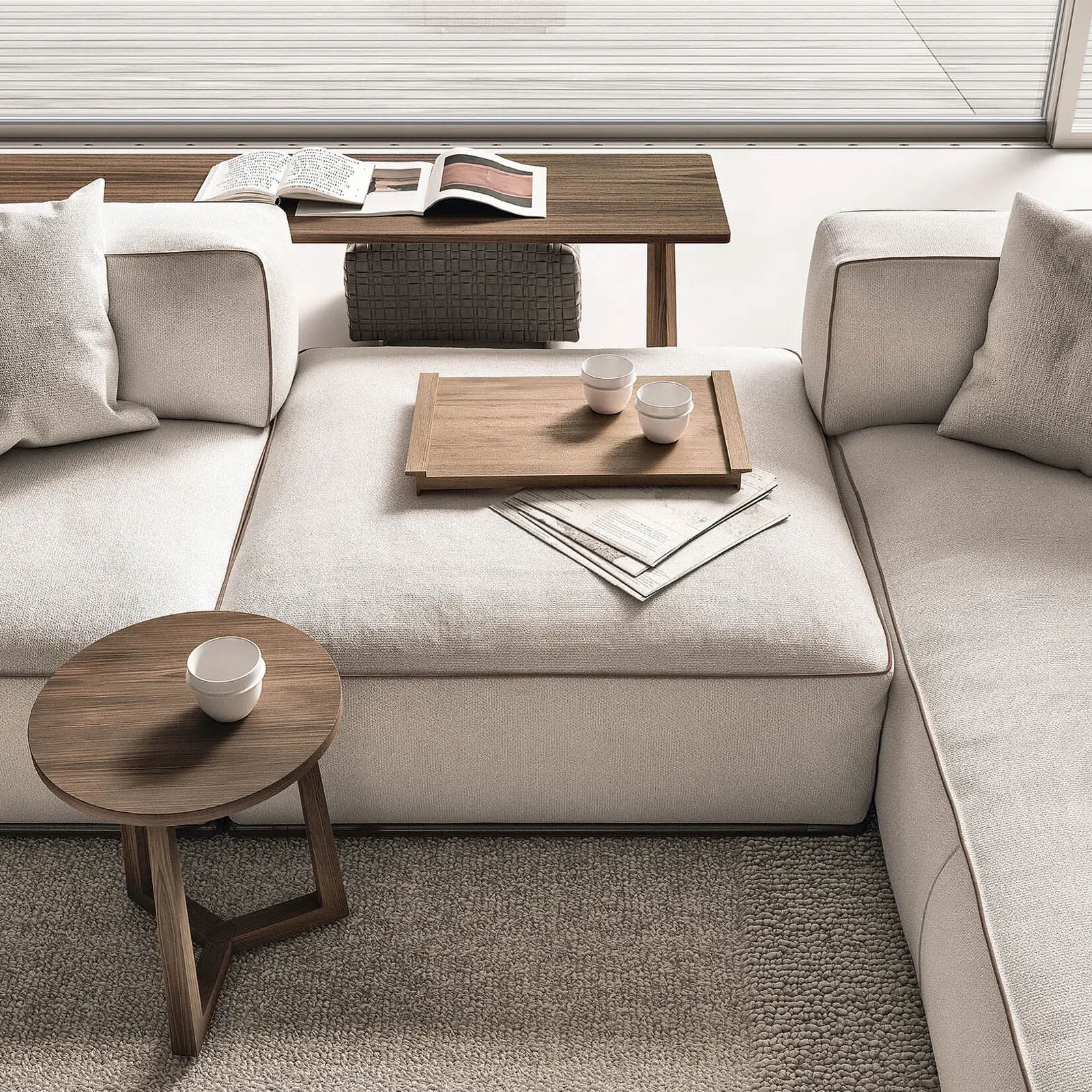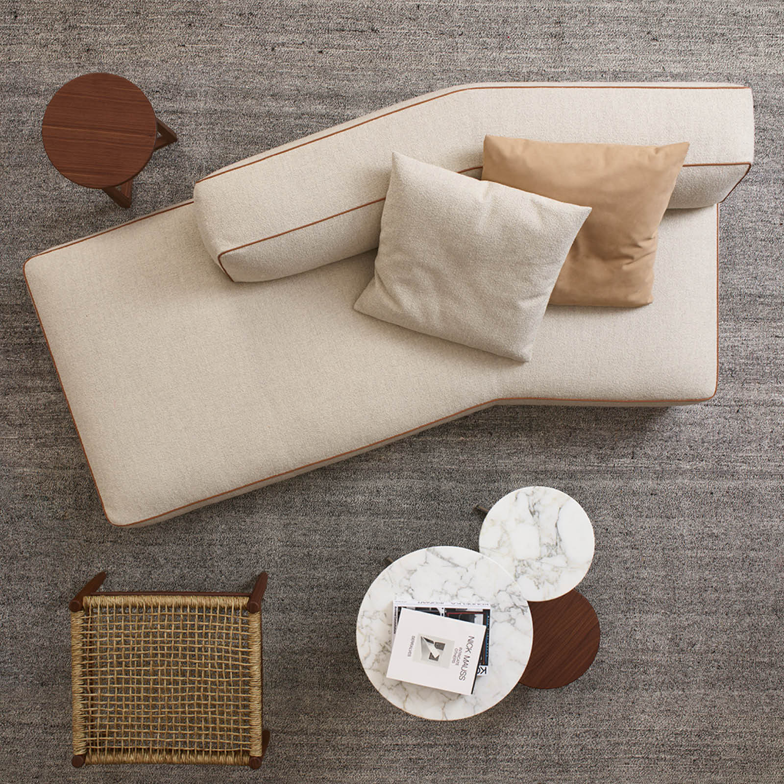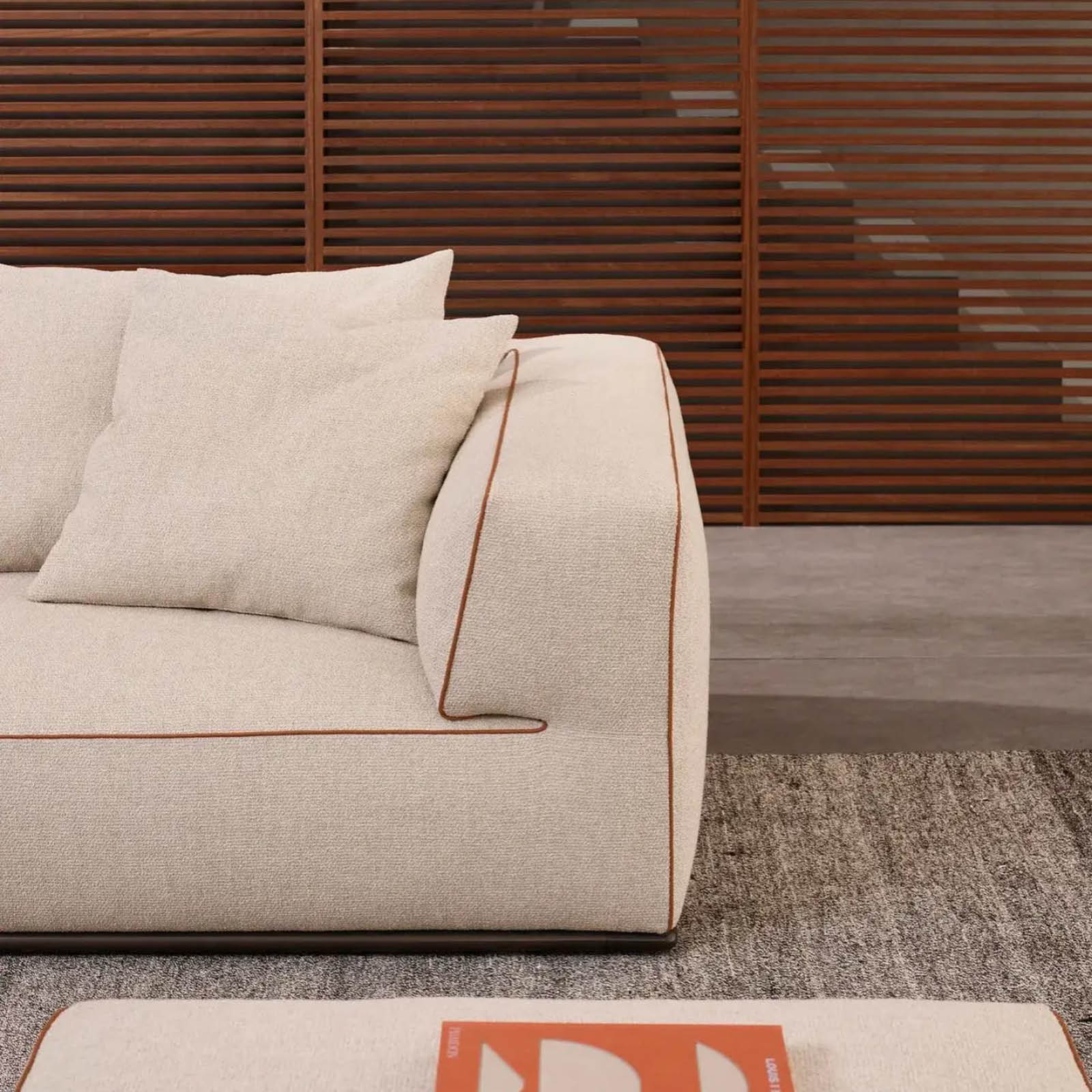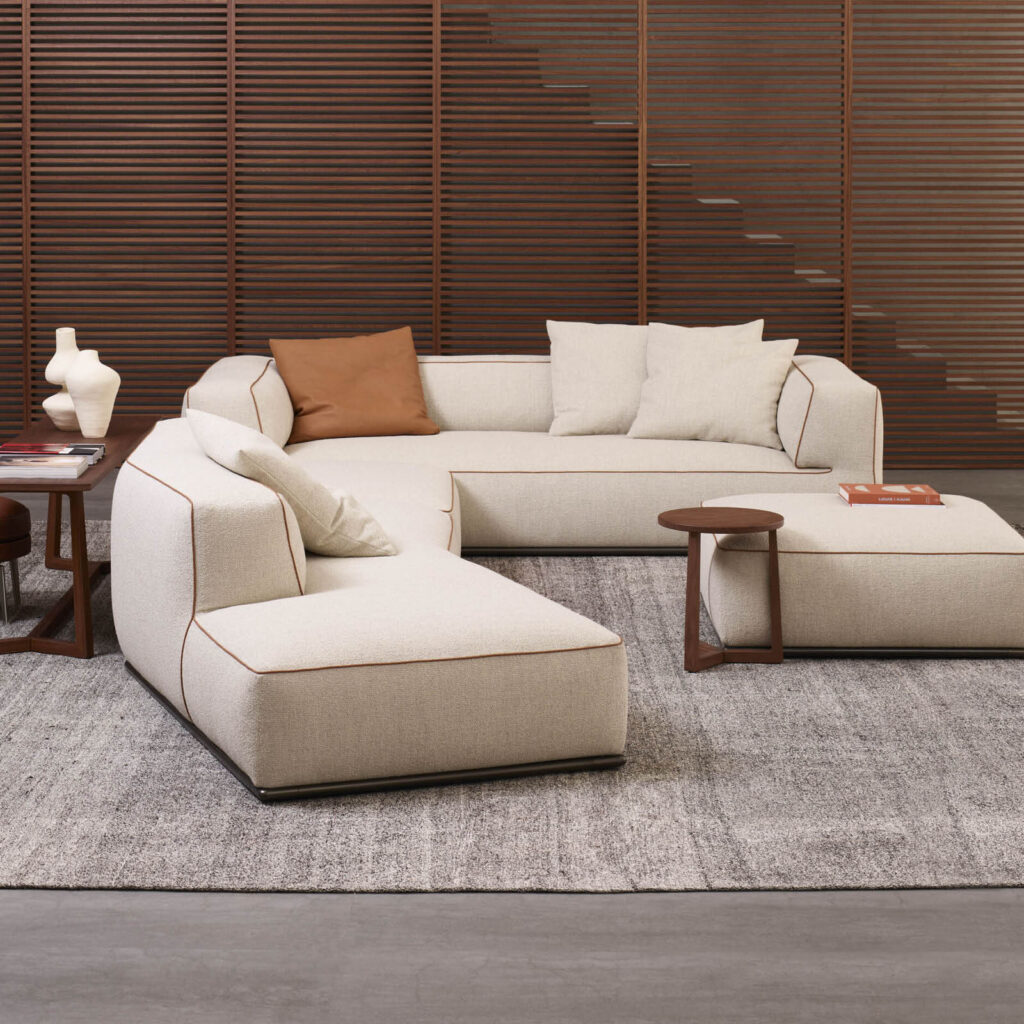 El sofá Perry permite sustituir el apoyabrazos tradicional por un exclusivo elemento contenedor fabricado en cuero, que permite guardar todo tipo de objetos aportando funcionalidad a la colección. La variedad amplia de módulos disponibles, que incluye elementos de asiento lineales, asimétricos, esquineros, pufs, chaiselongues, contenedores de cuero y mesas de centro de madera, permite crear una gran cantidad de configuraciones.