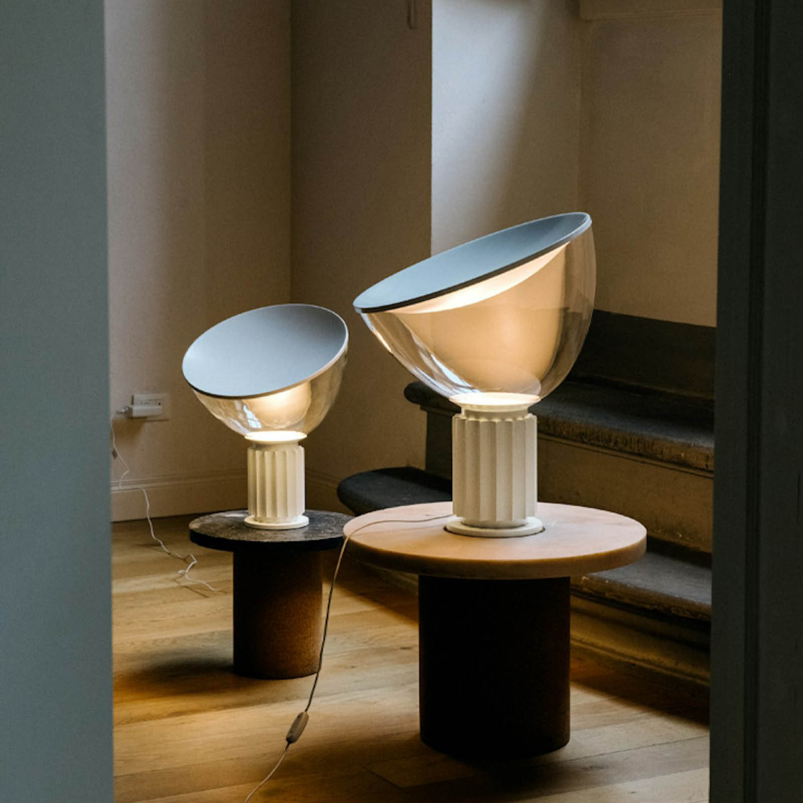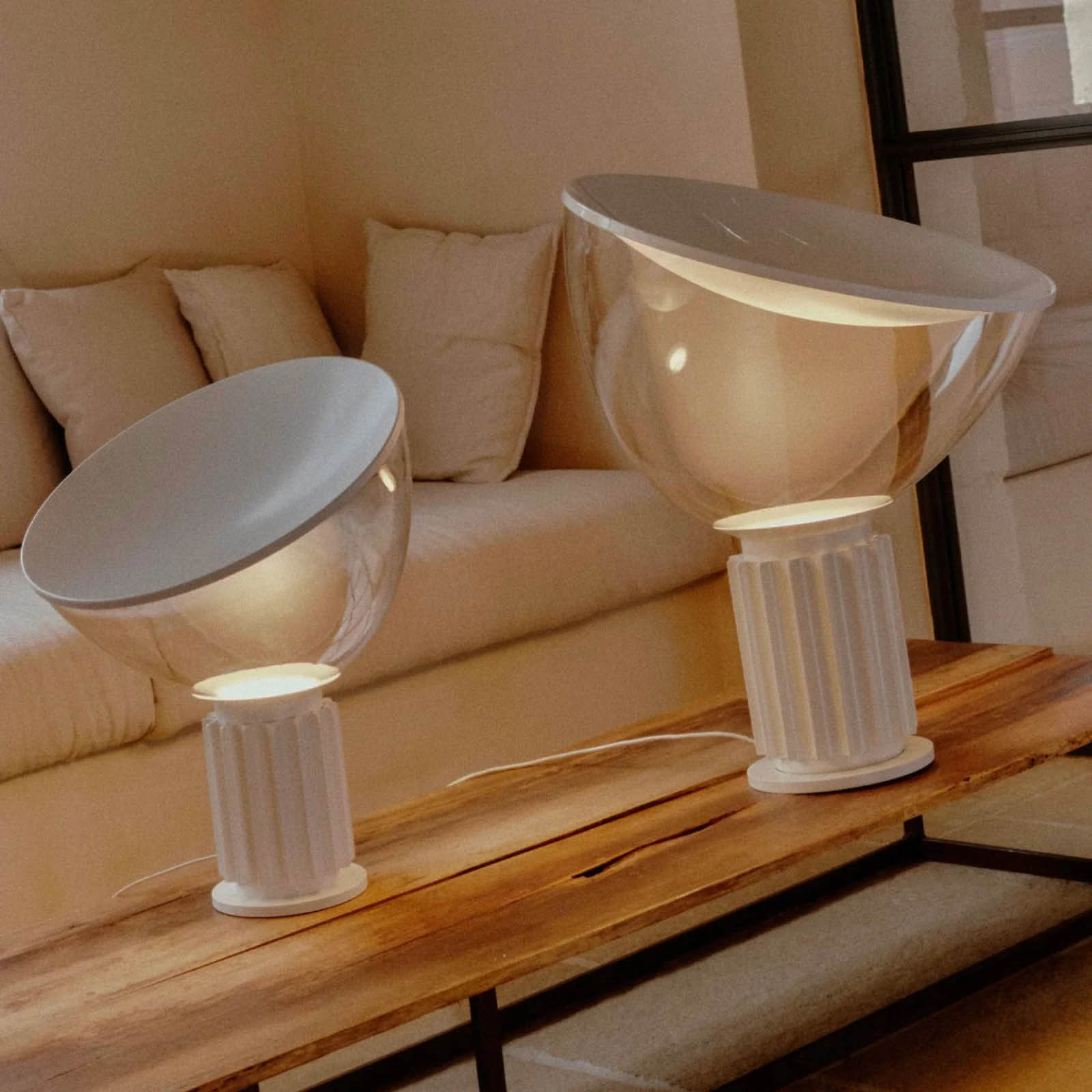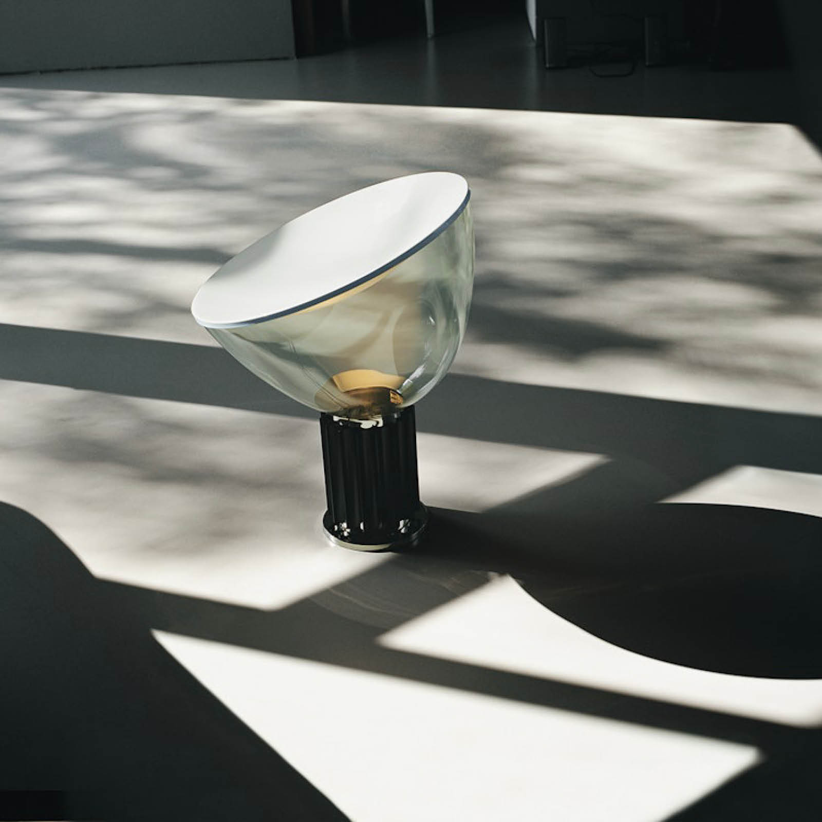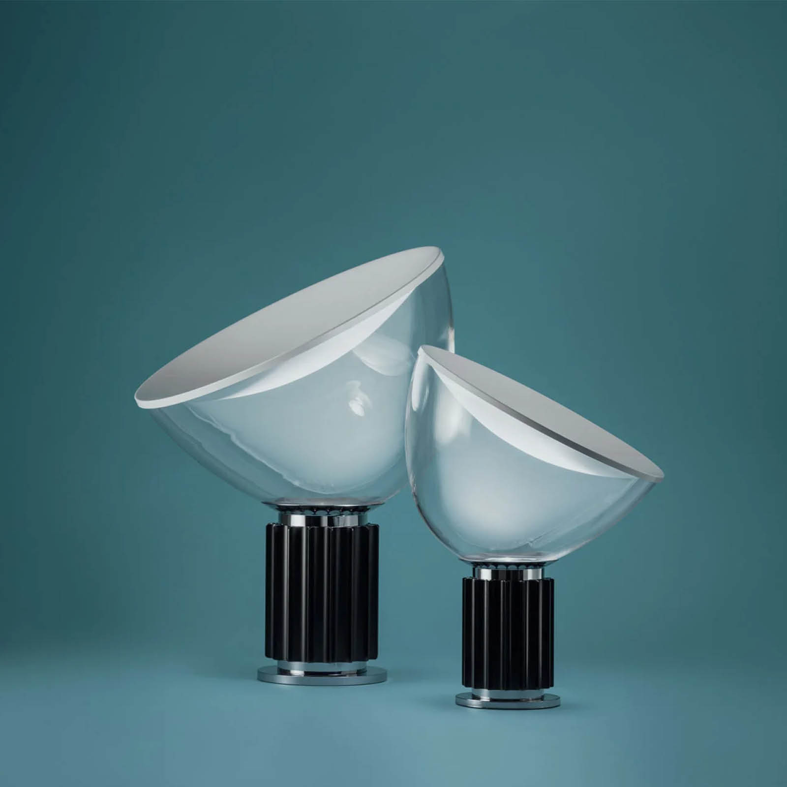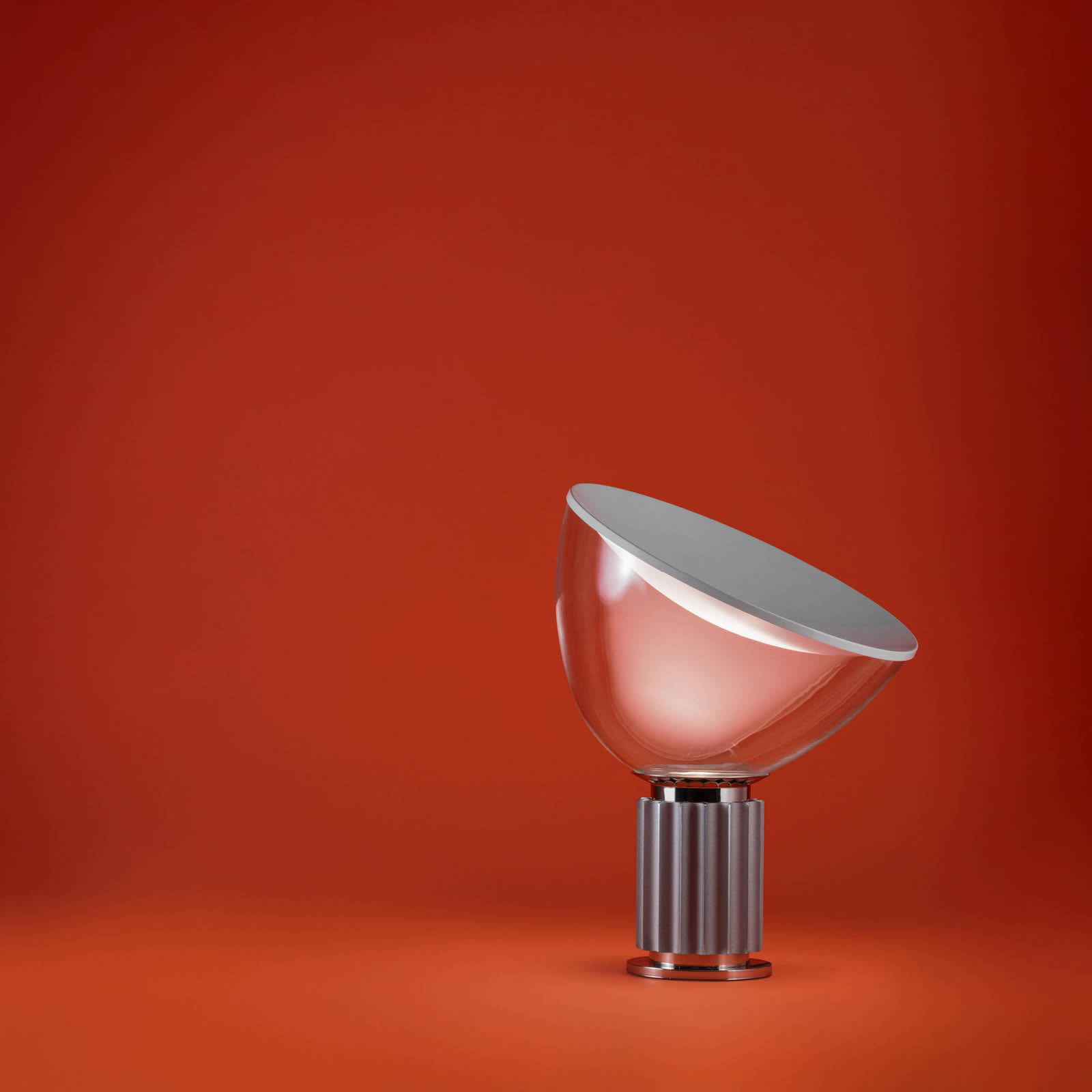 Lámpara de sobremesa. Dispositivo de iluminación de mesa con luz indirecta y reflejada. Reflector de aluminio lacado blanco pulido por fuera y blanco opaco por dentro. Difusor orientable en vidrio transparente soplado. Cuerpo de aluminio extruido lacado en negro, blanco opaco o anodizado natural. Base de ABS+PC niquelada. Cable eléctrico con una longitud útil de 190 cm, con interruptor para regular la intensidad, que garantiza las funciones de encendido y apagado (ON/OFF) y la regulación del flujo luminoso 10-100 %. Suministro eléctrico en clavija con enchufes intercambiables.