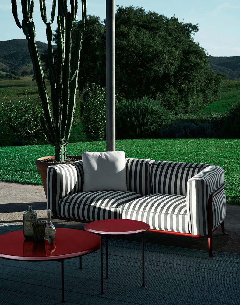 Borea two- and three-seater outdoor sofas feature a tubular metal frame with a seamless, fluid design without joints or interruptions.