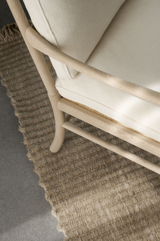 Armchair with slender, minimalist forms. Sophisticated, slightly curved armrests rise to a point before turning downward, its designer. The front and rear legs are made of scrolled wood, a characteristic feature of Wanscher, its designer. Front and back legs are made of roundwood, with the back legs curving gently outward for greater stability and a more refined result. Seat and backrest with cushions upholstered in fabric or leather of your choice.