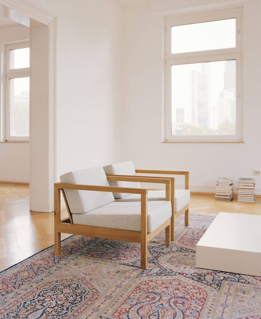 Armchair with a solid wood frame. With clean, straight lines, it is a modern take on the classic smoking chair. The seat, featuring elastic webbing and high-density foam, offers exceptional comfort.