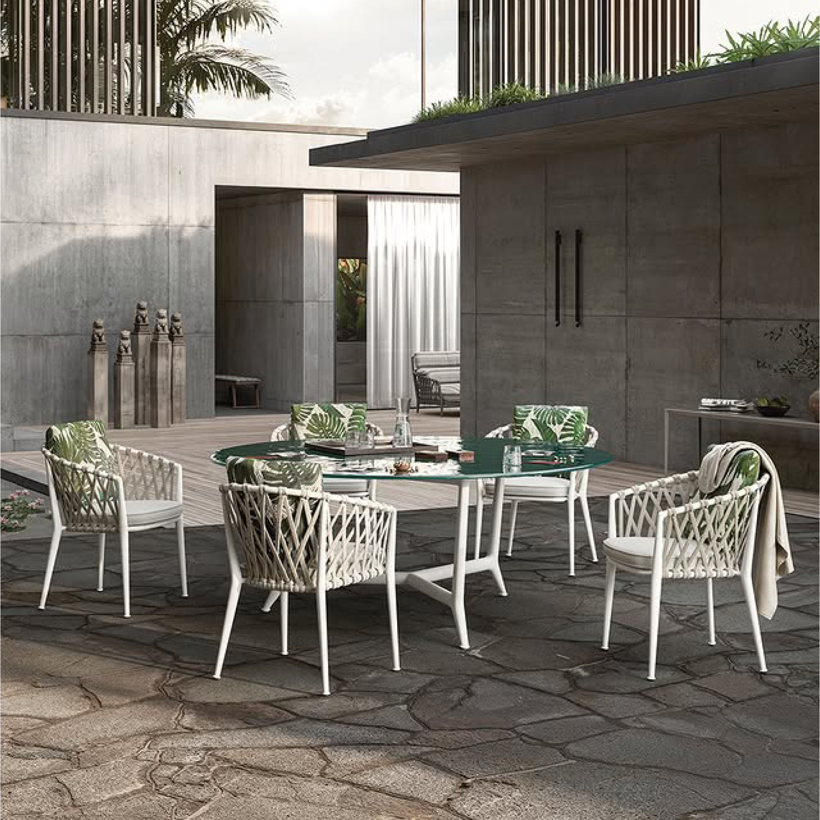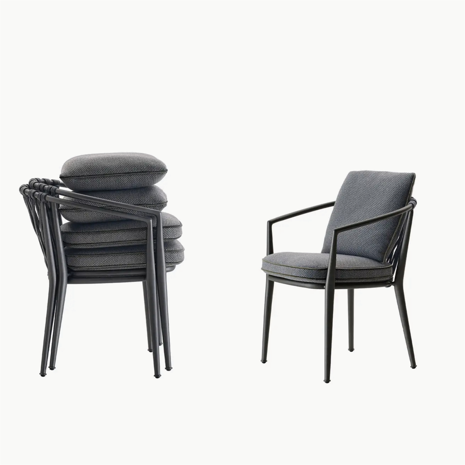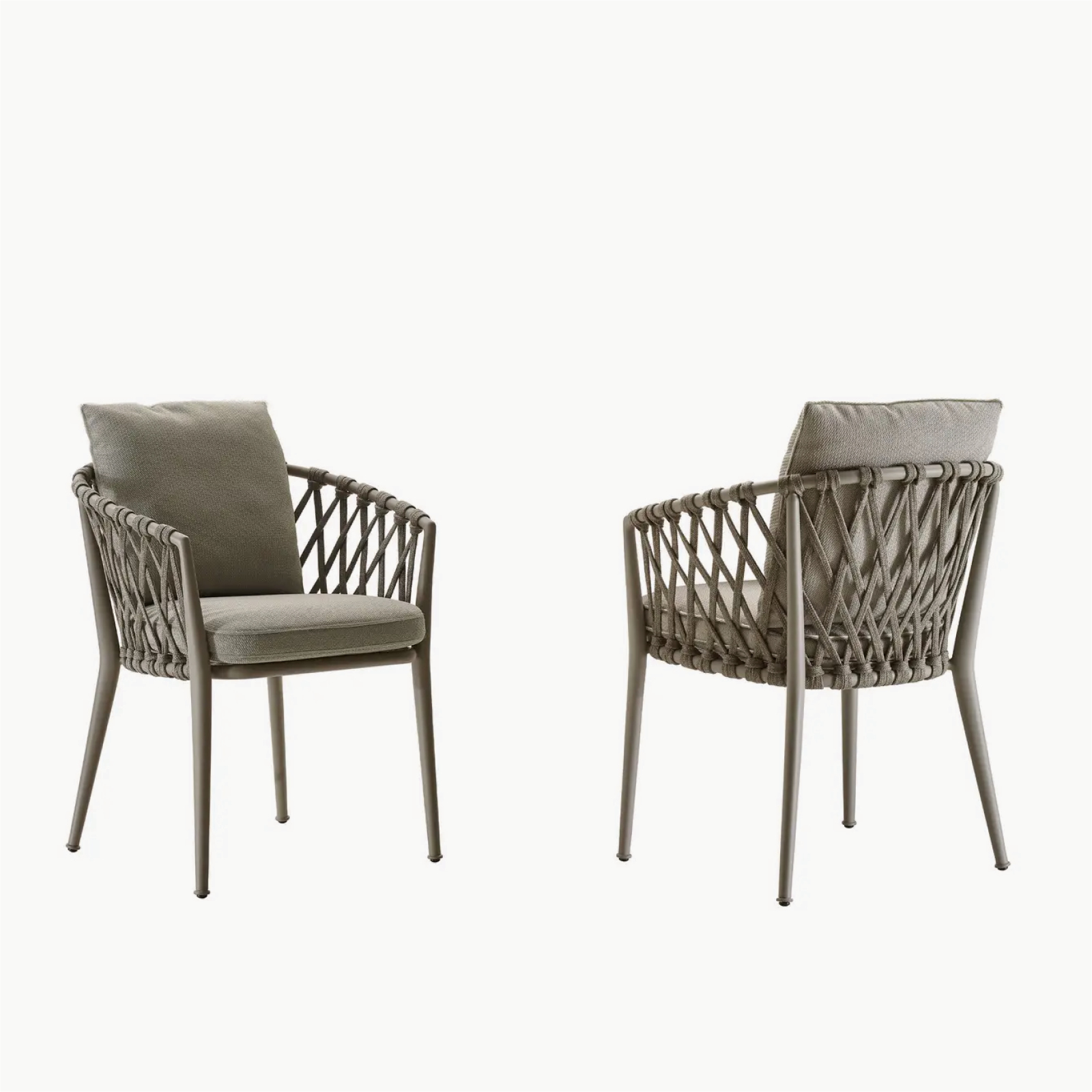 Designed with a technological blend of extruded and die-cast aluminium elements, the Erica chairs are offered in different versions, including a stackable one, and with two types of interlacing. The refined colour combinations include a wide range of finishes for the frames to match the different colours of the interlacing, made of polypropylene ribbons. The seat cushions, embellished with a decorative profile, guarantee comfortable relaxation. The lightness and the design make Erica ideal for both public and residential settings.