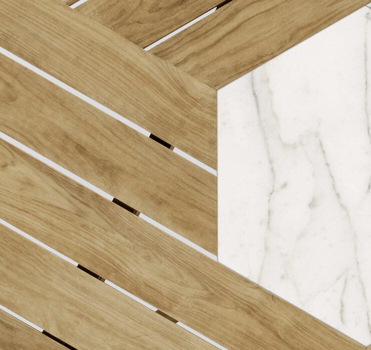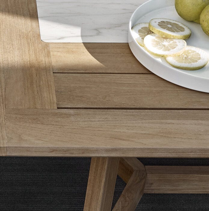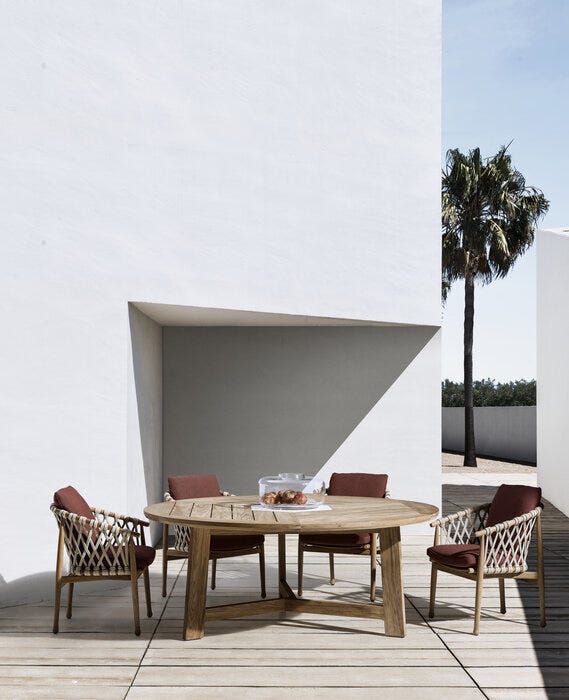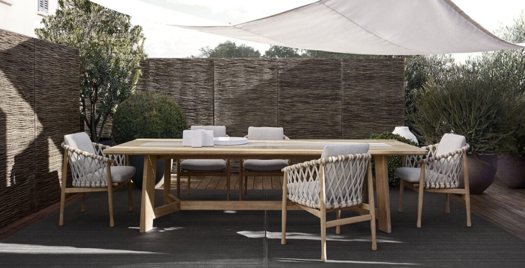 Ginestra is a collection of large outdoor dining tables in rectangular and rounded shapes. Made in solid natural wood, the top also has a central intersection made of porcelain stoneware reminiscent of Calacatta white marble.