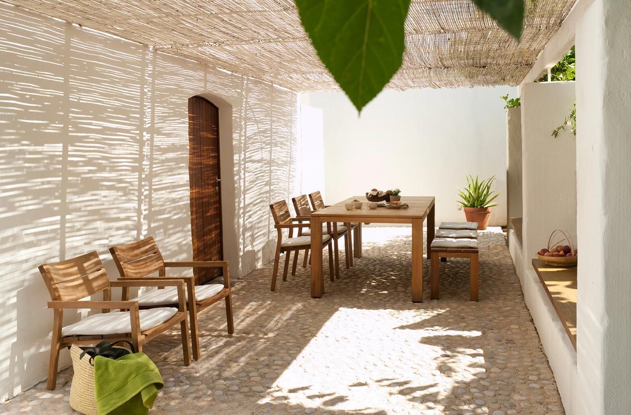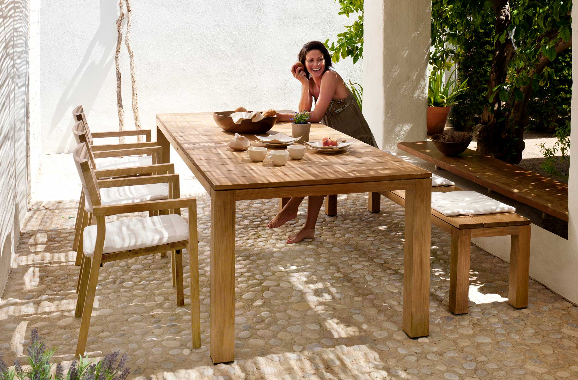 This bench is a more relaxed alternative to chairs when sitting around the table and also a perfect piece for the garden. Thick slats and an elementary design reveal the most rugged and modern aspect of teak wood.