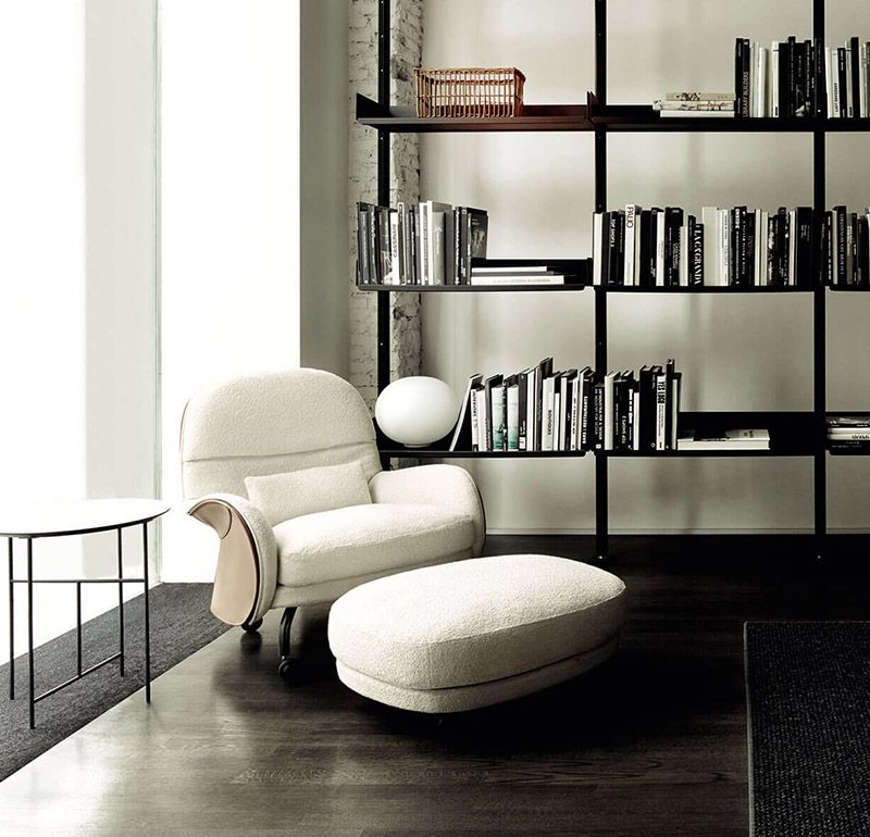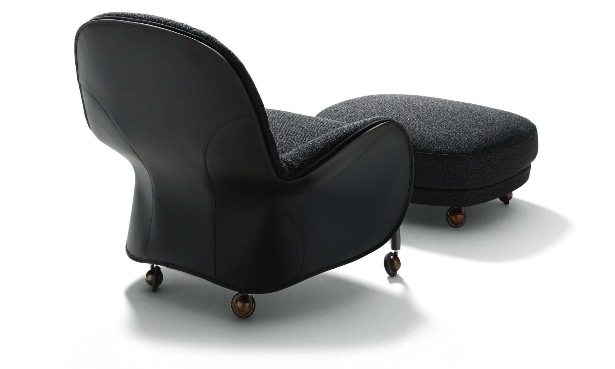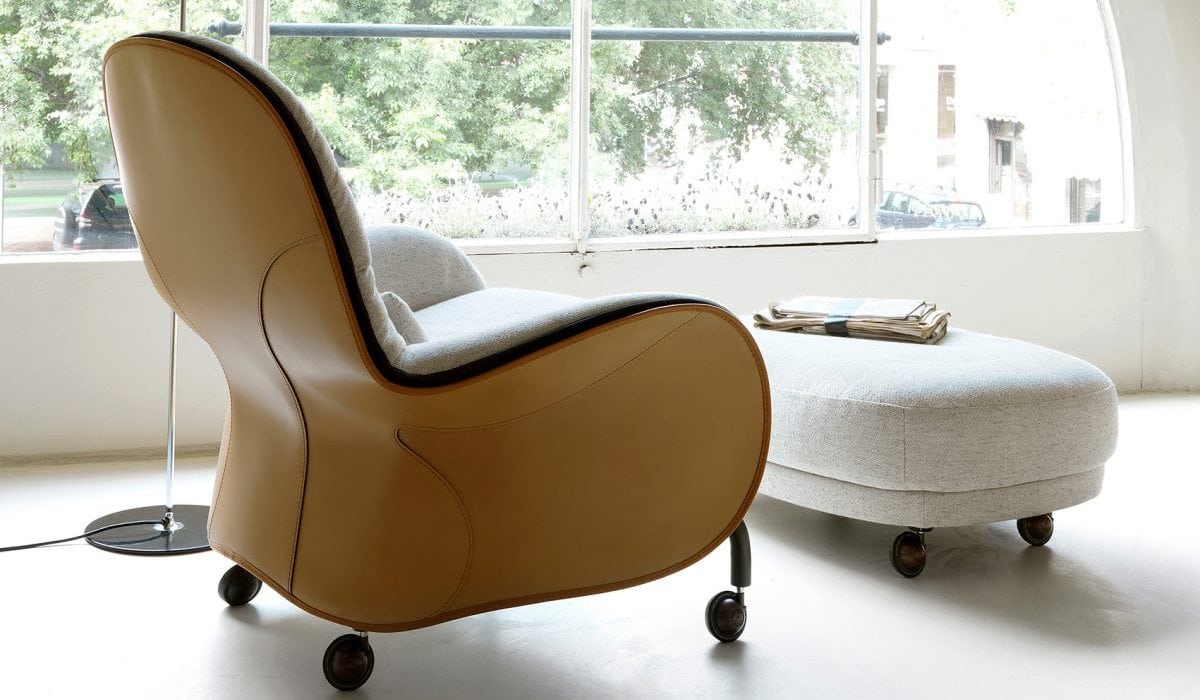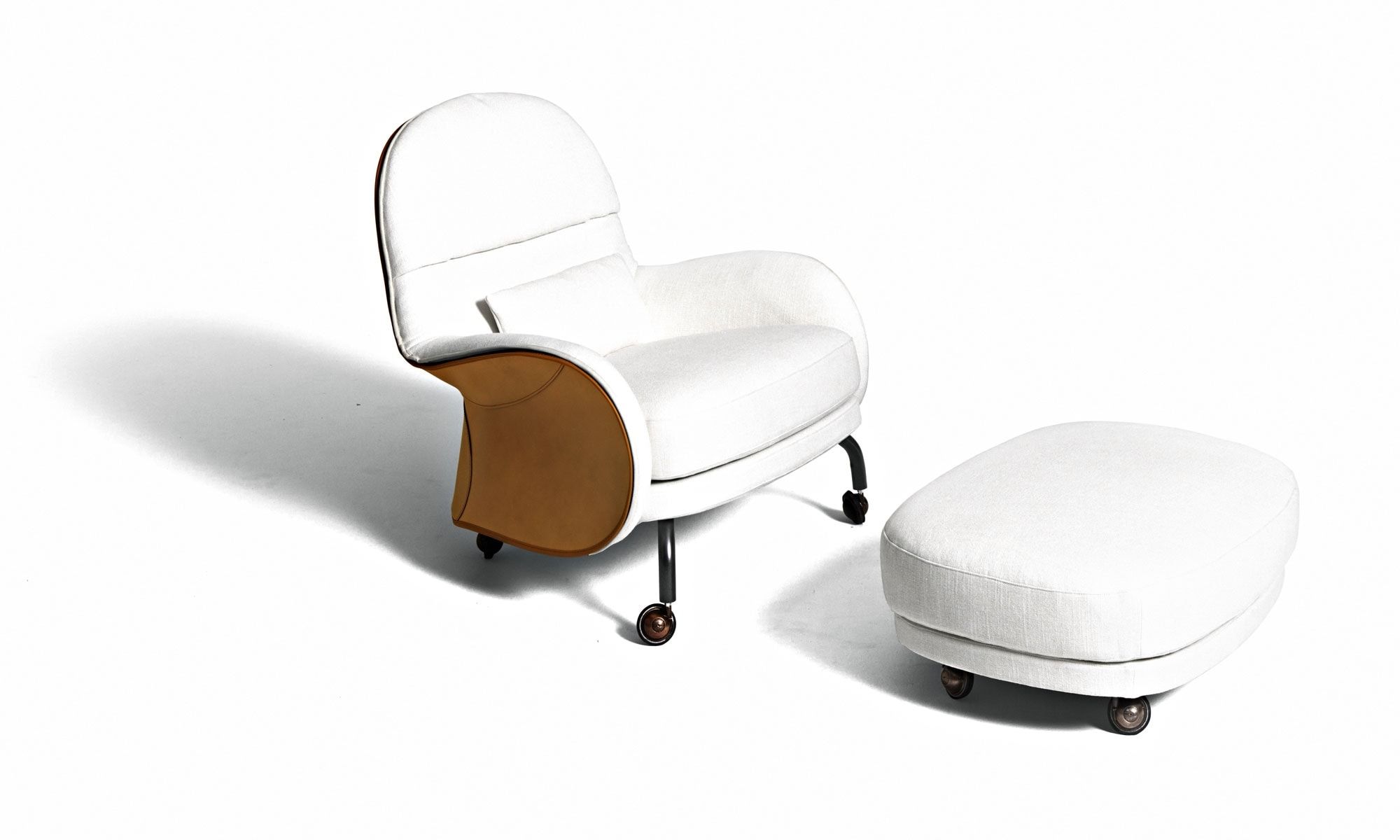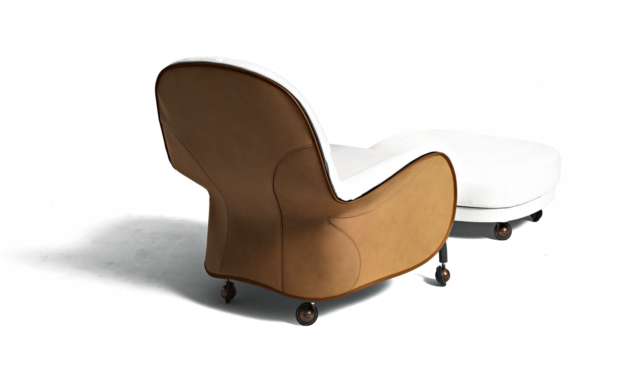 Armchair inspired by a saddle. Leather structure, backrest filled with polyurethane foam of different densities and seat filled with goose feathers with polyurethane foam insert. Completely removable covers.