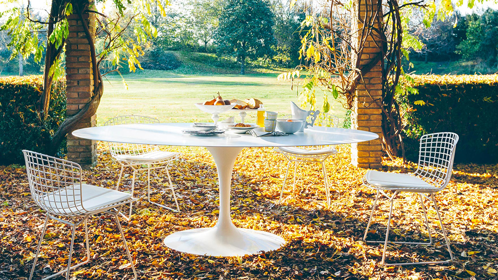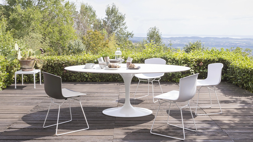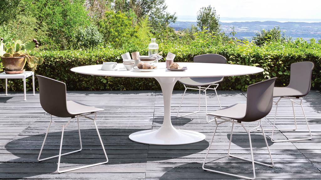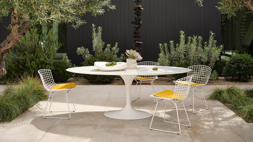With the Pedestal collection, Eero Saarinen resolved the “ugly, confusing and disturbing world” beneath tables and chairs. The collection is a defining achievement of modern design. All-weather hardware and materials prepare the classic Saarinen table for outdoor living: a modern focal point for any outdoor setting.