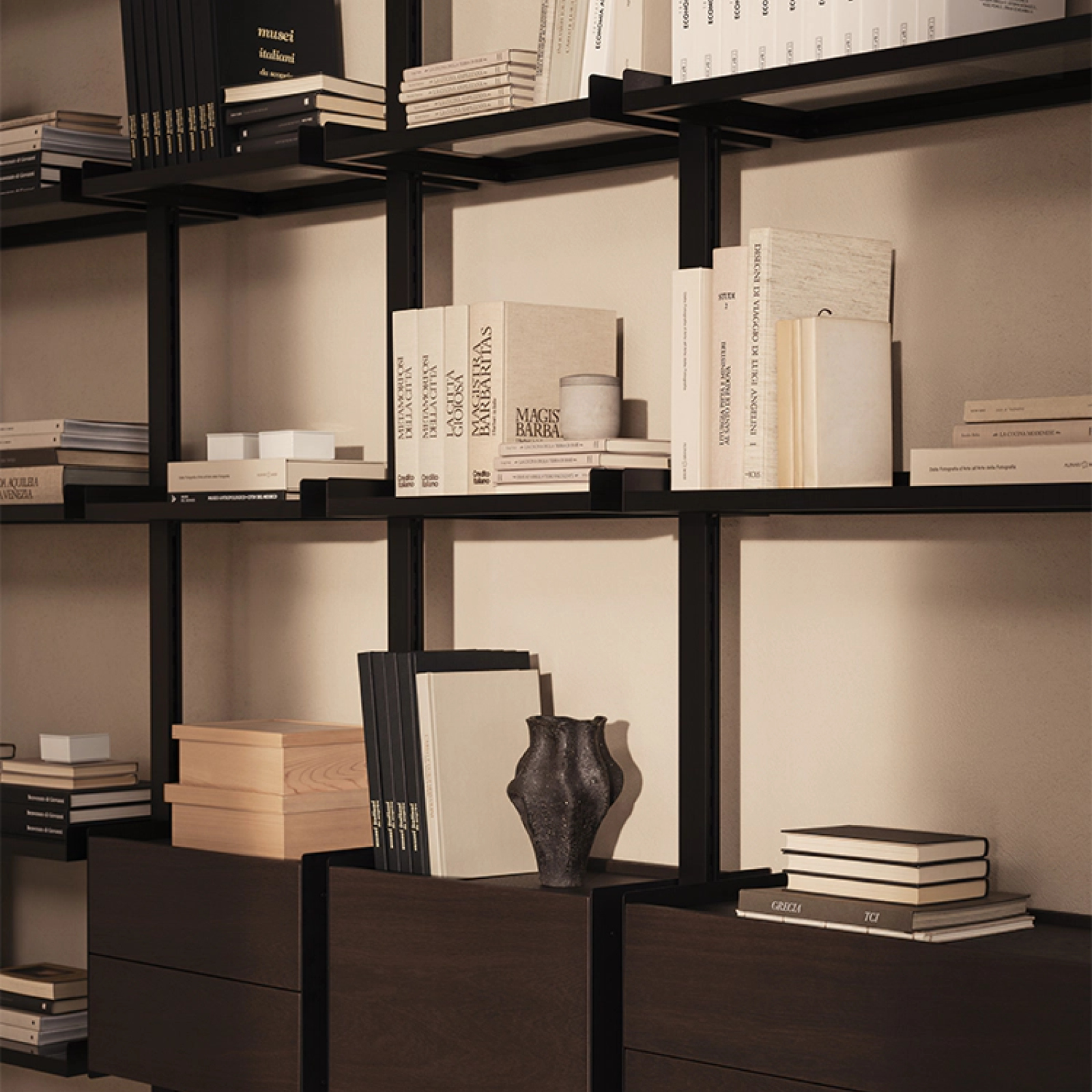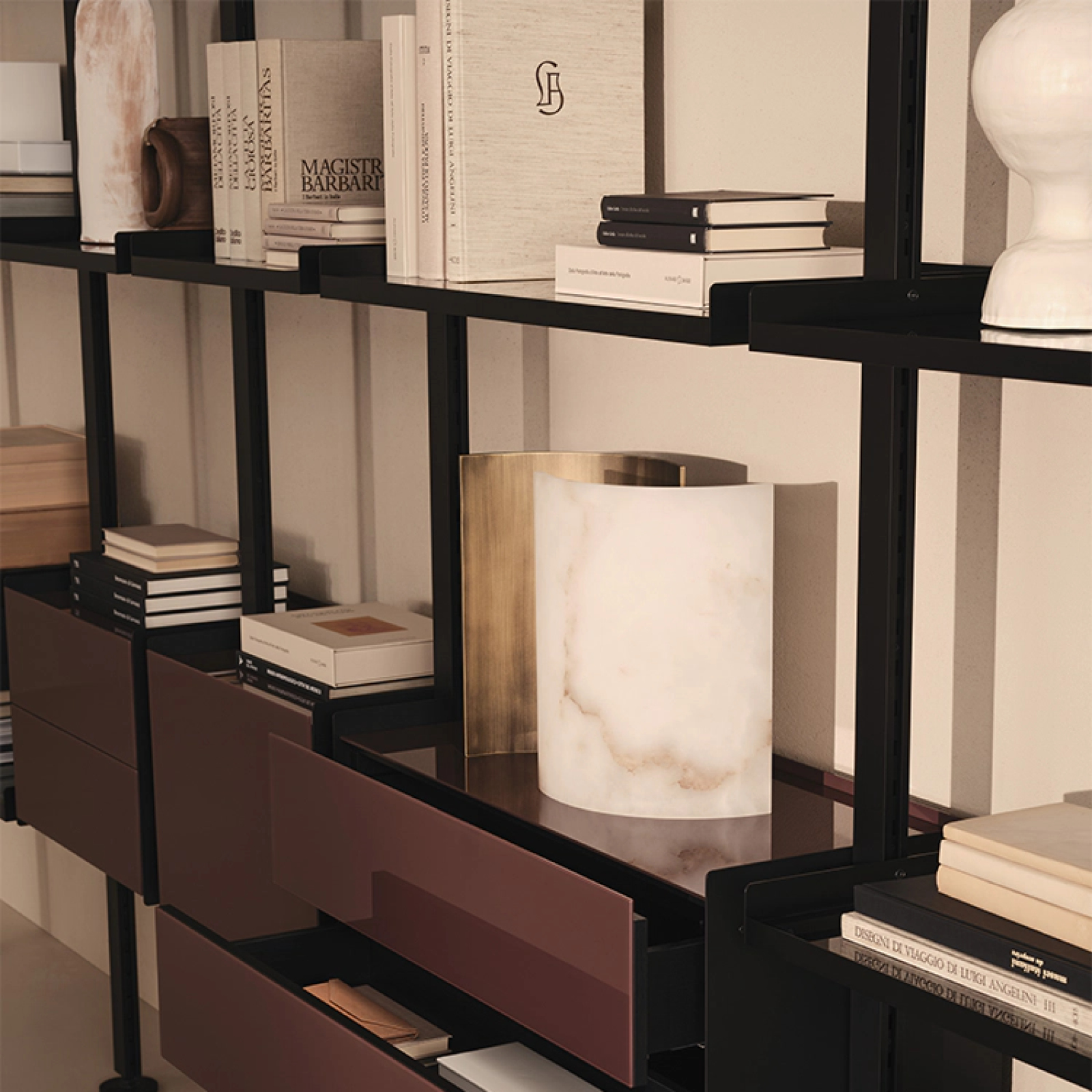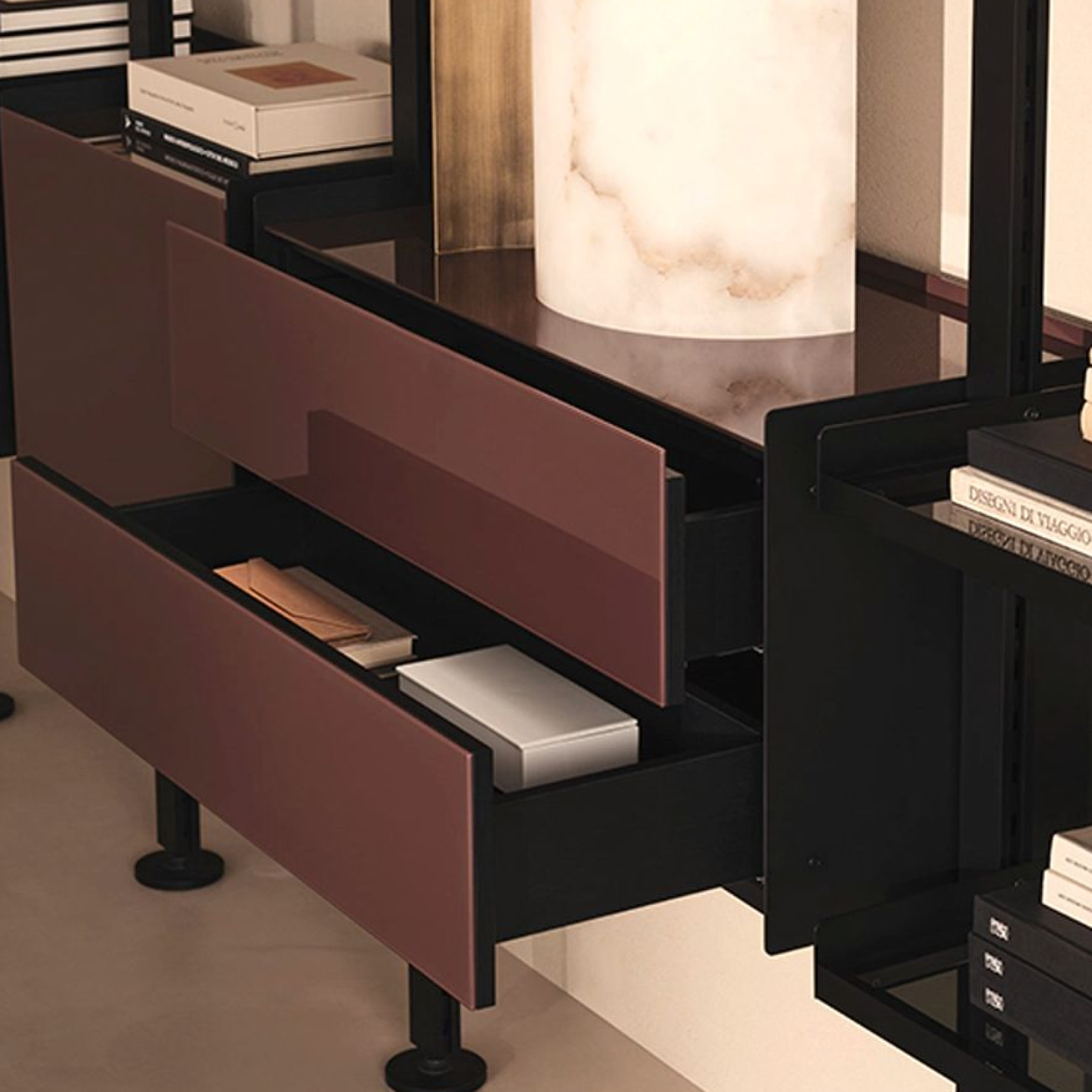 The evolution of functionality. SaintPaul traces out the contours of the Wigmore Shelving System, enriching it with new features and finishes. Three different sizes for the tops made of anodised extruded aluminium and the possibility for pairing with clear glass, Dark Grey, Metropolitan, Garage, Rovere Affumicato. The cabinet modules are available in the two-drawer pull-out version or with flap door in the finishes Laccato Lucido, Rovere Affumicato, Vetro Nero, Rosso Petra.