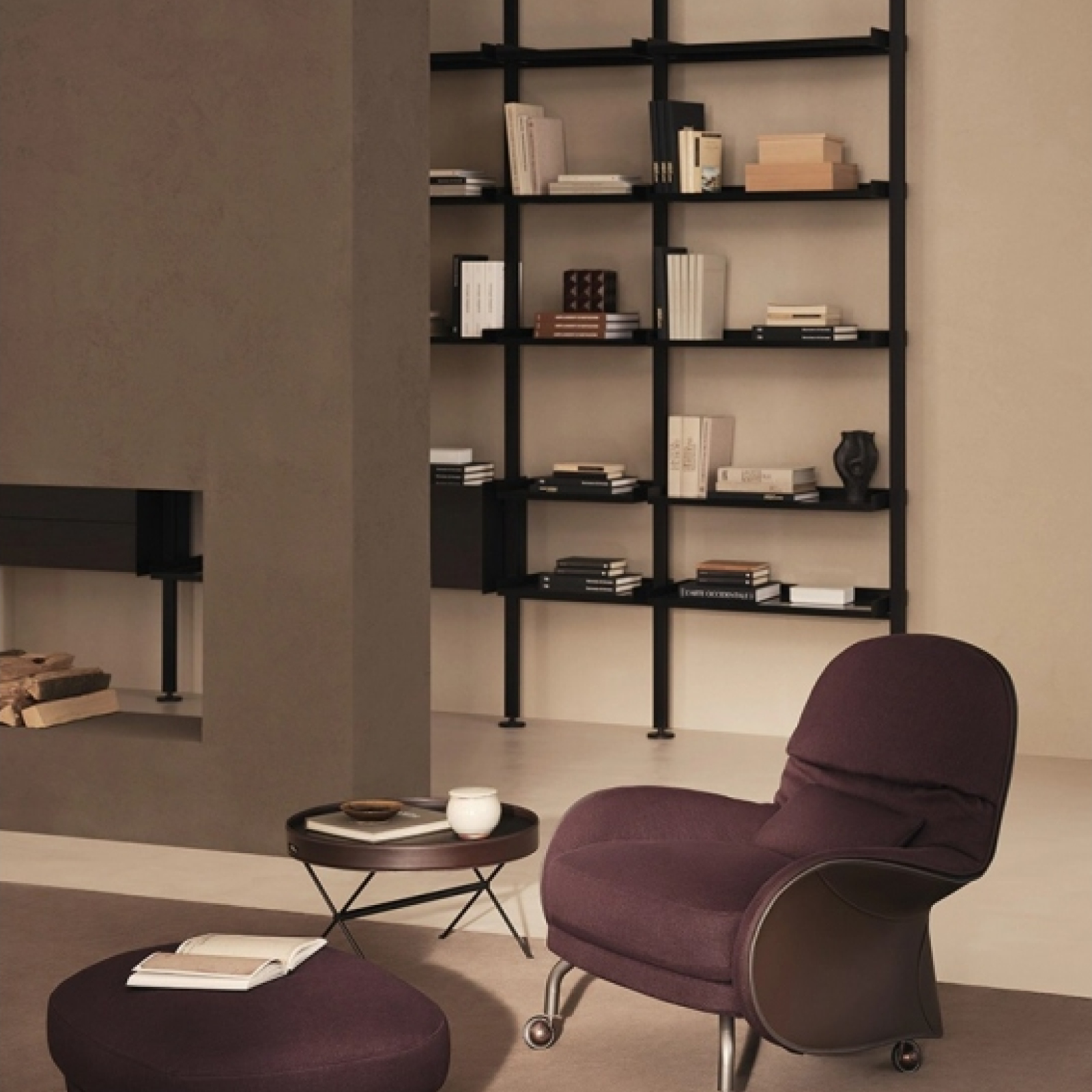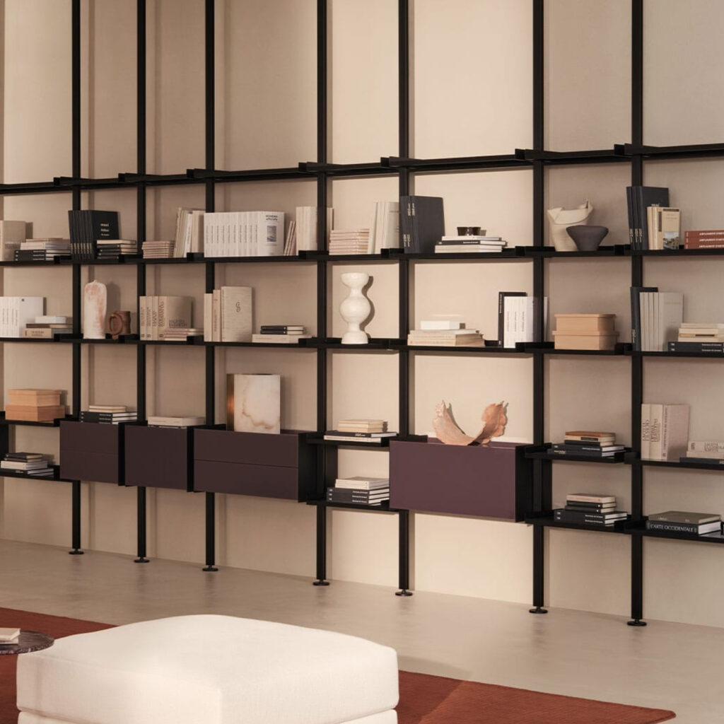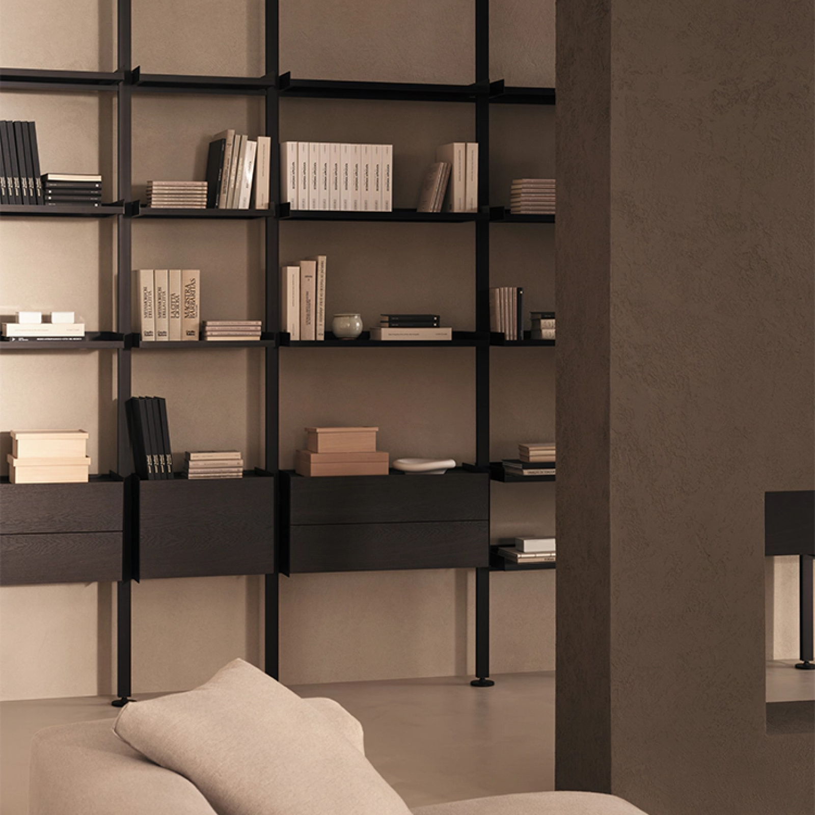 The evolution of functionality. SaintPaul traces out the contours of the Wigmore Shelving System, enriching it with new features and finishes. Three different sizes for the tops made of anodised extruded aluminium and the possibility for pairing with clear glass, Dark Grey, Metropolitan, Garage, Rovere Affumicato. The cabinet modules are available in the two-drawer pull-out version or with flap door in the finishes Laccato Lucido, Rovere Affumicato, Vetro Nero, Rosso Petra.