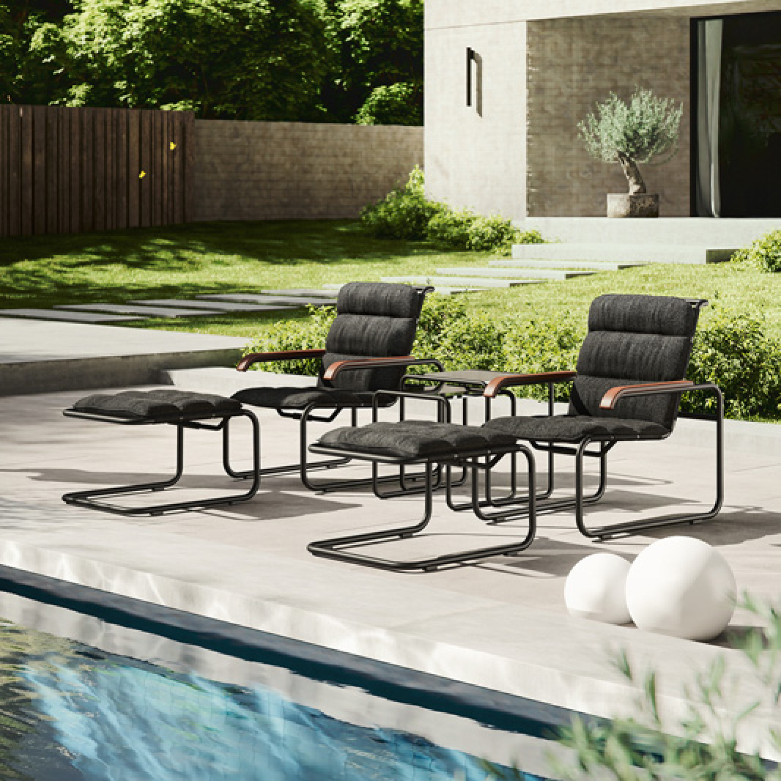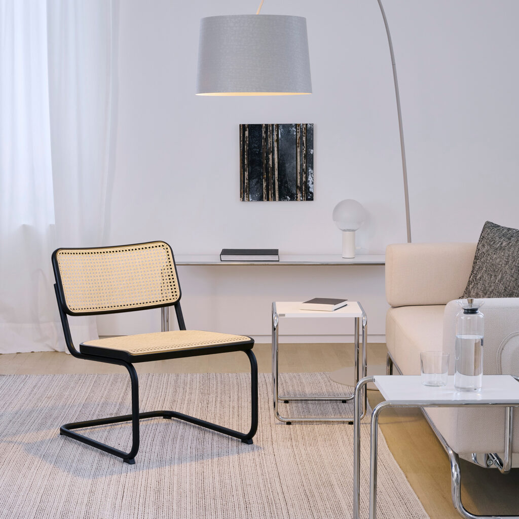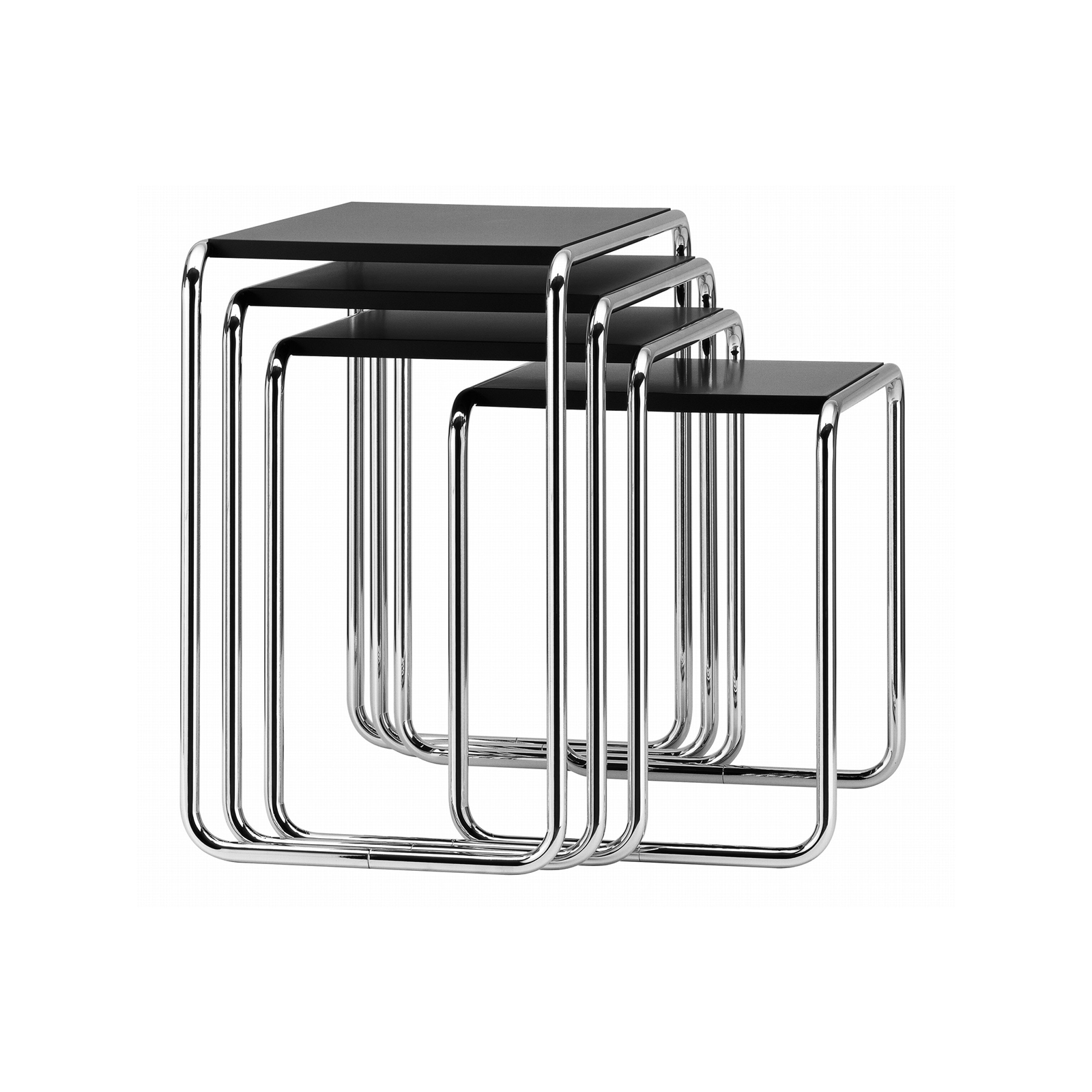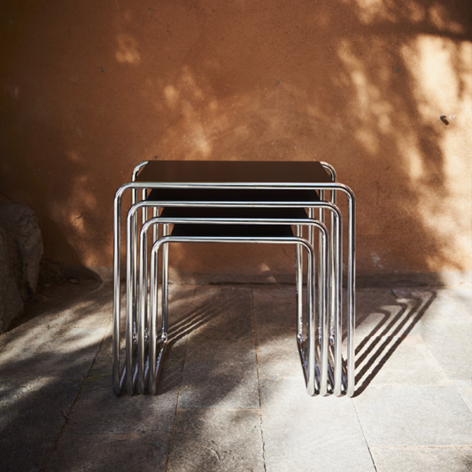 The bentwood technique perfected by Michael Thonet was a source of inspiration for Marcel Breuer’s experiments with bent tubular steel. The set of four B 9 nesting tables was developed from this idea. The small tables can be used in many ways: as side tables in seating groups, as practical storage surfaces or as the perfect place for a vase of fresh flowers. After use, the tables can easily be placed under each other to save space. The special feature of this range is its functional simplicity: the table set consists solely of chrome-plated, curved tubular steel and rectangular panels.