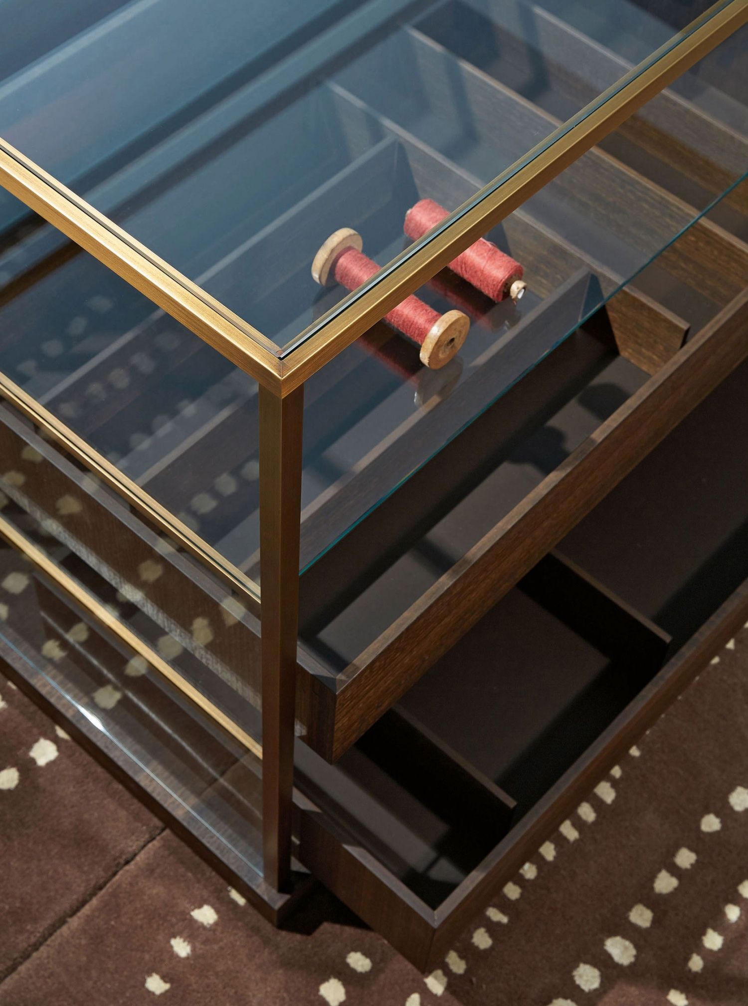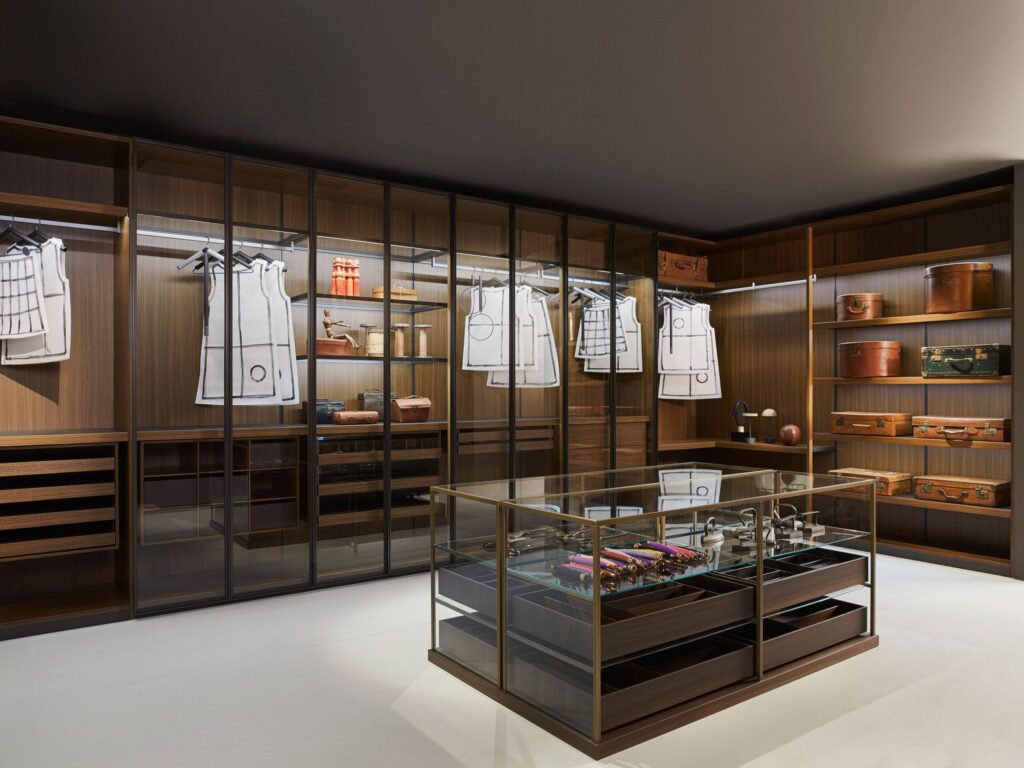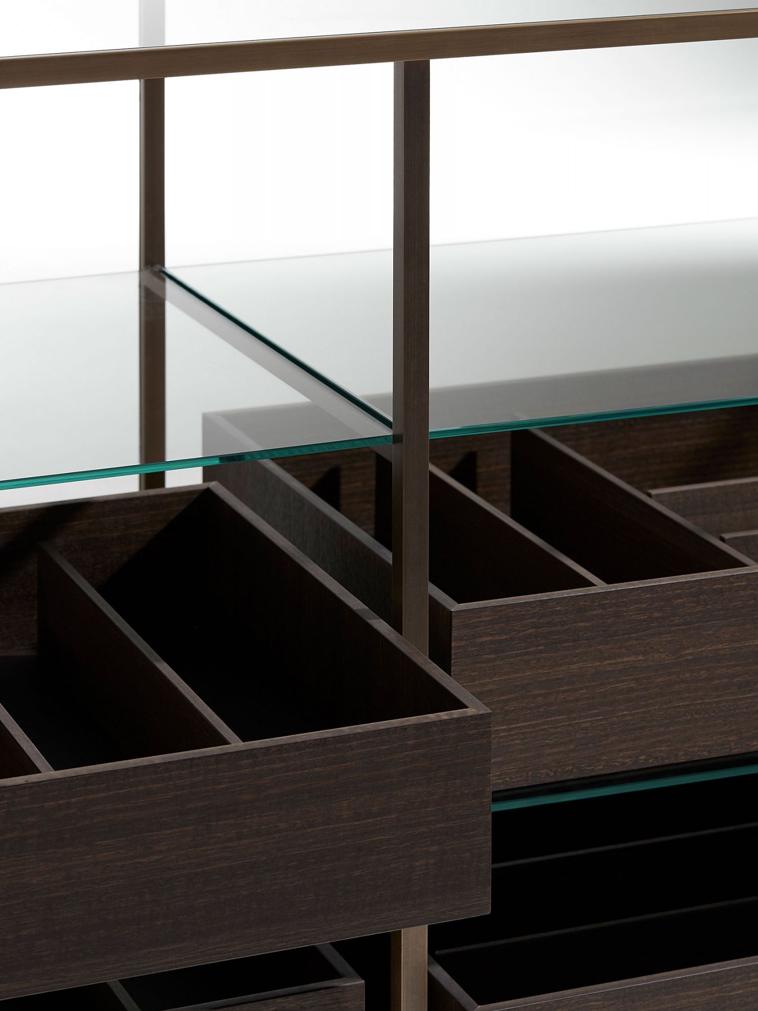 Acquario es la cajonera central, perfecta en el centro de una habitación, realizada en cristal transparente con perfiles de latón bruñido. Se divide en 3 estantes y está equipado con bandejas de madera para dejar el contenido a la vista, almacenarlo en perfecto orden y luego extraerlo con facilidad.  Los cajones de eucalipto tienen el fondo de cuero.