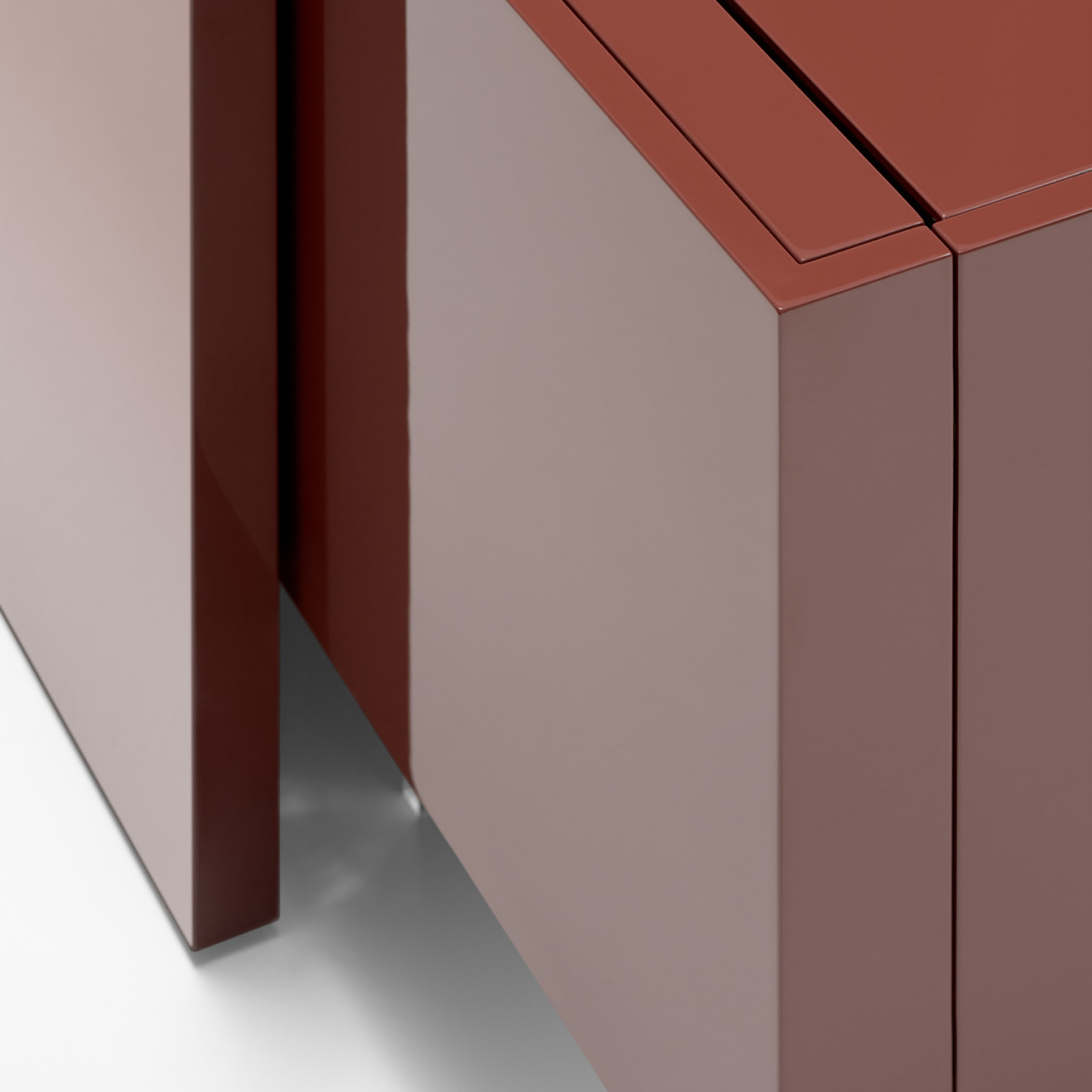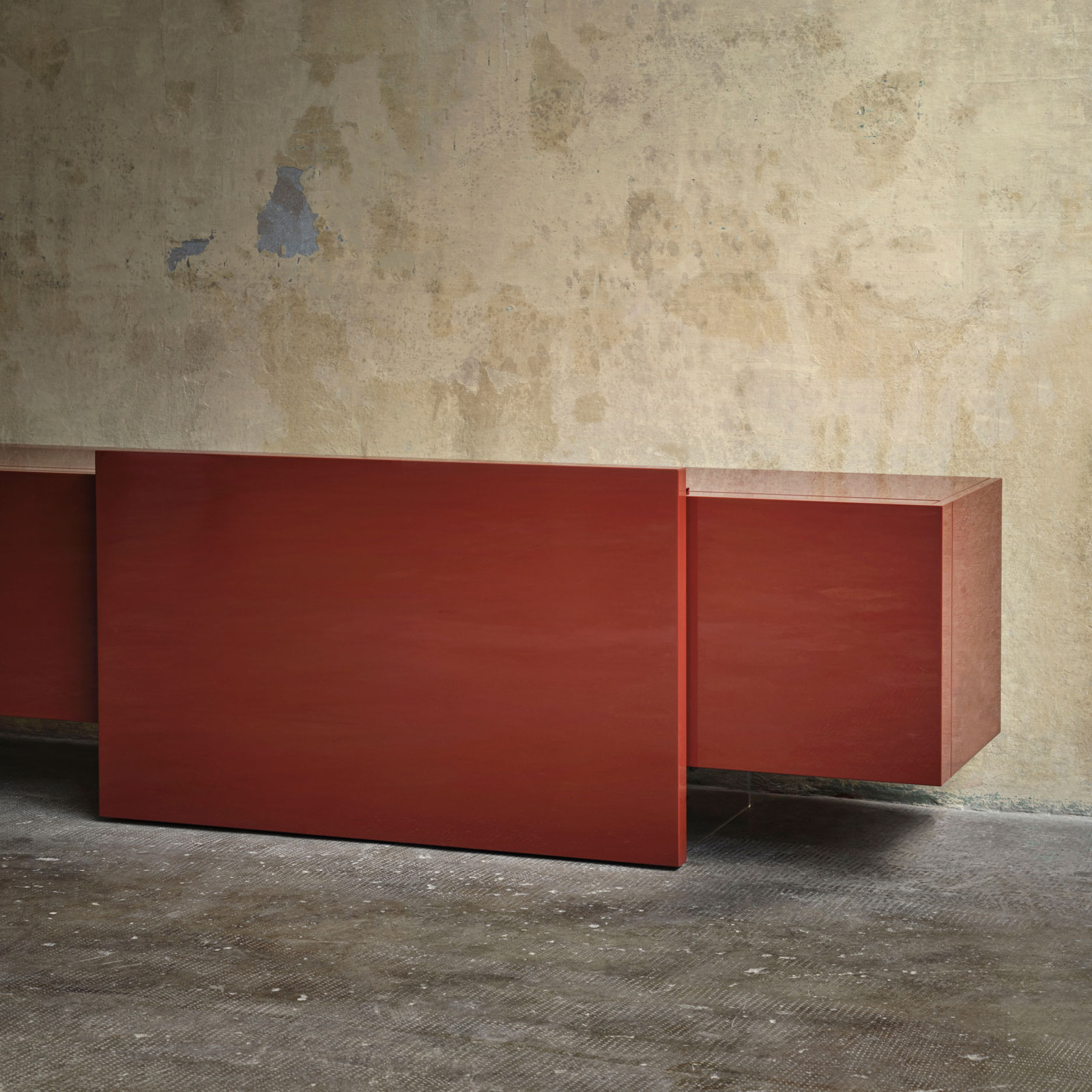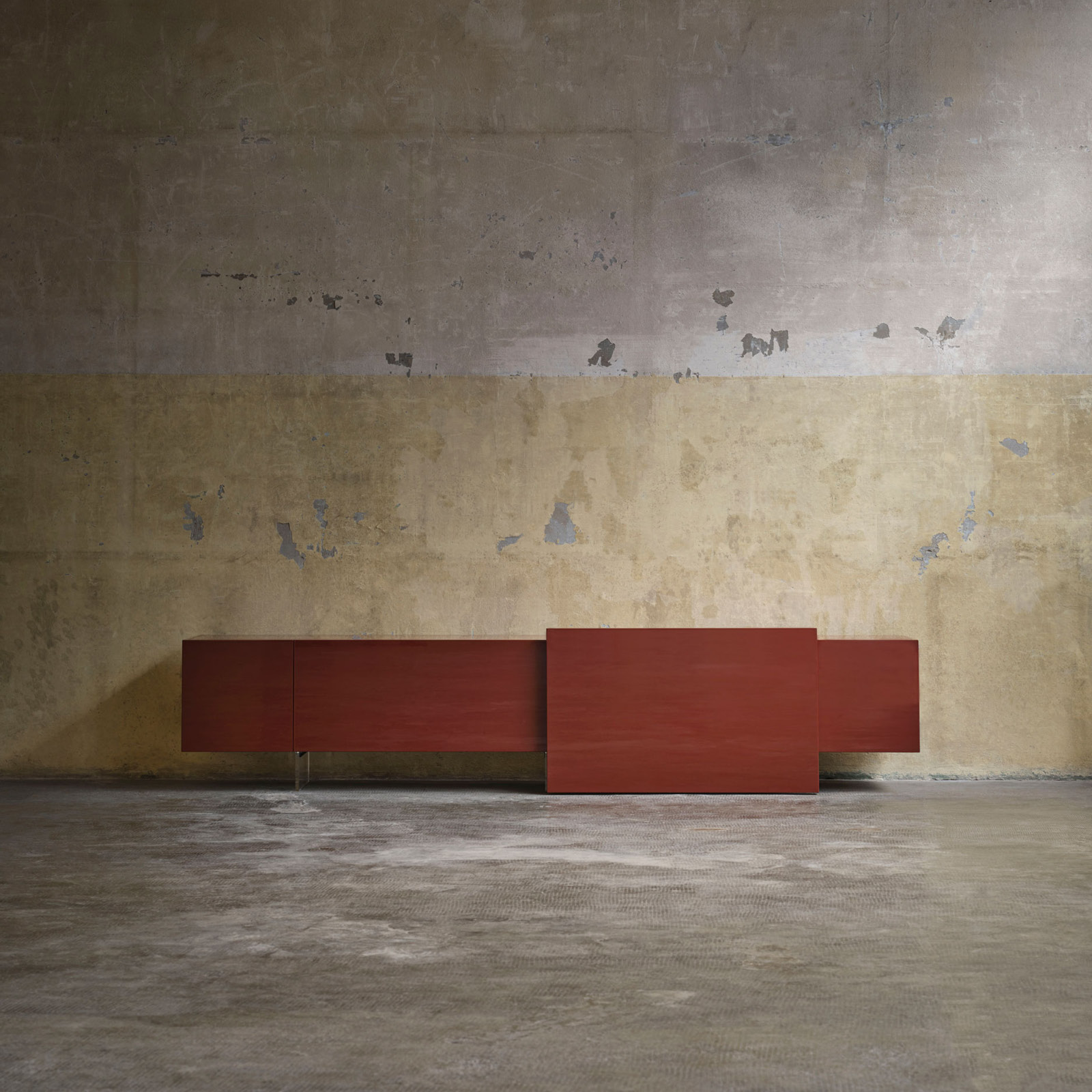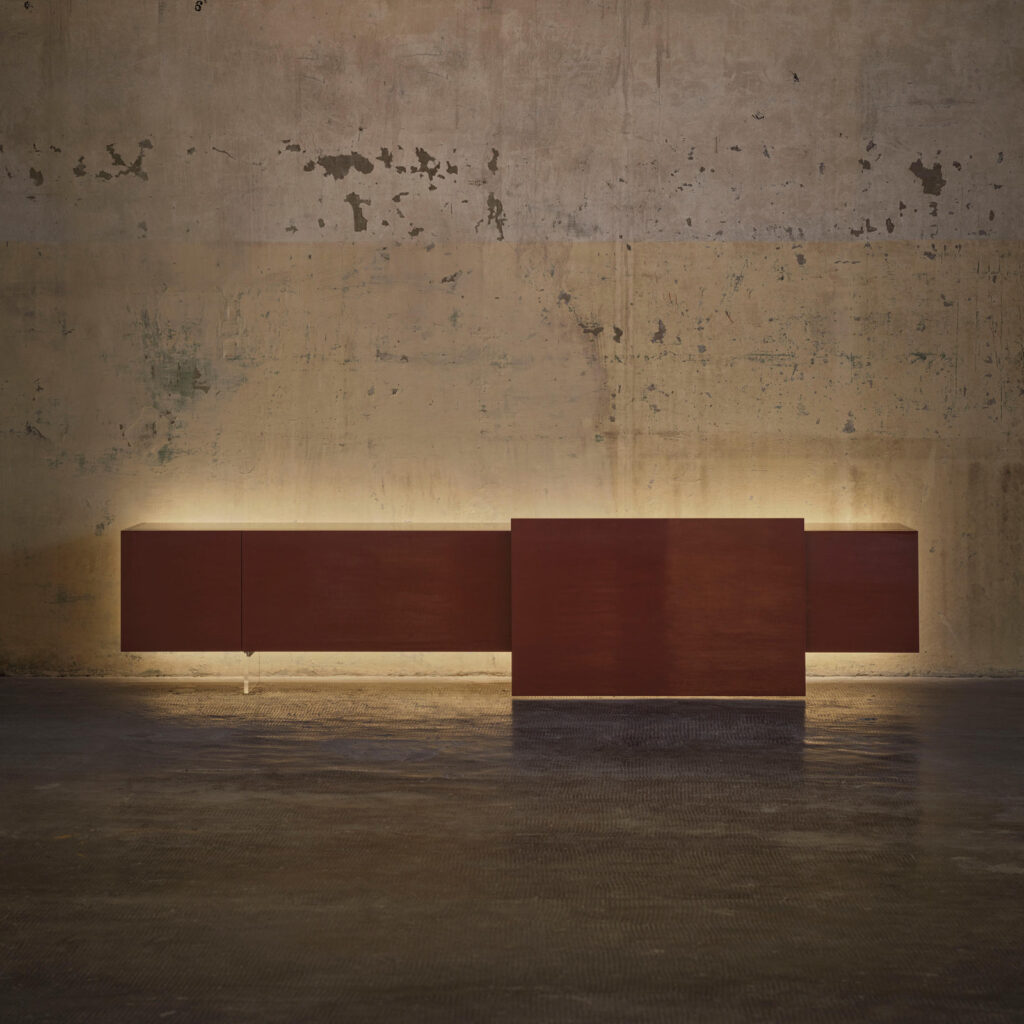 Alterego low nace de la sensibilidad del diseñador Giacomo Moor por la artesanía, unida a la capacidad de Acerbis para experimentar e innovar. Las proporciones del aparador son generosas, pero la base transparente, casi invisible, y el resplandor de la retroiluminación crean un efecto óptico inusualmente bello de ligereza suspendida. Visualmente, el panel frontal de altura completa parece ser el único elemento de soporte, pero no es más que una puerta corredera a los compartimentos principales del interior.