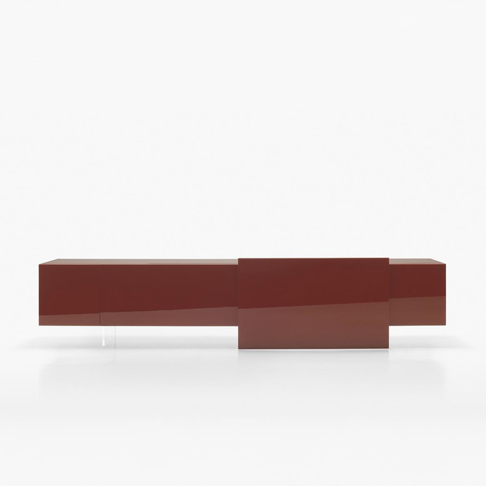 Alterego low está dedicado tanto al almacenamiento como al entretenimiento doméstico, diseñado para alojar sistemas multimedia con su espacio central provisto de estantes de cristal y orificios para cables. El compartimento del cajón está retroiluminado y puede equiparse con un accesorio de barra portabotellas de metacrilato opalescente.