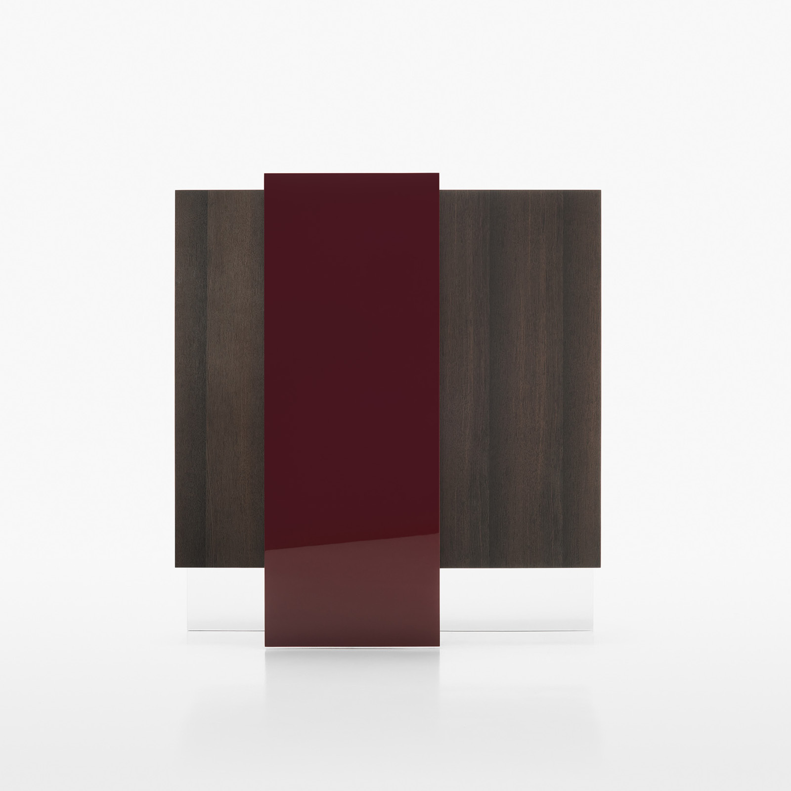 En sus últimos trabajos para Acerbis, Giacomo Moor imbuye al aparador Alterego, versión alta, del espejismo de la suspensión en una maravilla del ingenio del diseño. La puerta corredera a toda altura parece, imposiblemente, soportar el peso, que en cambio es sostenido por la base de metacrilato transparente. El contraste de la madera y el metal cepillado a mano subraya la identidad artesanal de los aparadores.