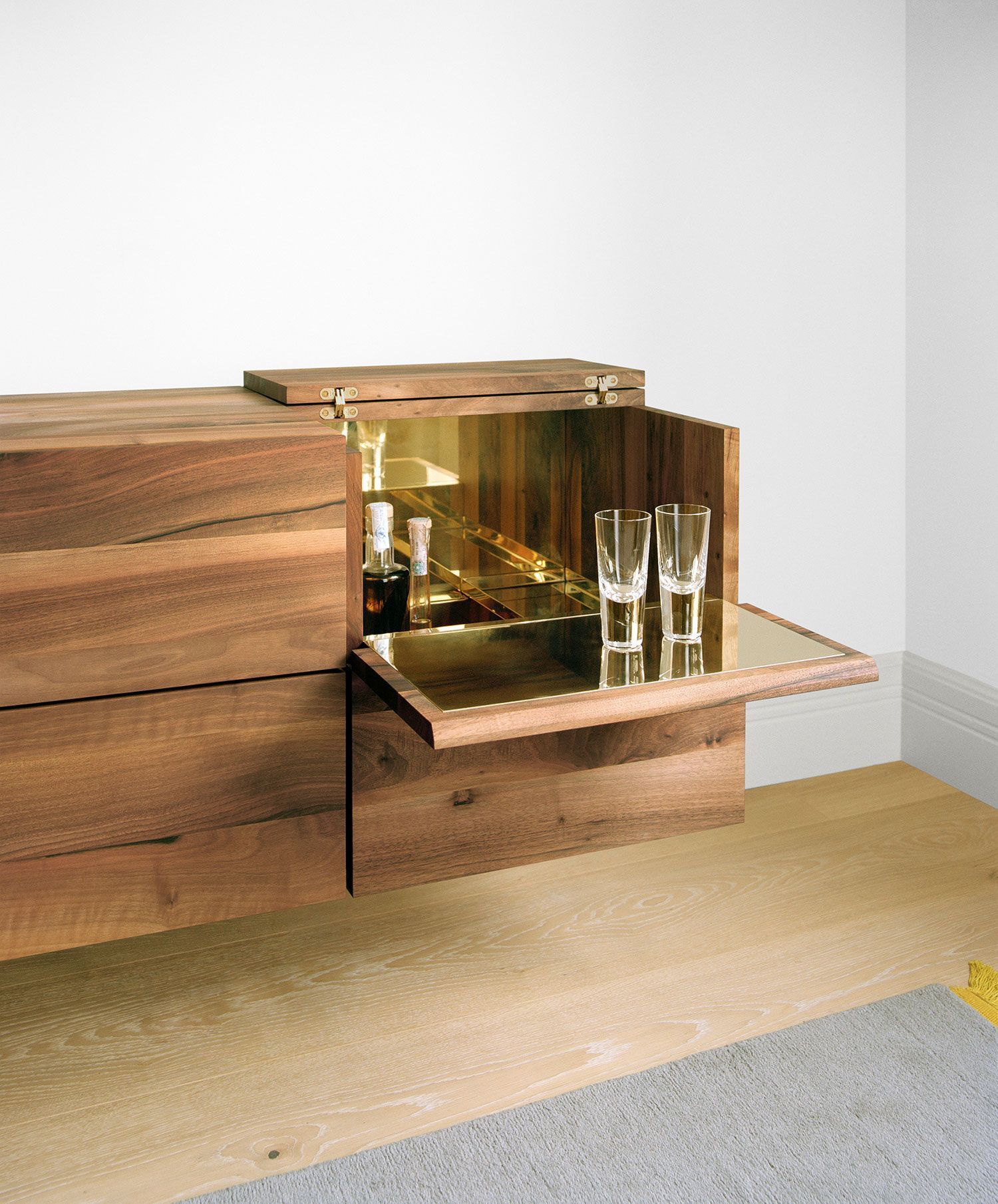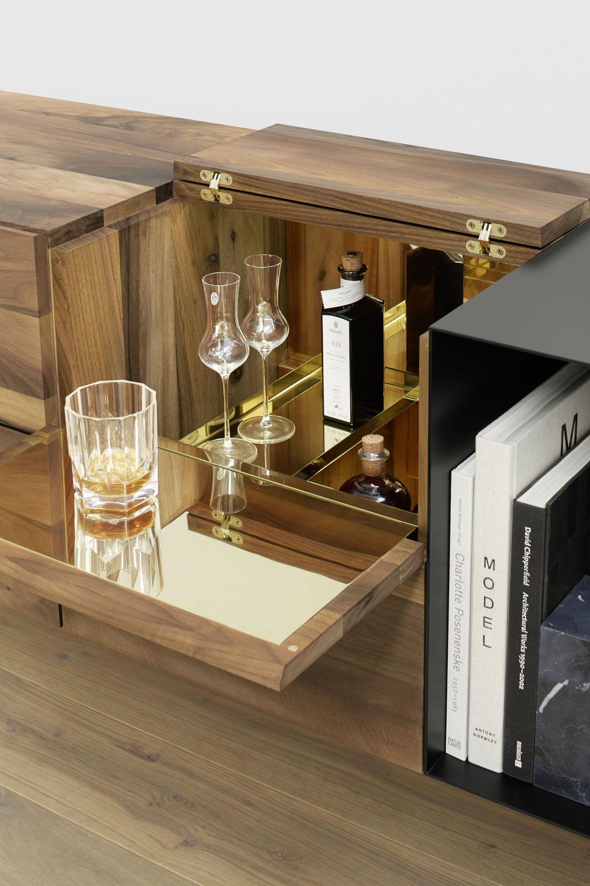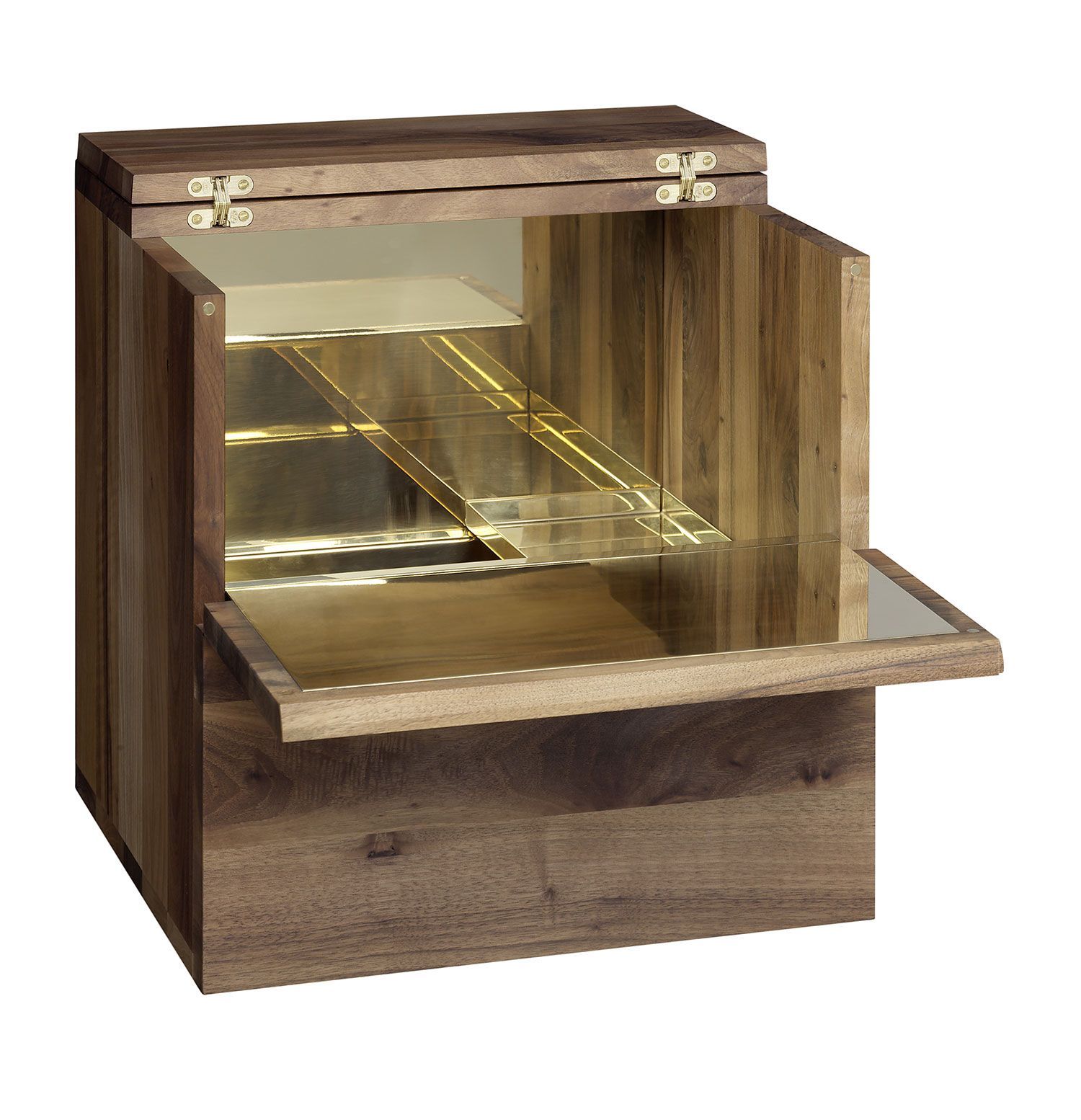 Mueble Bar con exterior en madera acabado a elegir e interior en latón pulido o acero inoxidable. Se abre mediante dos trampillas, una en la parte frontal que hace de superficie de trabajo y otra en la parte superior. Disponible en dos medidas.