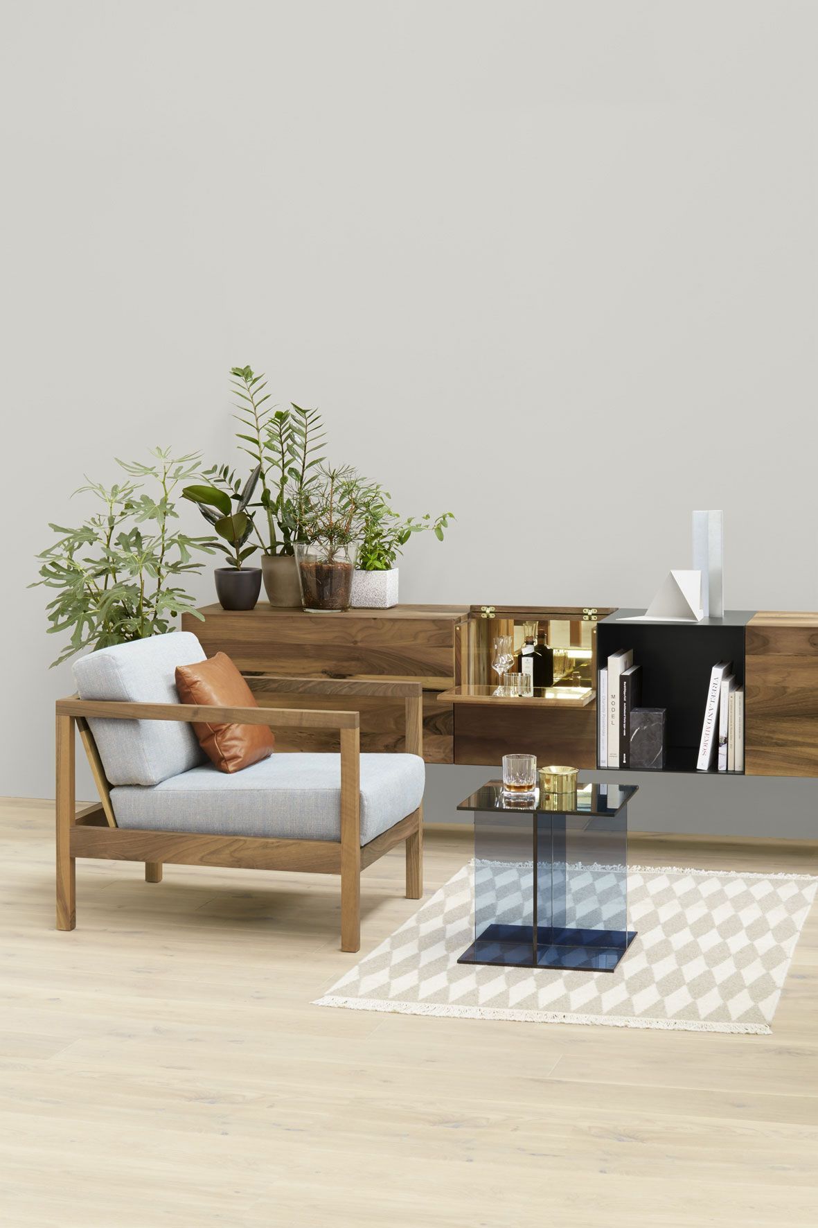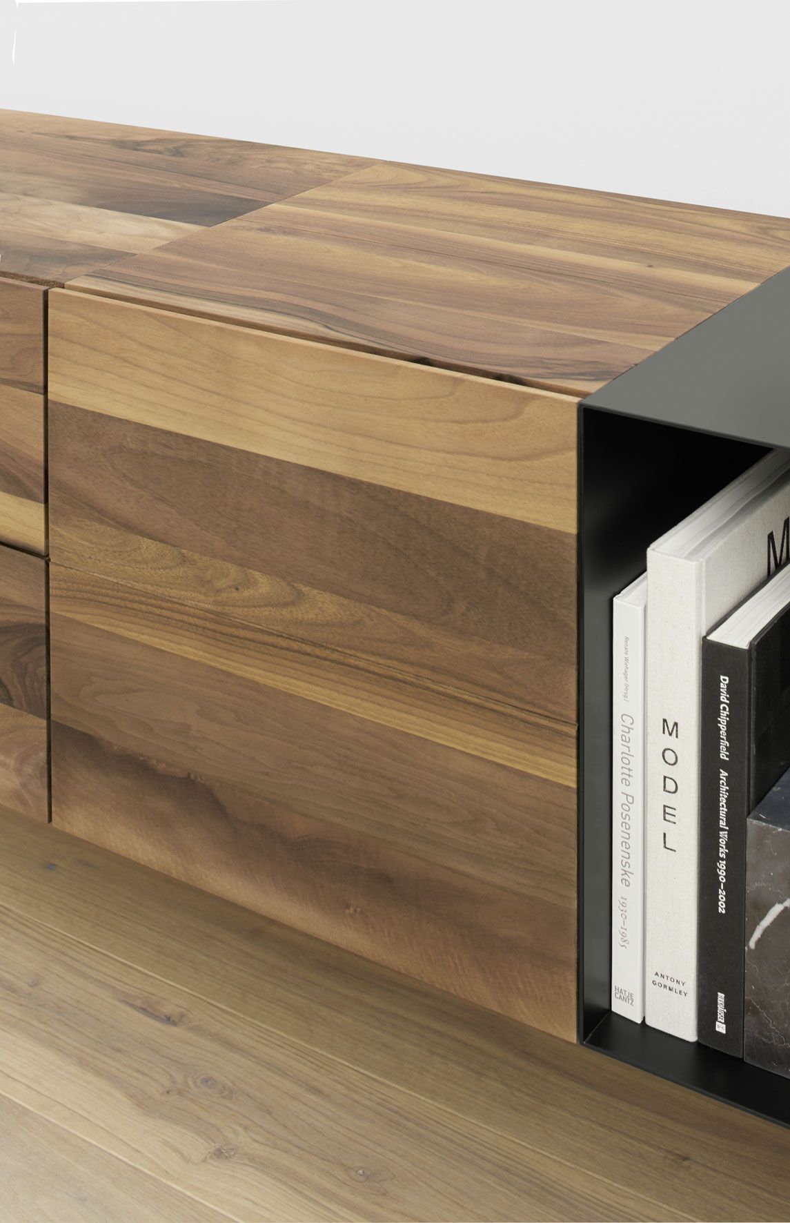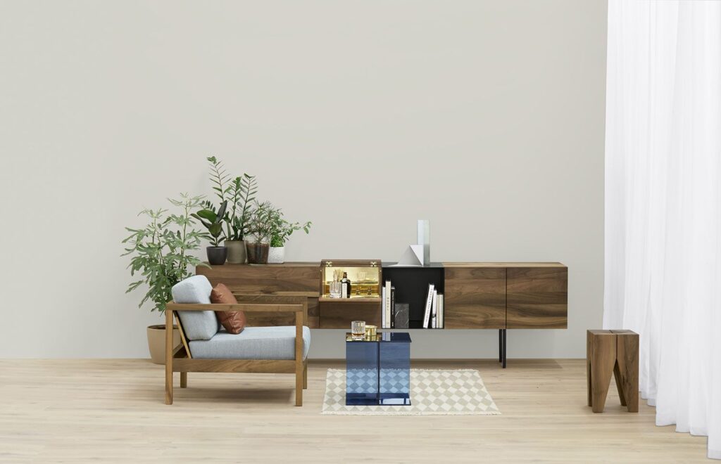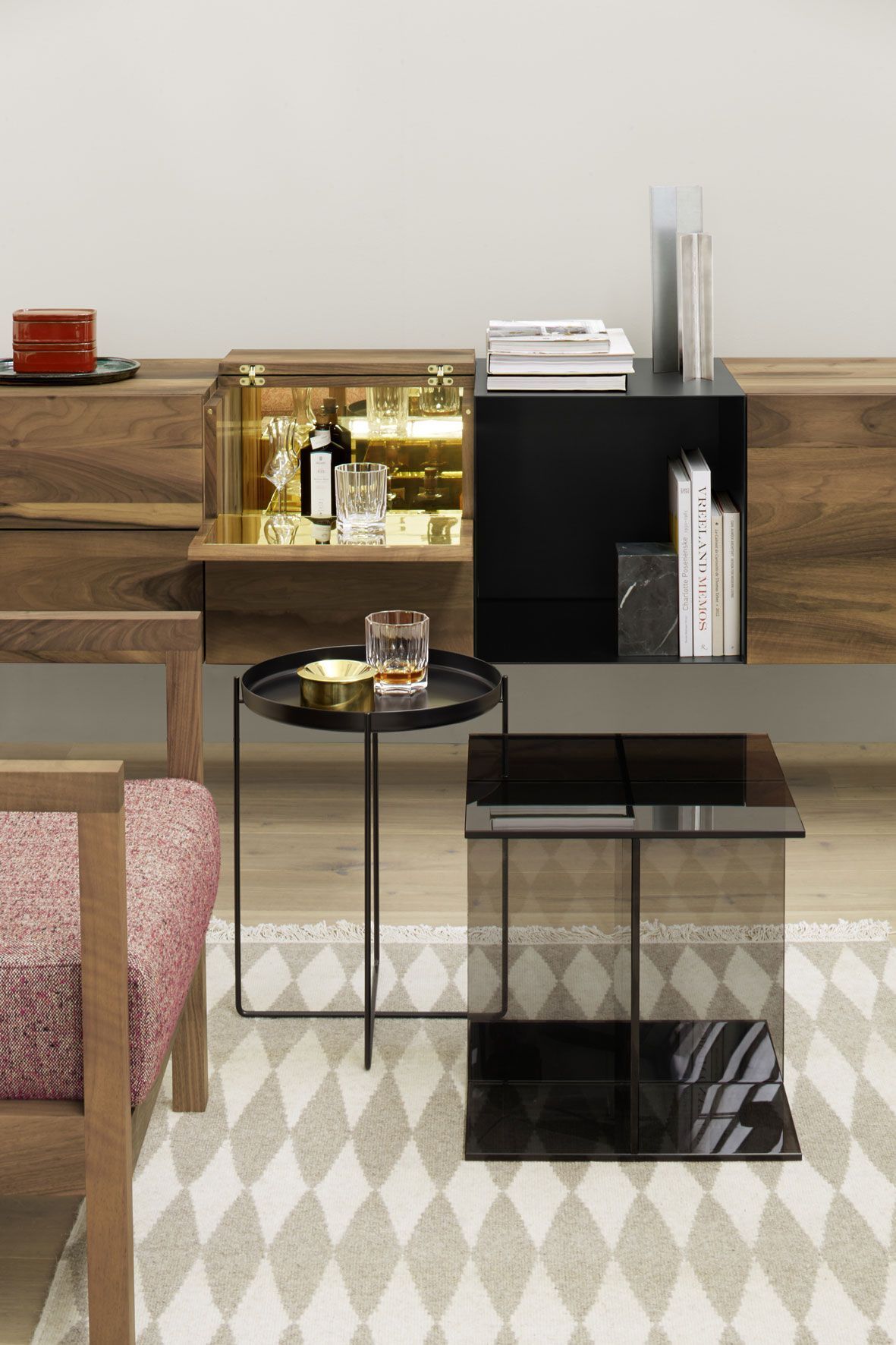 Mueble Bar con exterior en madera acabado a elegir e interior en latón pulido o acero inoxidable. Se abre mediante dos trampillas, una en la parte frontal que hace de superficie de trabajo y otra en la parte superior. Disponible en dos medidas.