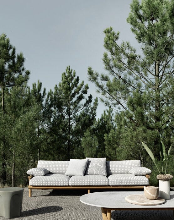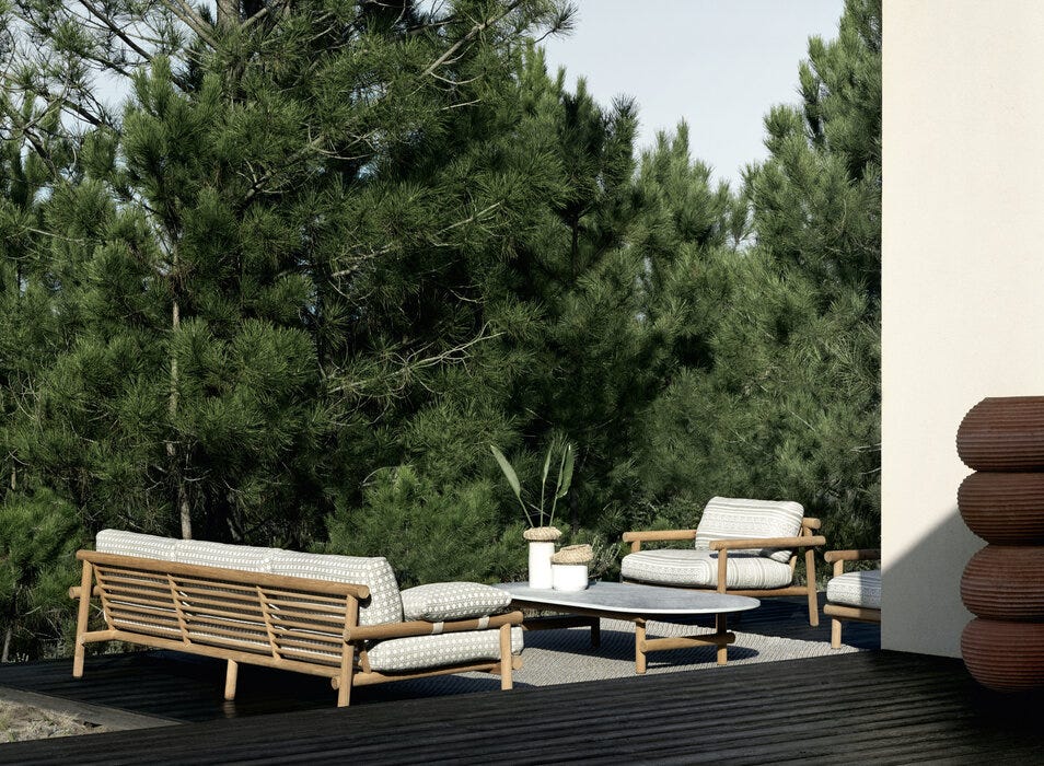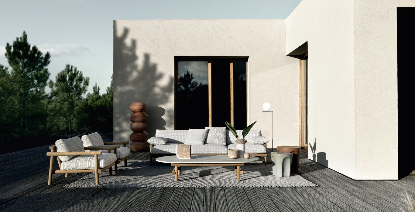 Innovador en su cálido minimalismo, el sofá de exterior Ayana, disponible en versión de dos y tres plazas, tiene la madera como protagonista absoluta. Mientras que las profundidades y las alturas son una clara referencia a la tradición del sudeste asiático, el respaldo recuerda una barra de pared sueca
