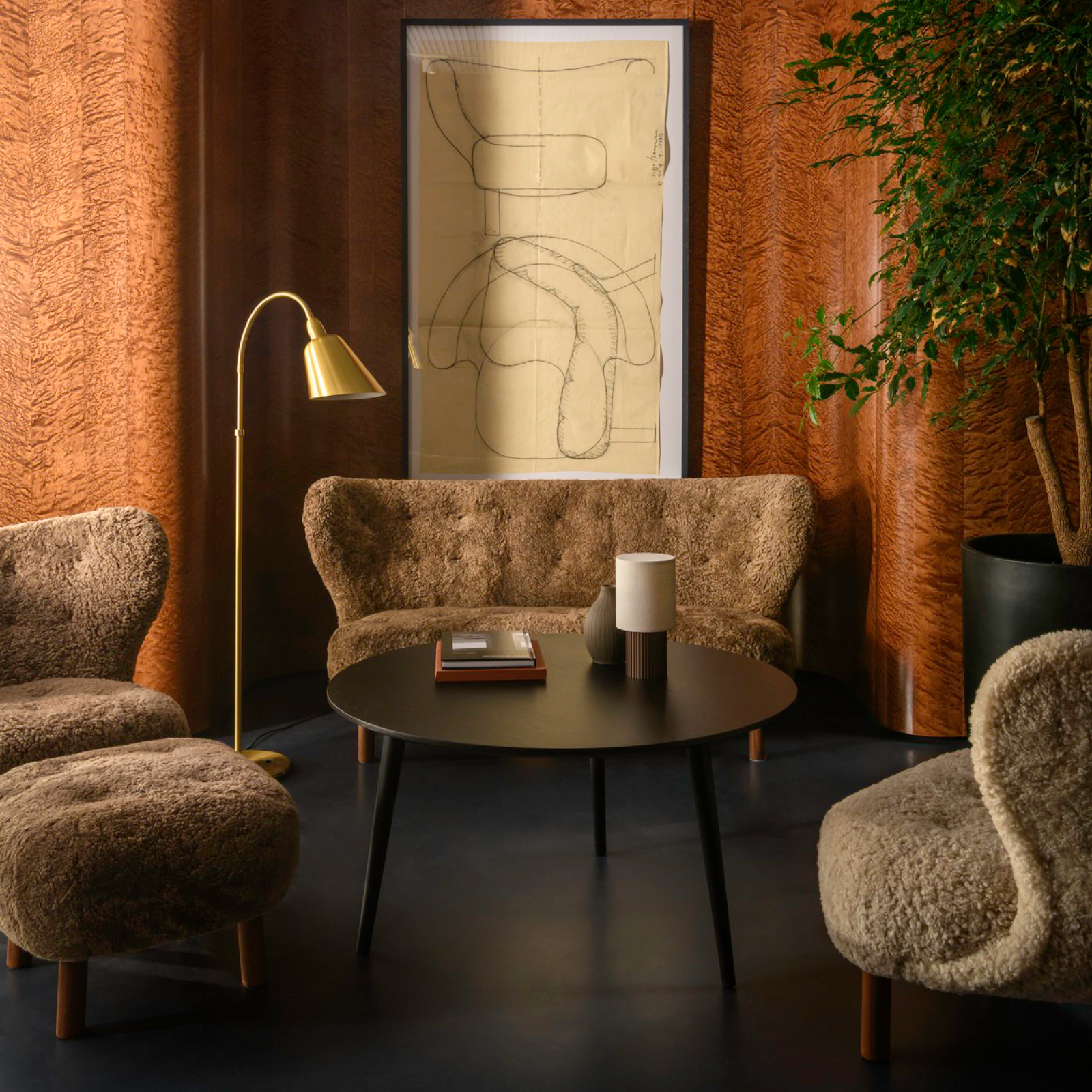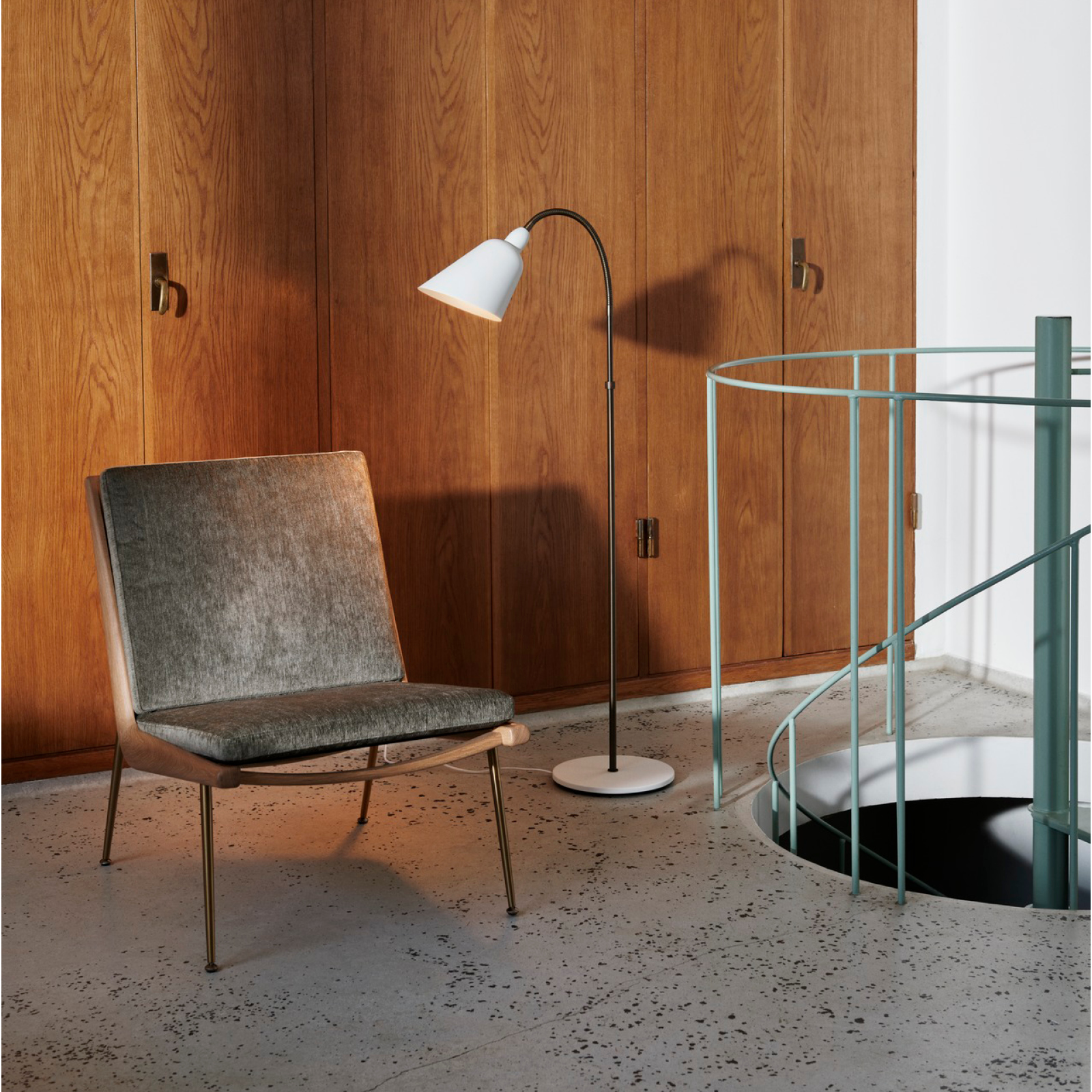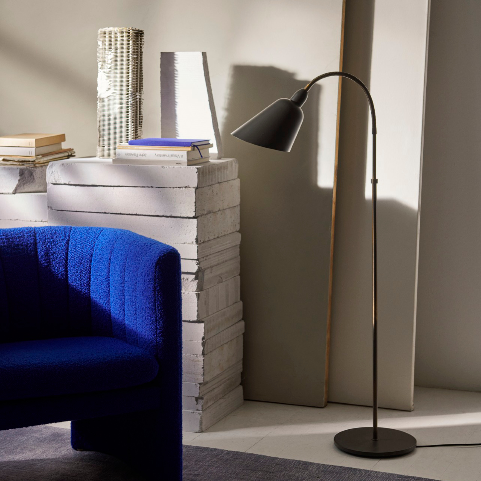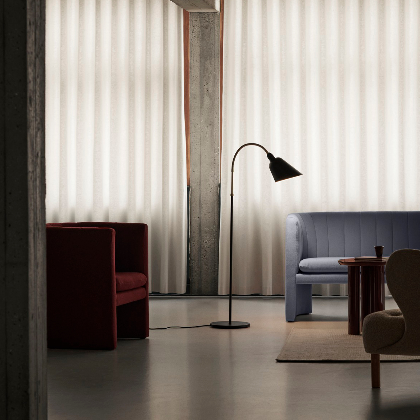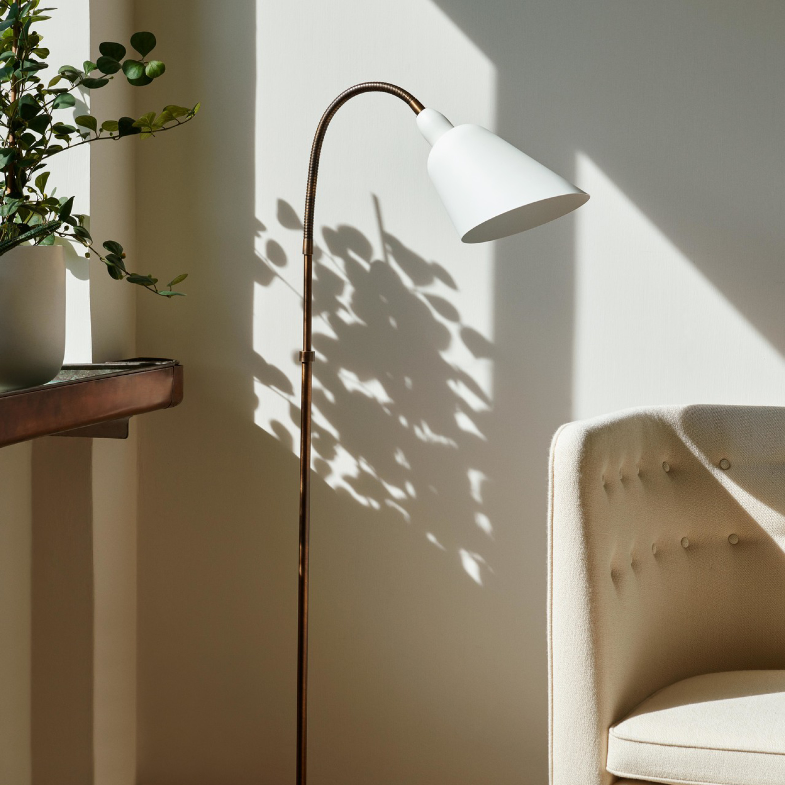 Lámpara de pie. De luz directa. Diseñada por Arne Jacobsen, su preferencia por las líneas elegantes y las formas simples y orgánicas son fácilmente reconocibles en la lámpara Bellevue.