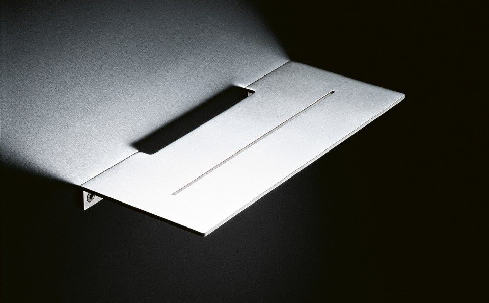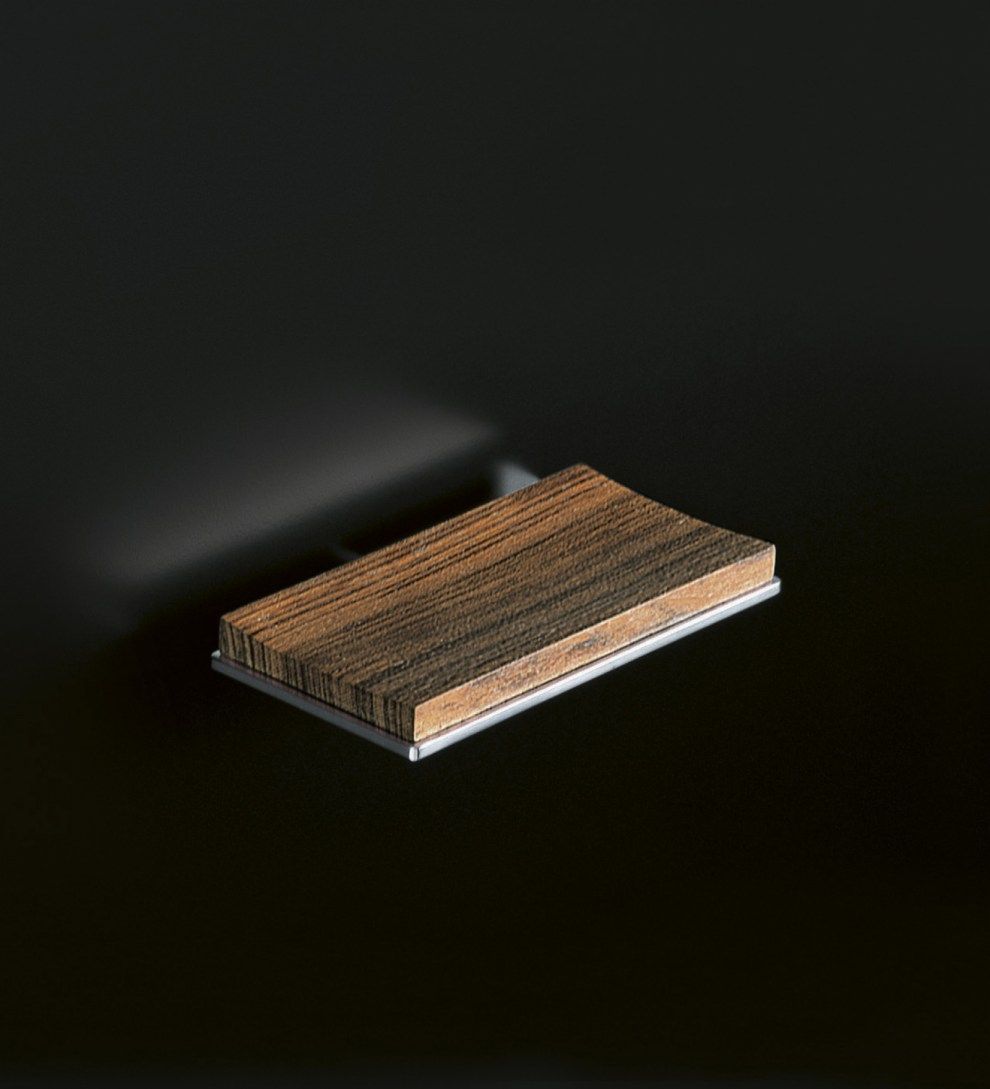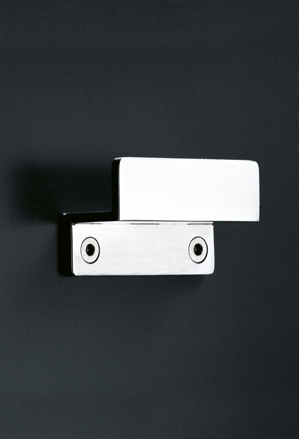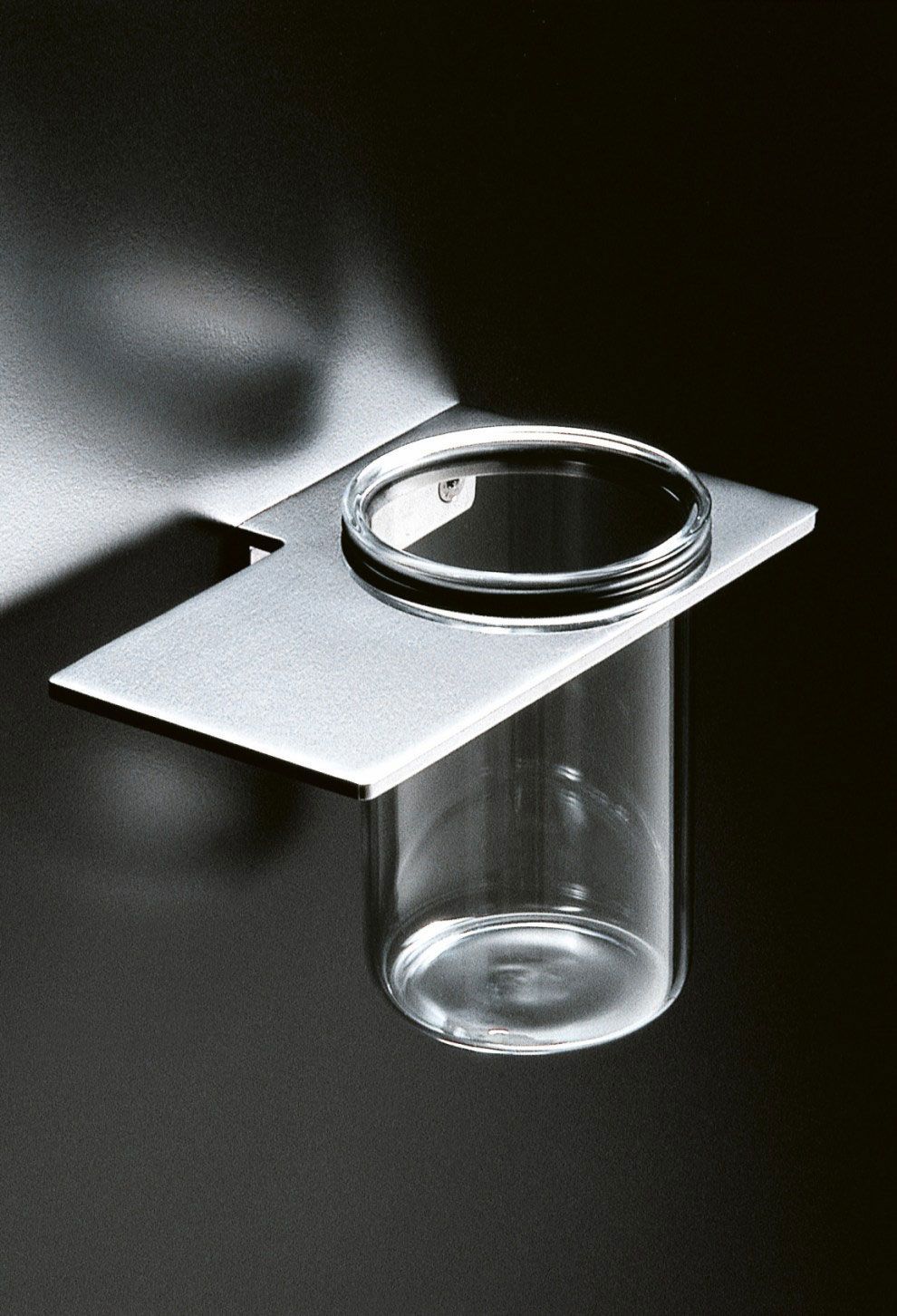 Accesorios de baño en acero inoxidable AISI 304 de 4 mm de espesor, en acabado PVD (Physical Vapor Deposition) pulido, satinado o gris, caracterizados por un aspecto, minimalista y de cantos cuadrados. La gama incluye: jabonera (con plato de madera de teca), portacepillos (con vaso de vidrio Pyrex), toallero, portarrollos, gancho para ropa, repisa para ducha, papelera y soporte para caja de pañuelos.