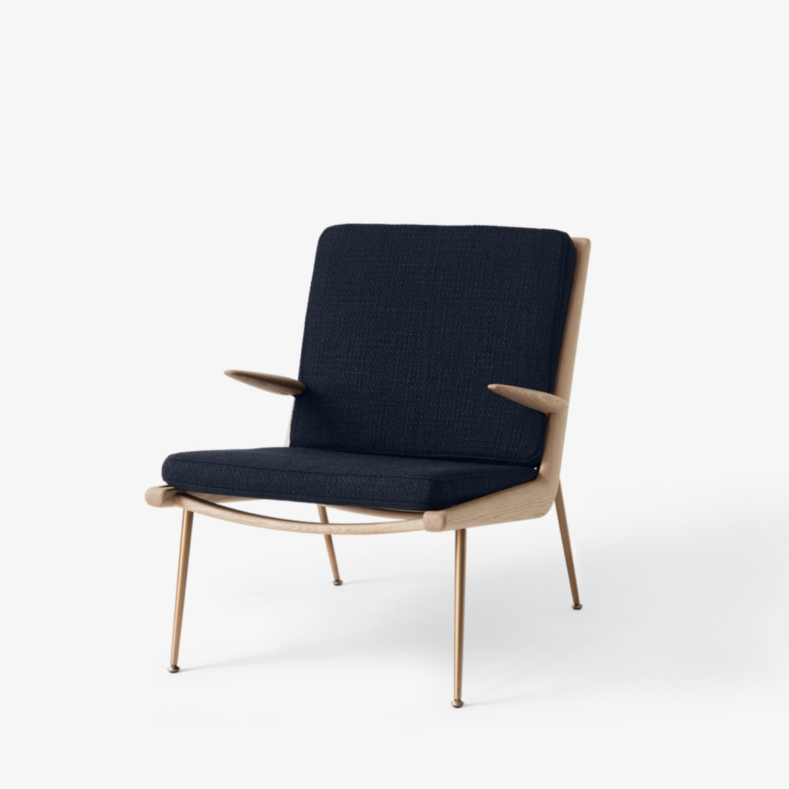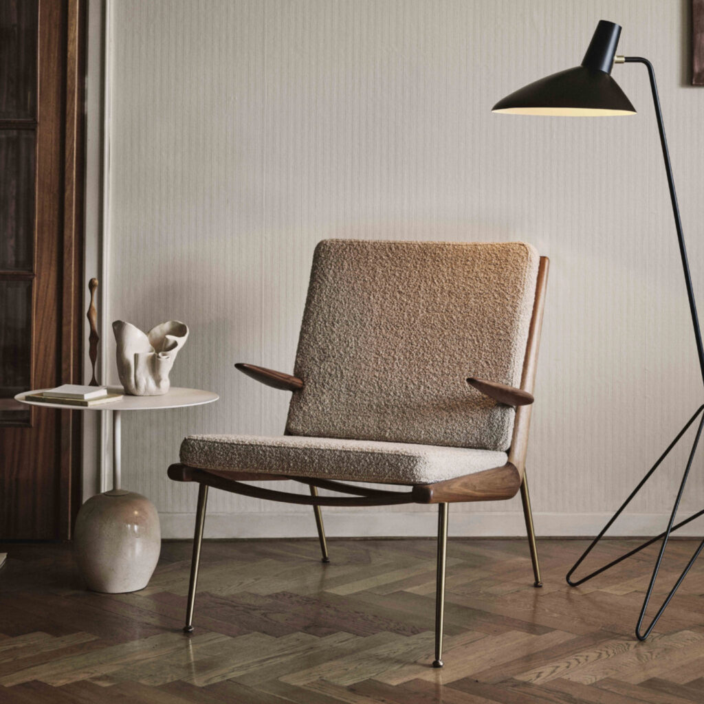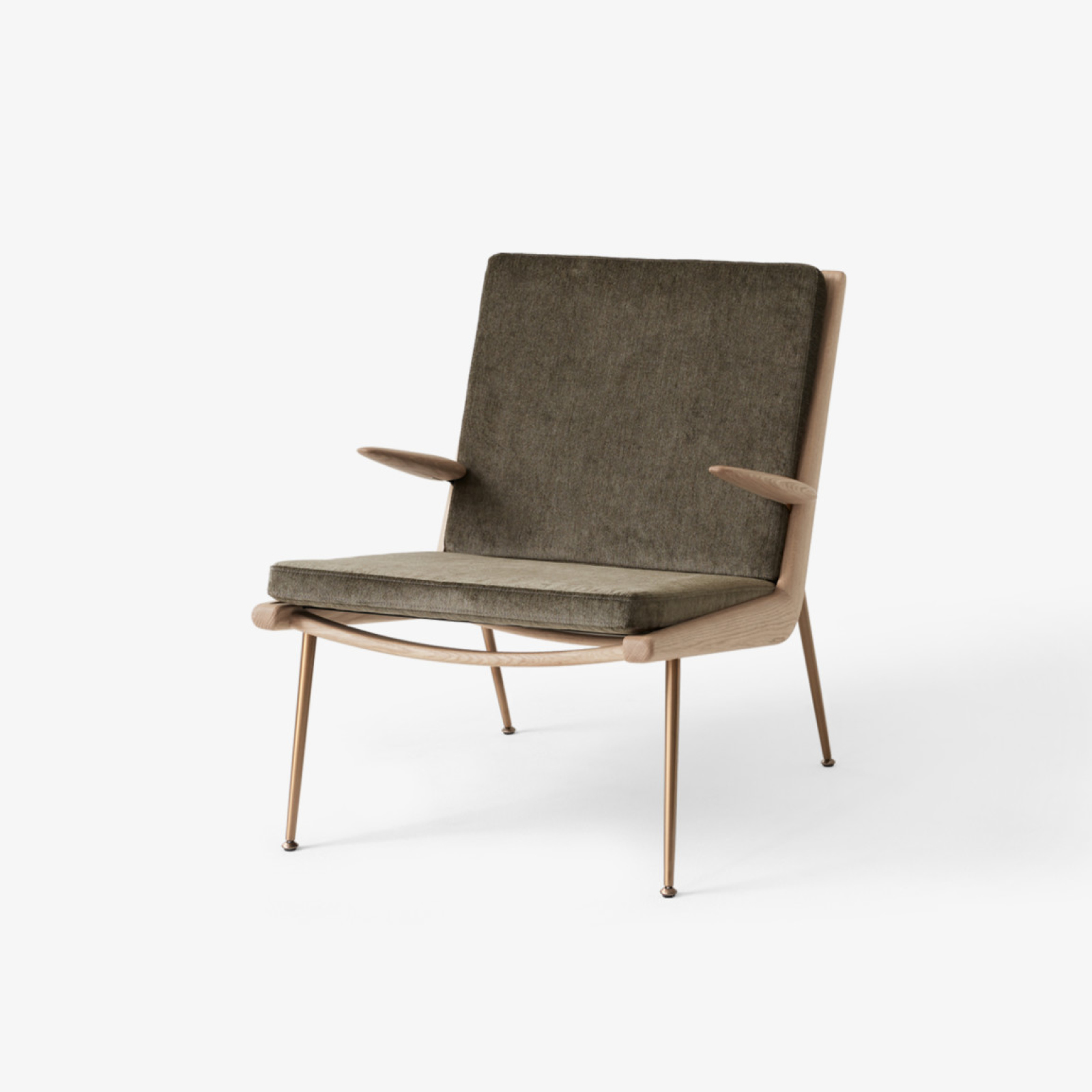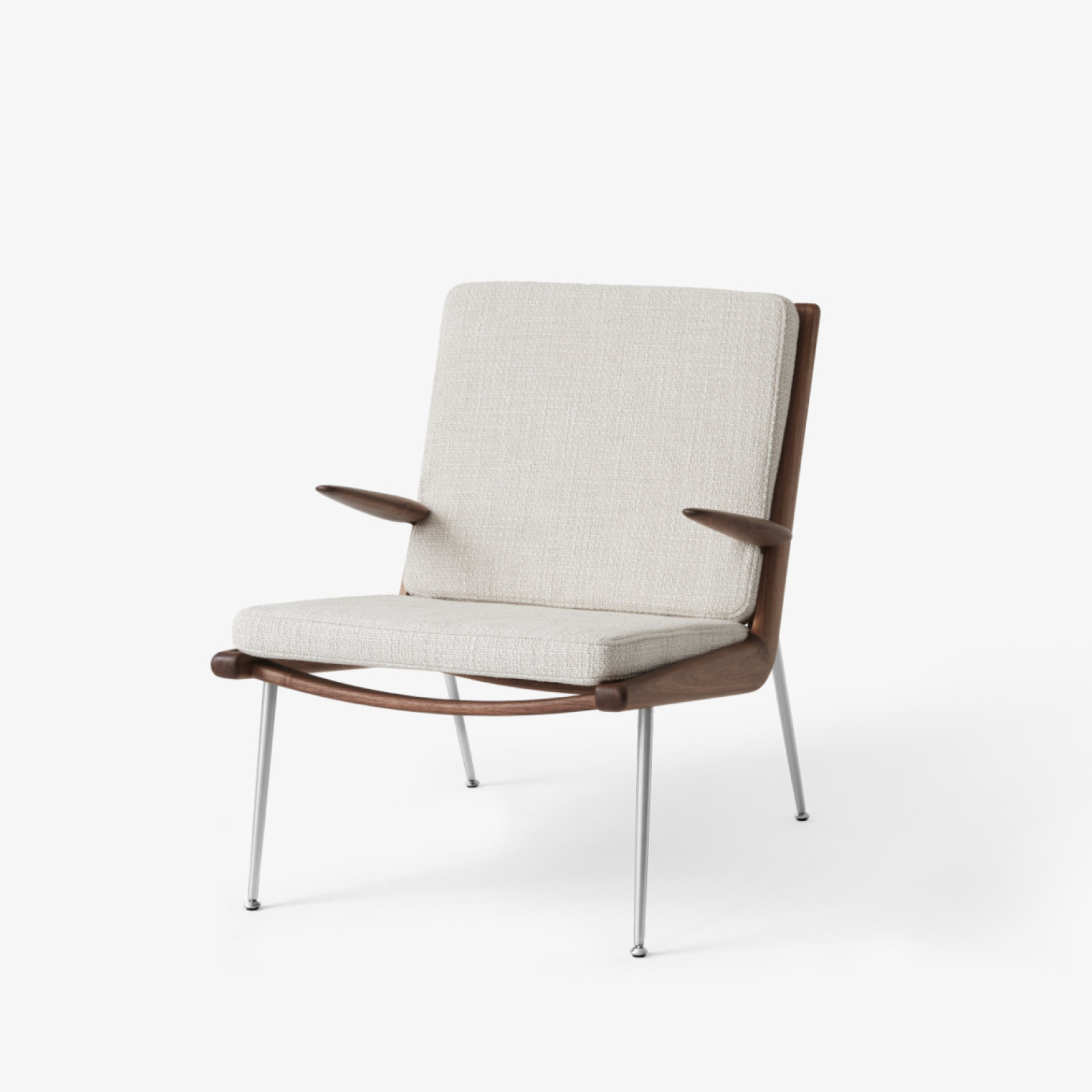 Presentada en 1956, la silla lounge del dúo Hvidt & Mølgaard tiene una forma simplificada y sin adornos. Desde el marco de madera pulido a mano hasta sus esbeltas patas de latón o acero inoxidable, el Boomerang perdura como una obra maestra del diseño danés.