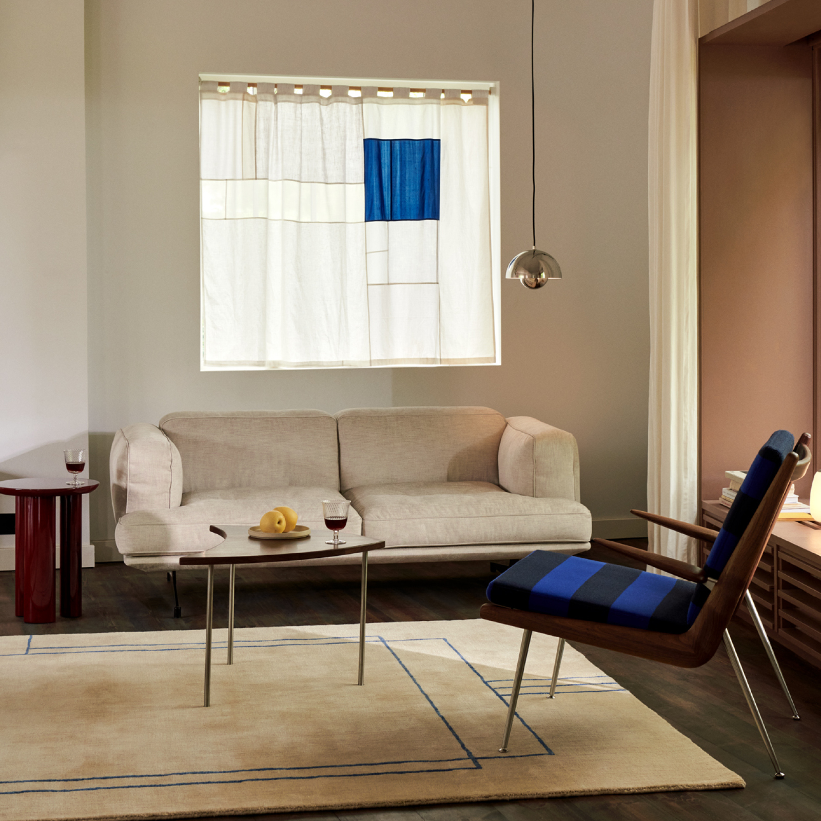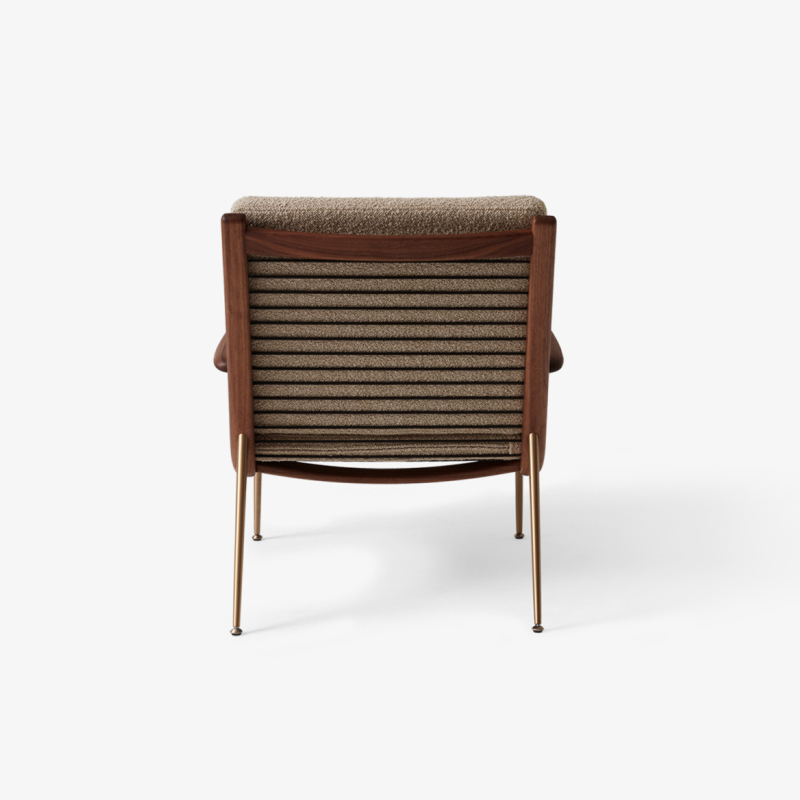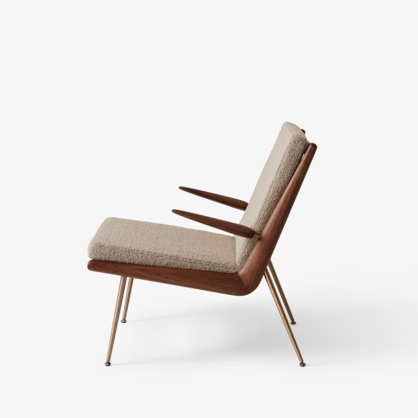 Presentada en 1956, la silla lounge del dúo Hvidt & Mølgaard tiene una forma simplificada y sin adornos. Desde el marco de madera pulido a mano hasta sus esbeltas patas de latón o acero inoxidable, el Boomerang perdura como una obra maestra del diseño danés.