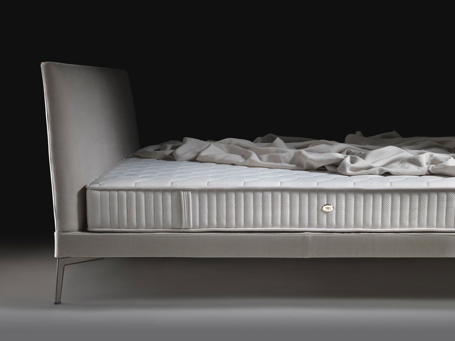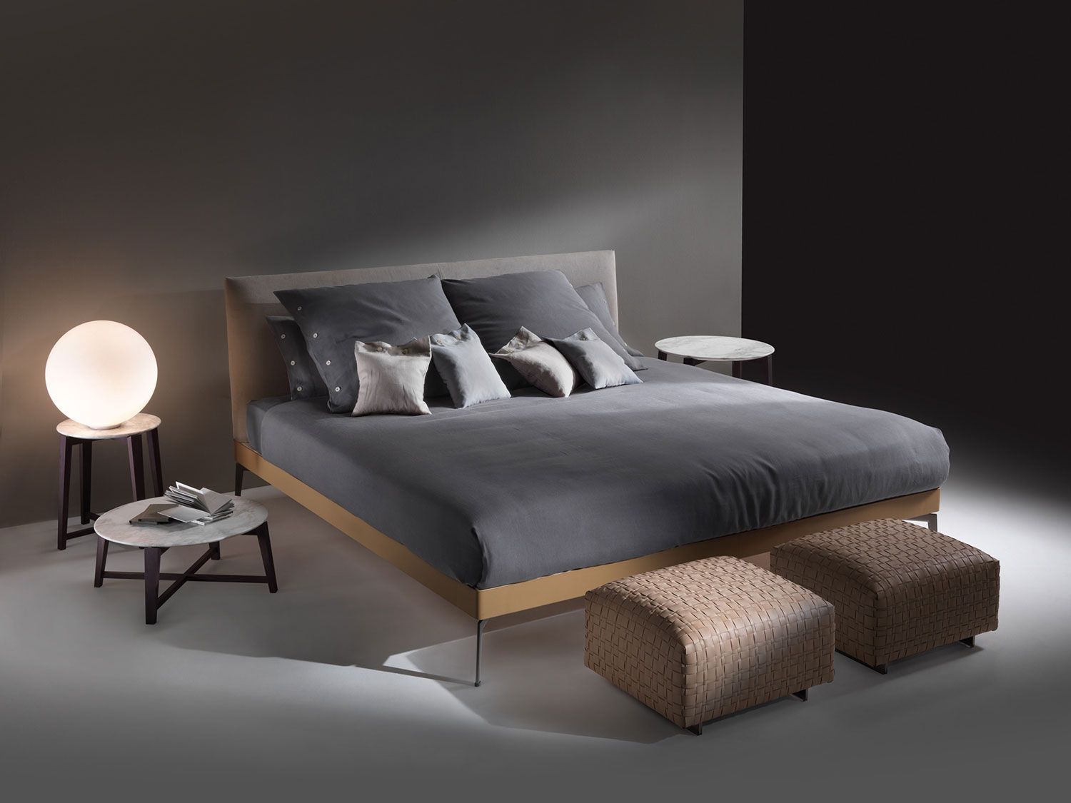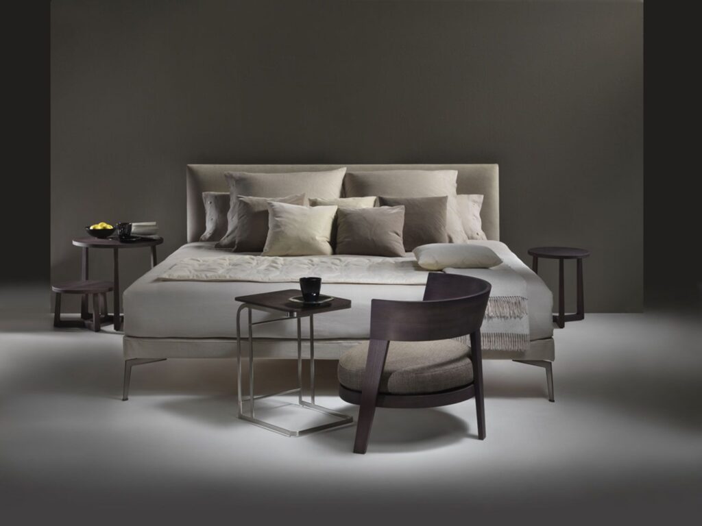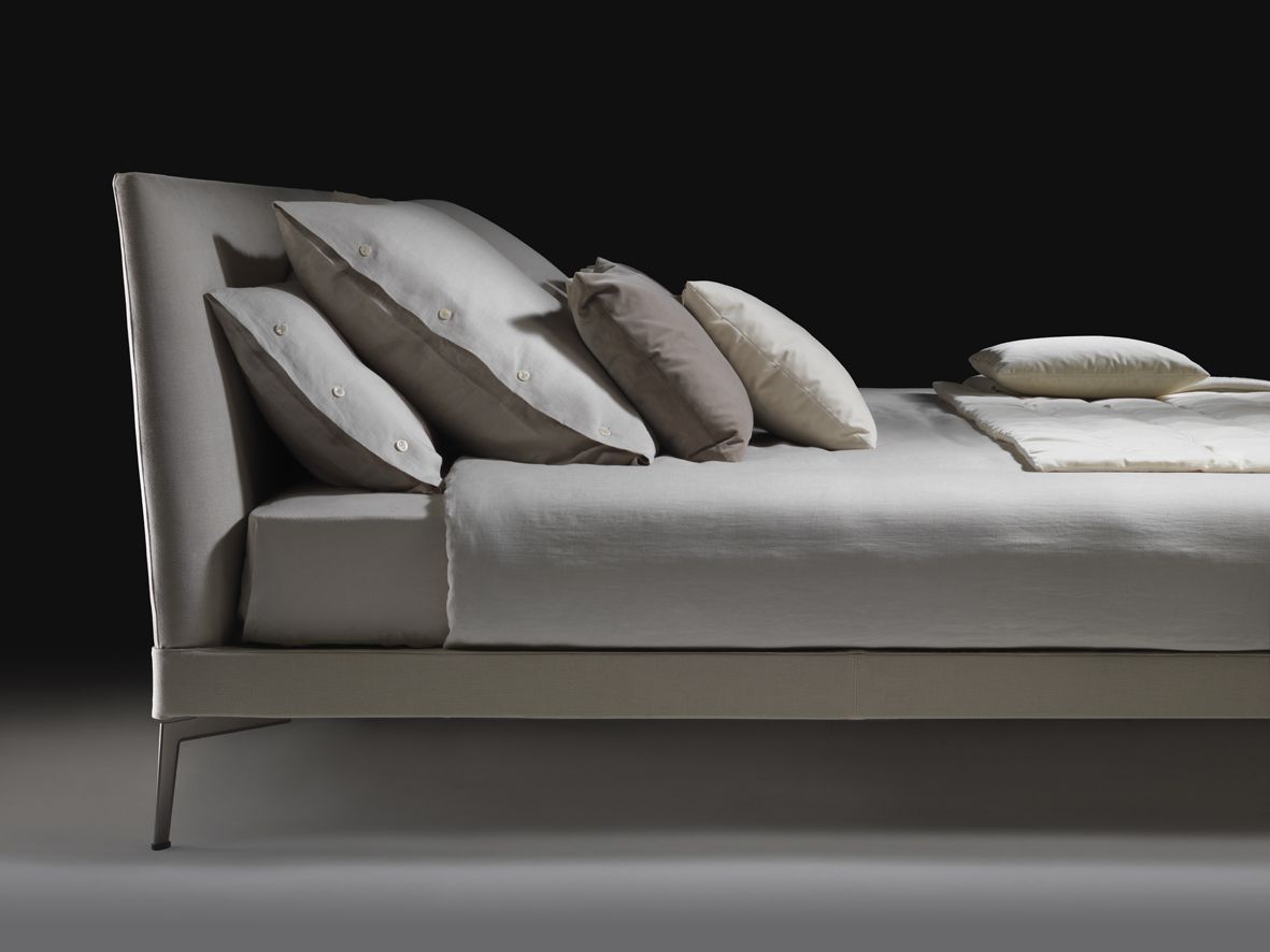 Cama visualmente muy ligera, de diseño atemporal. Con cabezal y somier tapizados en tela o piel de la colección de Flexform, totalmetne desenfundables. Patas en aluminio acabado a elegir. Su linea sigue la misma estética de la colección a la que pertenece.