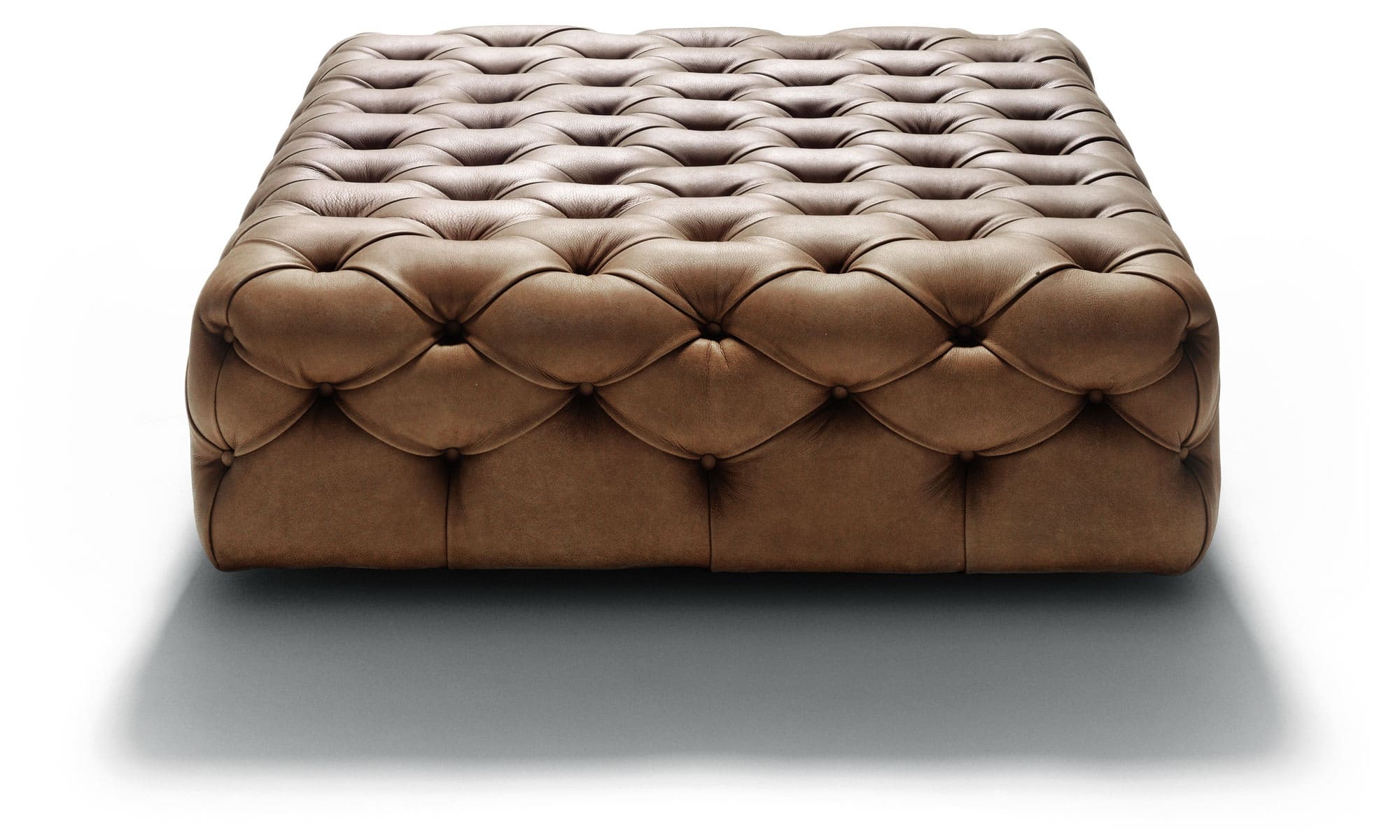 El Puf Capitonné es versátil y práctico. Protagonista en el centro de la sala de estar, distribuidor o dormitorio. Los detalles hechos a mano de la tapicería de cuero marrón avellana lo hacen especial. Disponible en tela o piel y se presenta en dos tamaños, tanto en versión cuadrada como redonda.