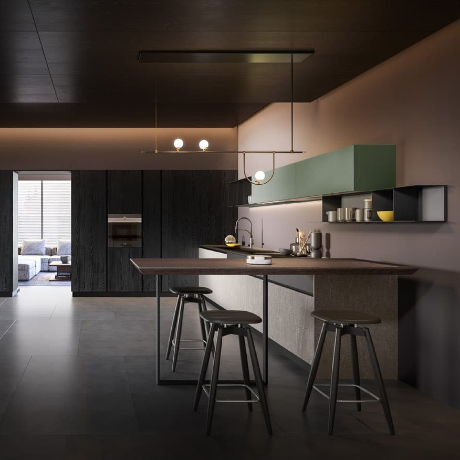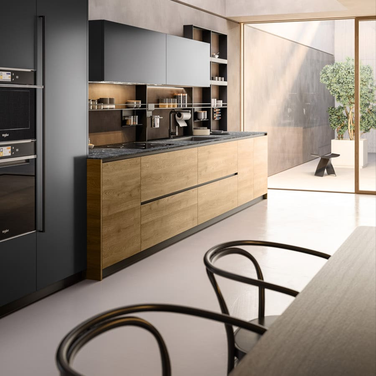 Un proyecto que se funde armoniosamente con la arquitectura circunstante, transformando el ambiente en una experiencia estética funcional. Los acabados se han seleccionado atentamente para acentuar la belleza y la elegancia de la cocina. El melamínico Lamina Brunito, con su superficie de rayas que reproduce los reflejos de una chapa de metal, confiere un toque de modernidad y elegancia. El lacado brillante Moka añade calor a la composición, creando un contraste visualmente fascinante. La encimera de gres, amplia y sofisticada, complementa la atmósfera, confiriendo un toque de lujo y elegancia.