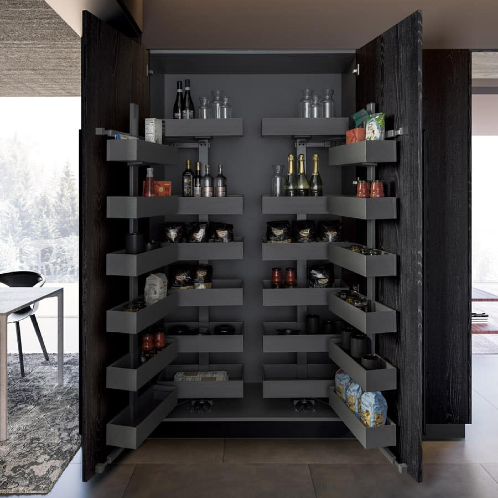La utilización de materiales innovadores permite inventar formas y conceptos siempre nuevos, encontrando la alquimia perfecta entre innovación y tradición. La sólida puerta, de 22 mm de espesor, se utiliza como base para un ambiente armonioso en el cual se desarrollan estructuras compactas y fuertes, que encierran en su interior funciones, contenedores y espacios bien organizados.