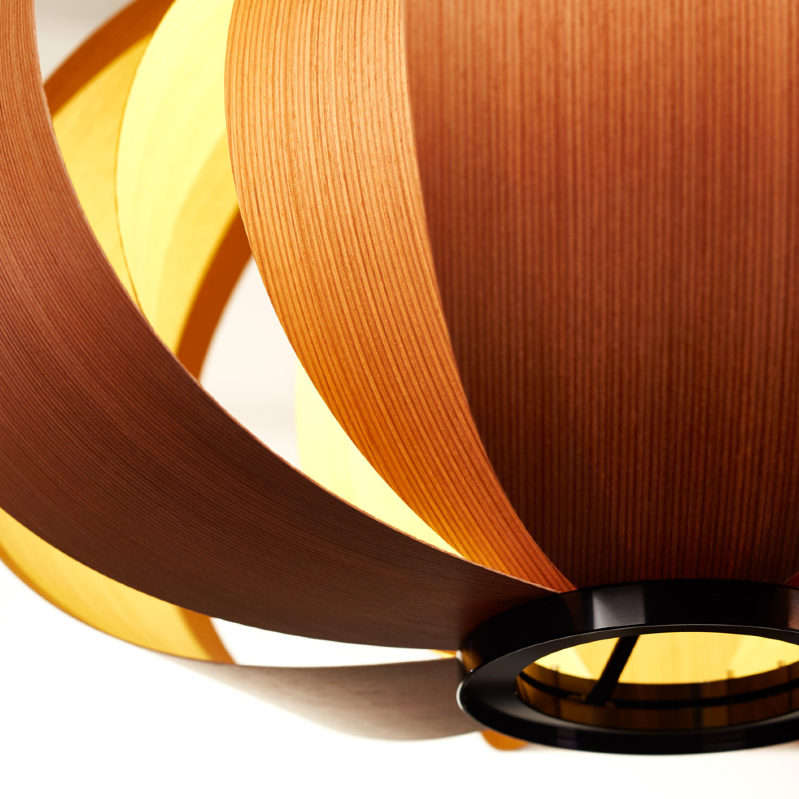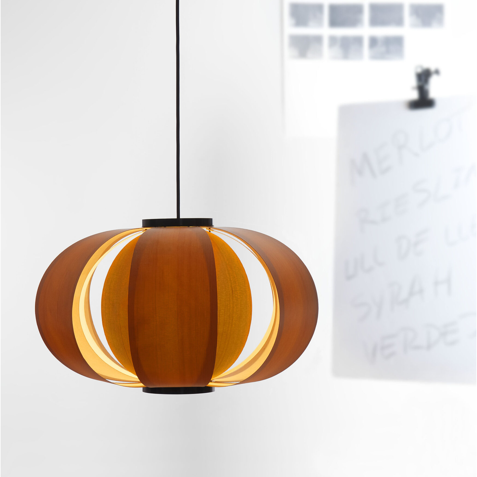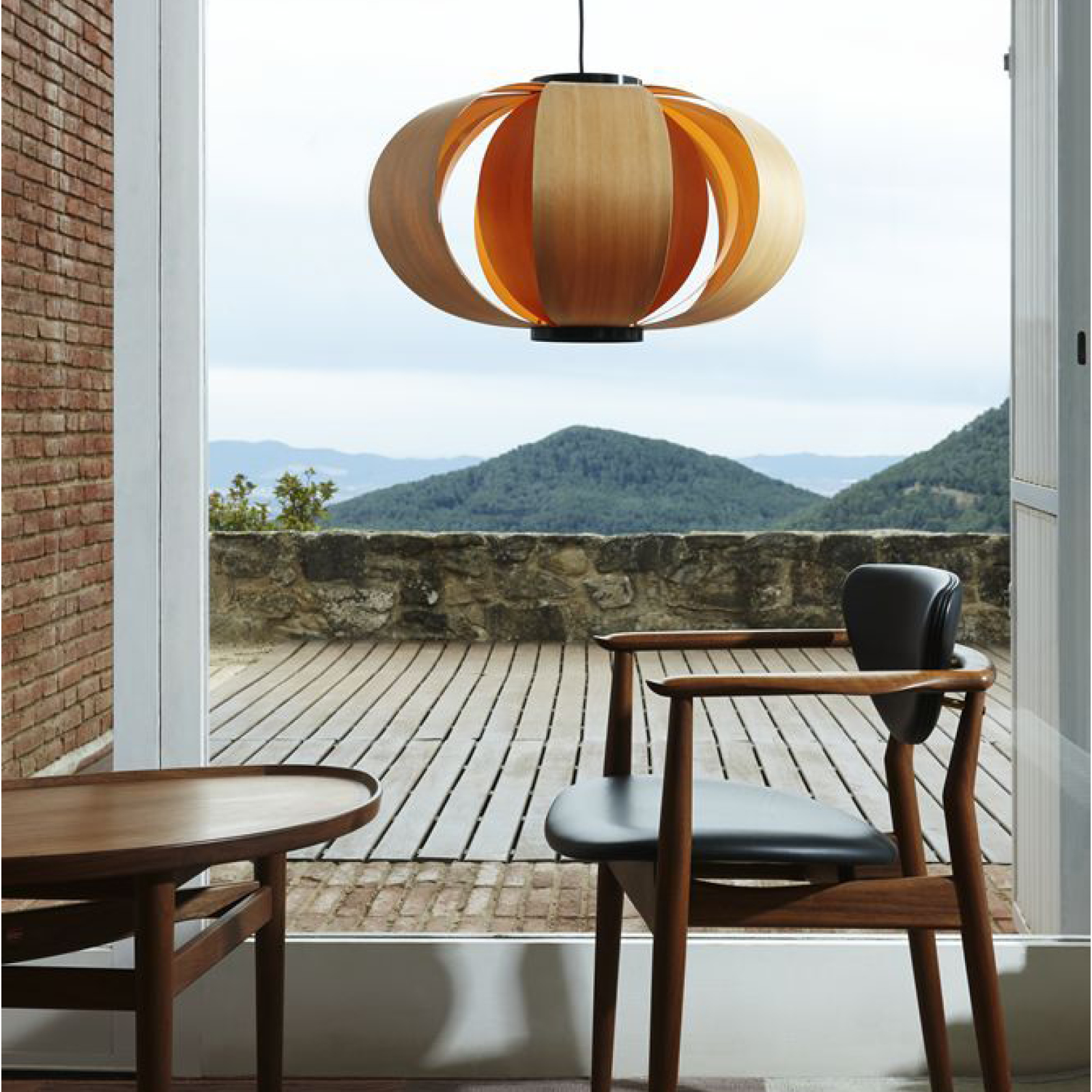 Lámpara de suspensión. De luz difusa. Pantalla compuesta por finas lamas de madera o metacrilato opal curvadas, que dan la forma tan característica de esta lámpara y crea una luz que crea un ambiente de intimidad. Funte de luz led integrado.