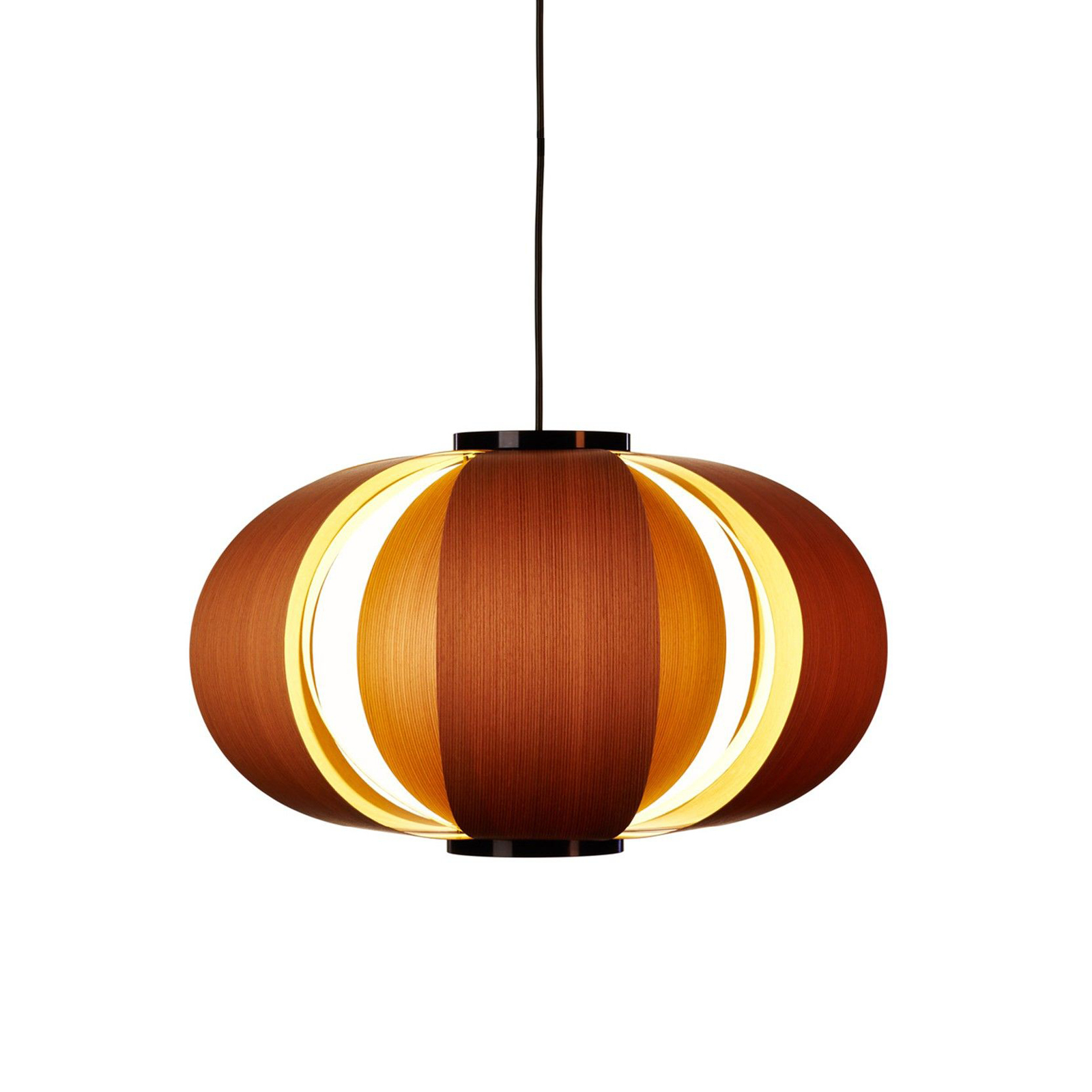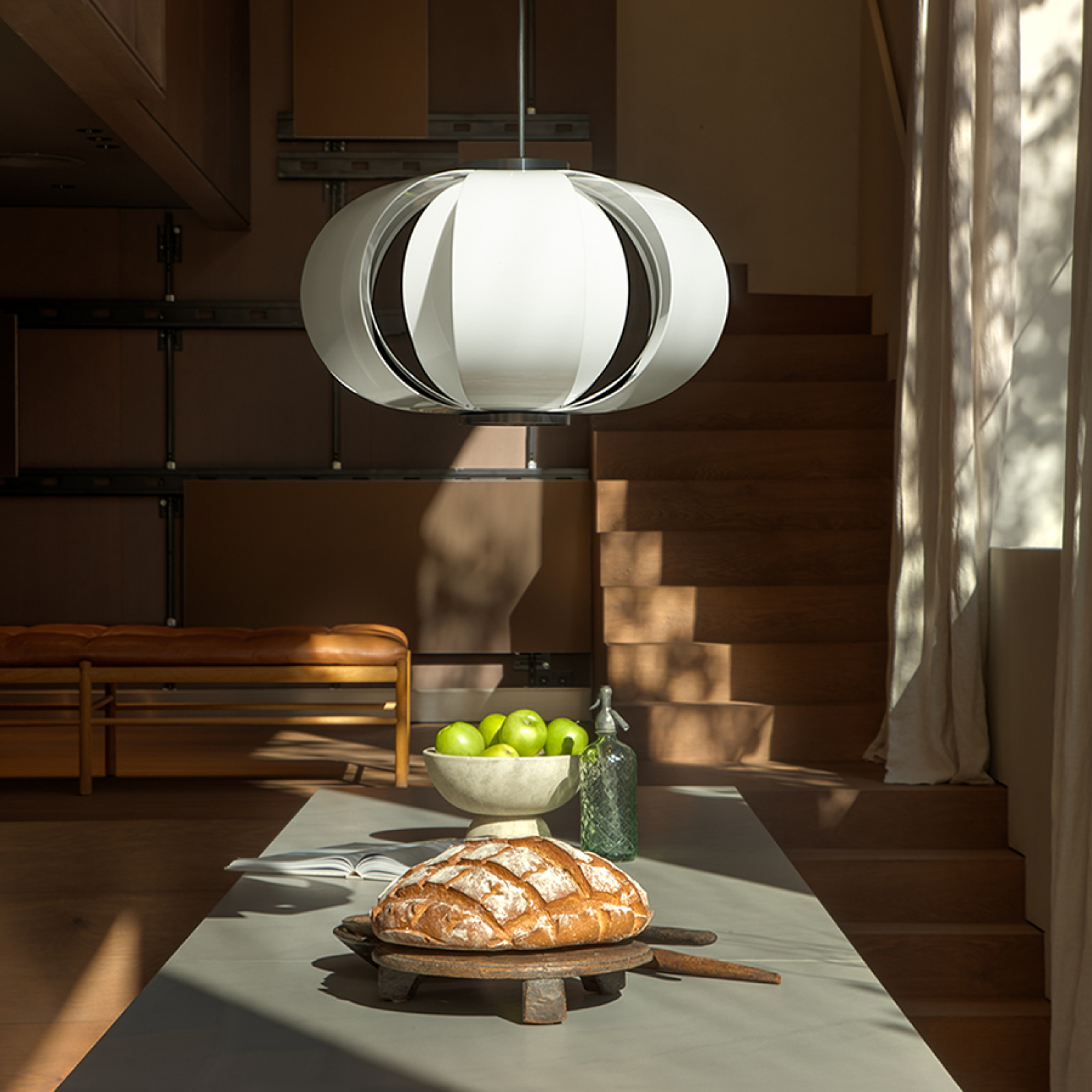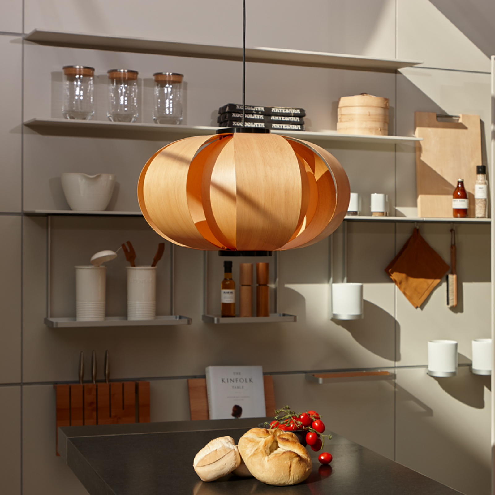 Lámpara de suspensión. De luz difusa. Pantalla compuesta por finas lamas de madera o metacrilato opal curvadas, que dan la forma tan característica de esta lámpara y crea una luz que crea un ambiente de intimidad. Funte de luz led integrado.
