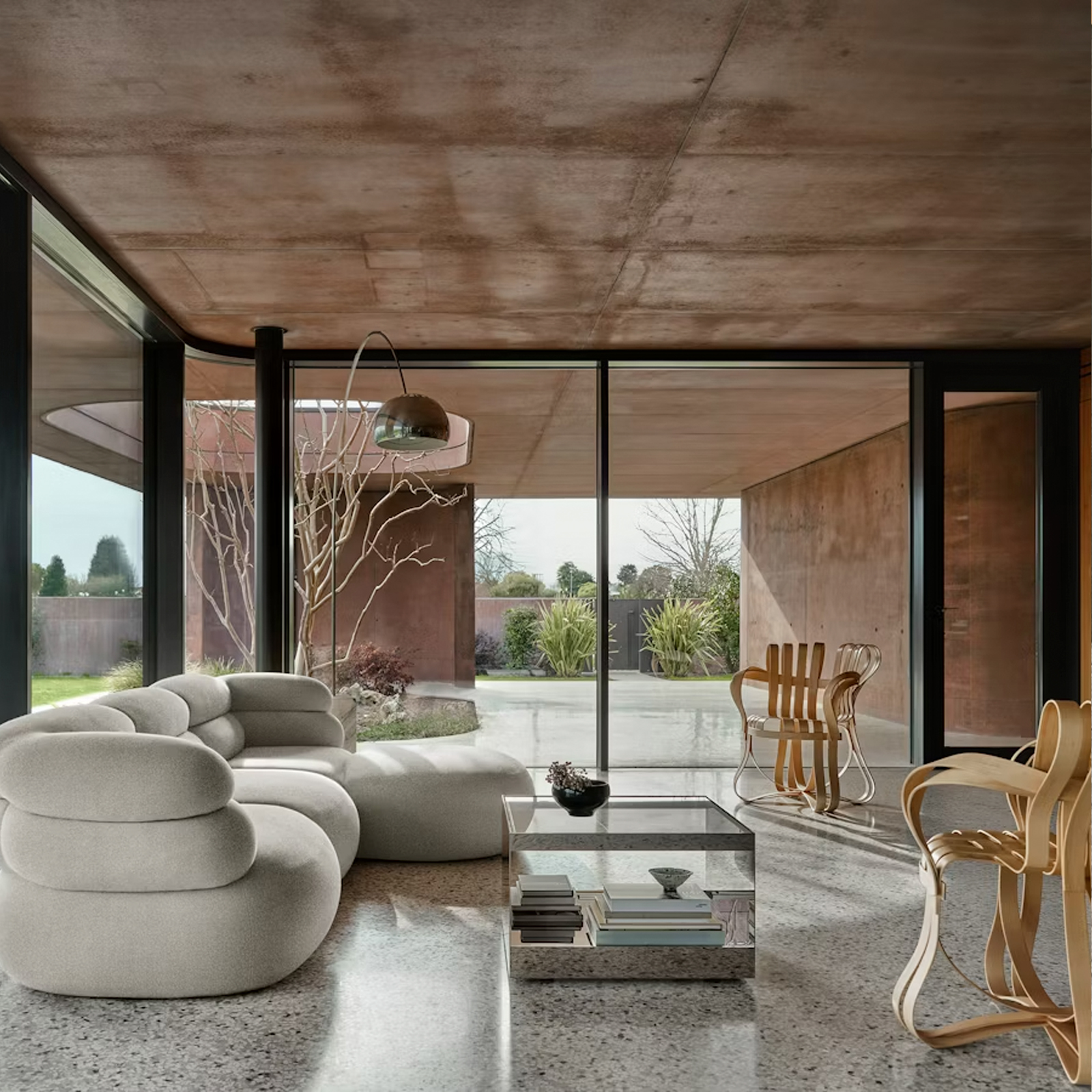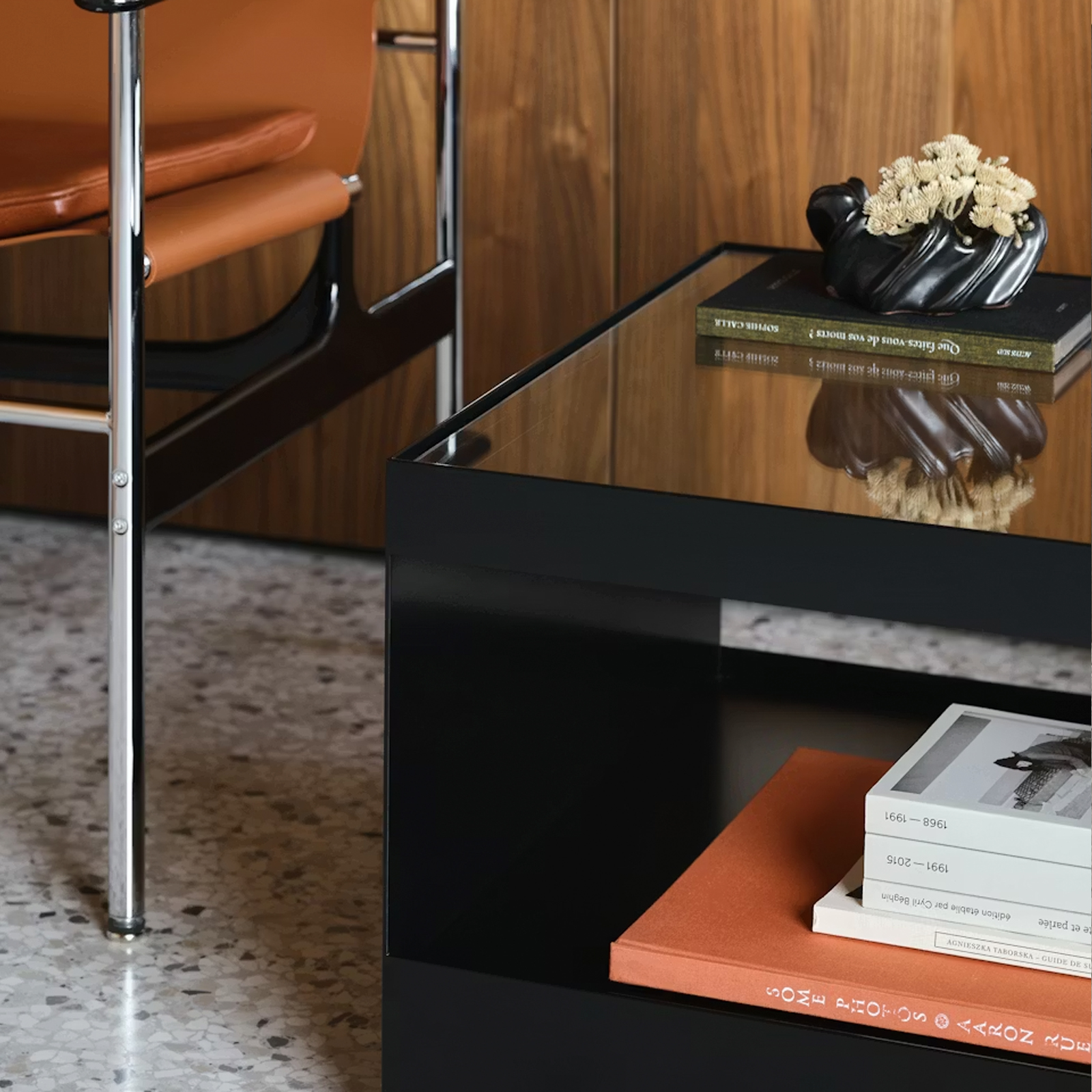 Al igual que la arquitectura funcional, la Mesa Centro D’Urso presenta una estructura de dos niveles, materiales industriales y ruedas ocultas para mayor movilidad. Está disponible en dos tamaños, tres acabados y tres colores de vidrio.