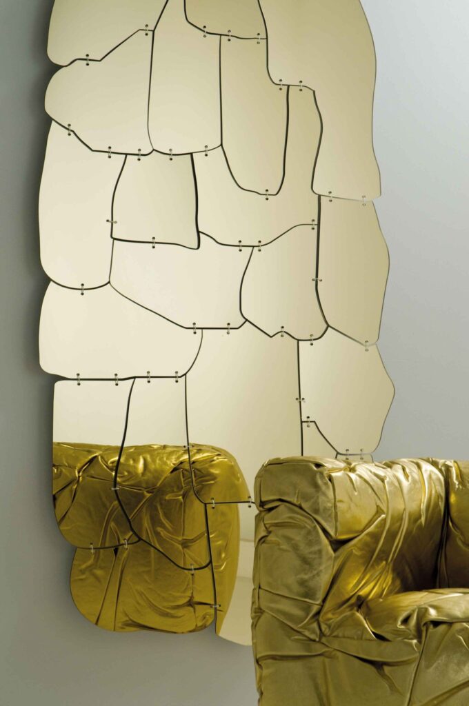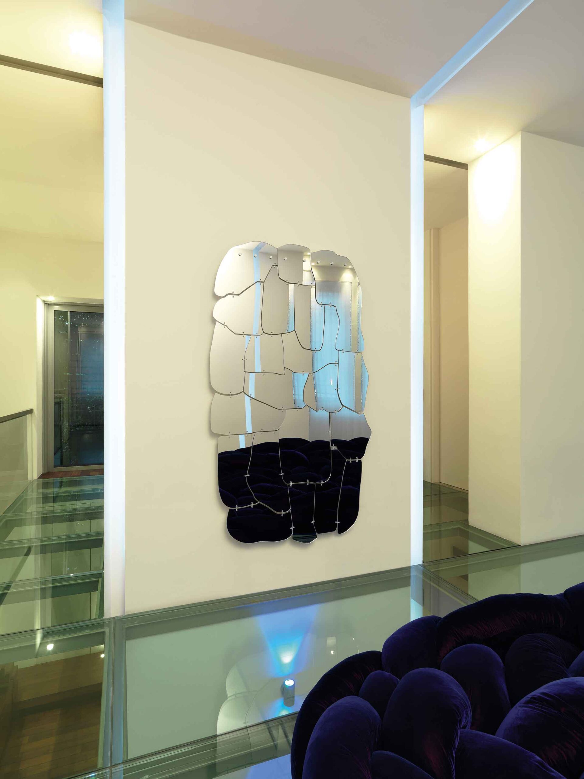 Espejo de pared, formado por el ensamblaje manual de piezas de diferentes formas en metacrilato espejado coloreado, cortadas con láser, rematadas manualmente en los cantos y unidas por lazos de nylon.