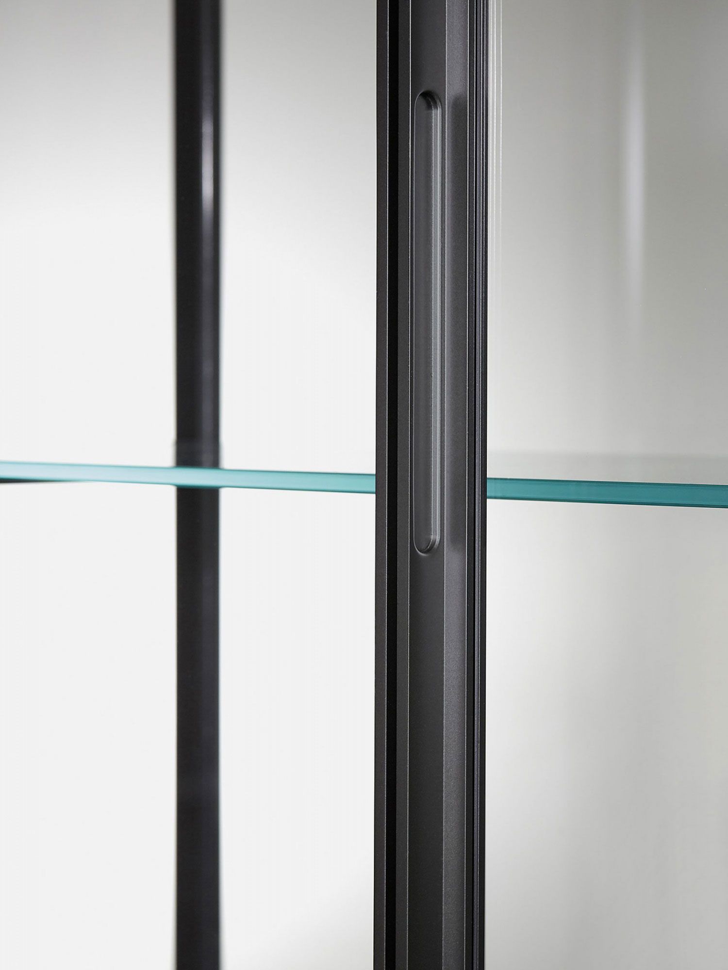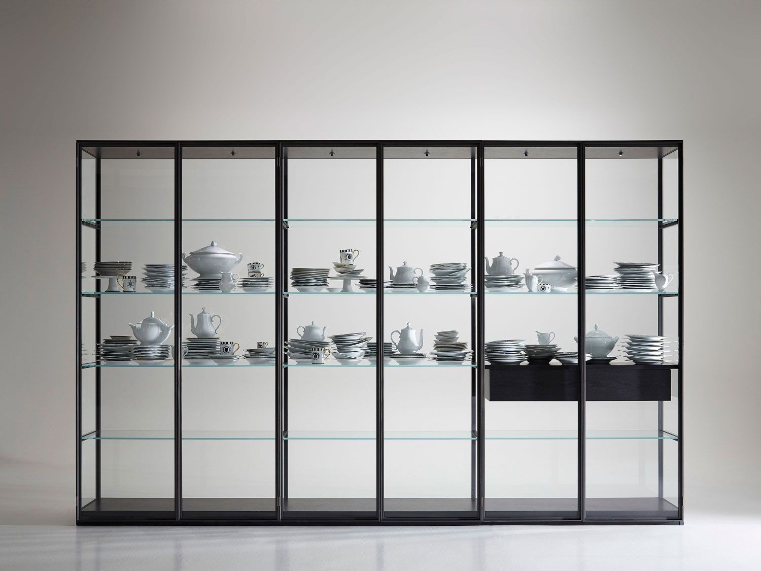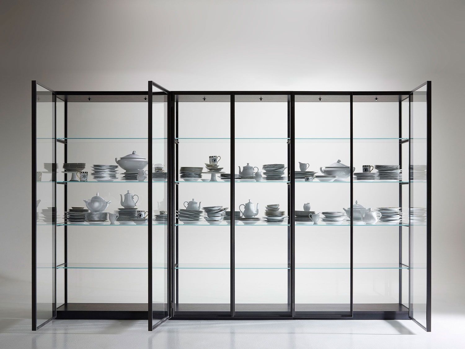Vitrina diseñada para poder almacenar y como expositor. Estructura de aluminio barnizada en efecto hierro, puertas de cristal en diferentes acabados,estantes en cristal y trasera en cristal, melamina o textil a elegir.