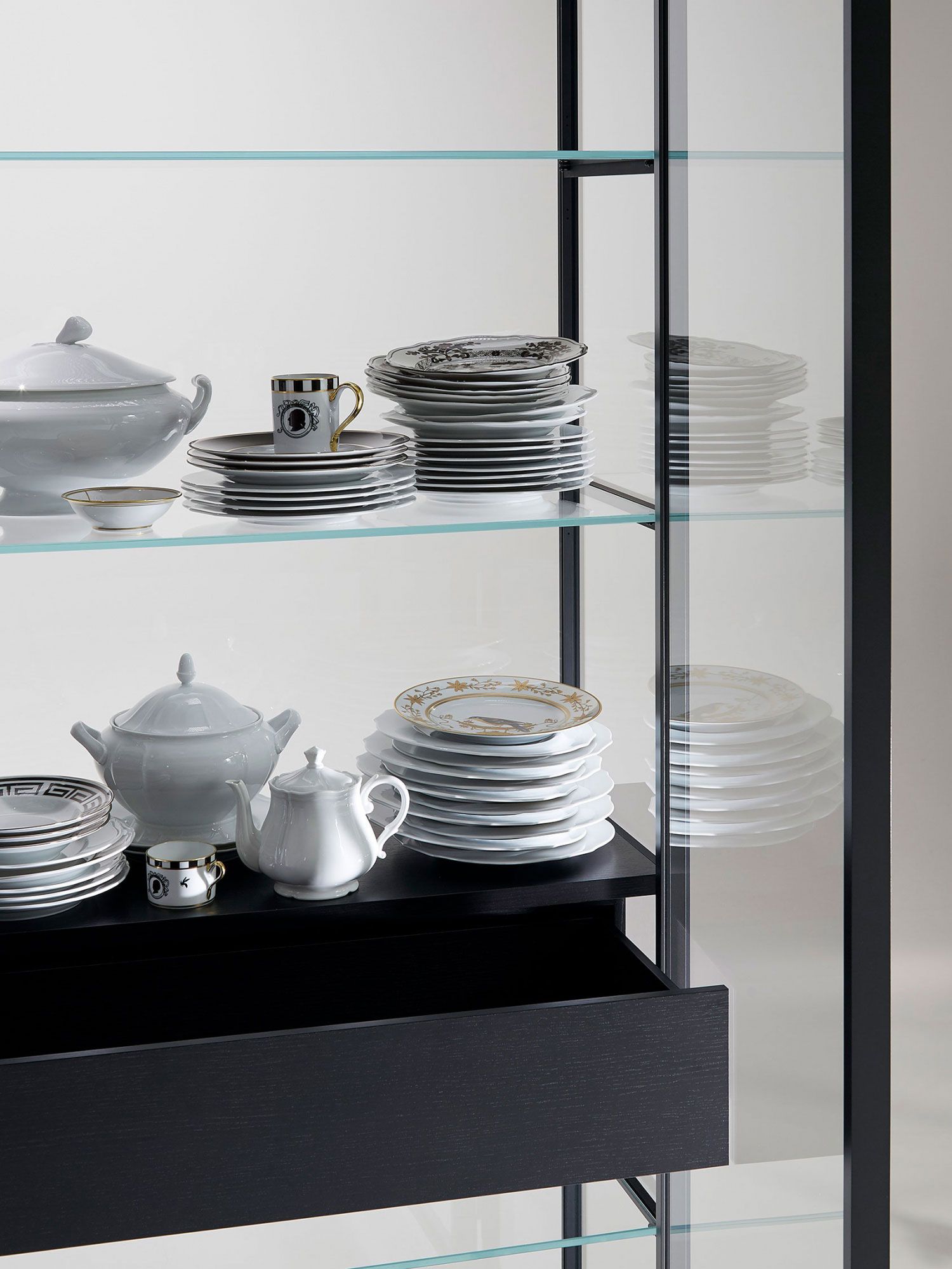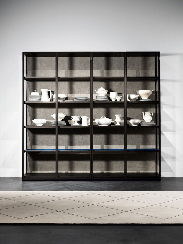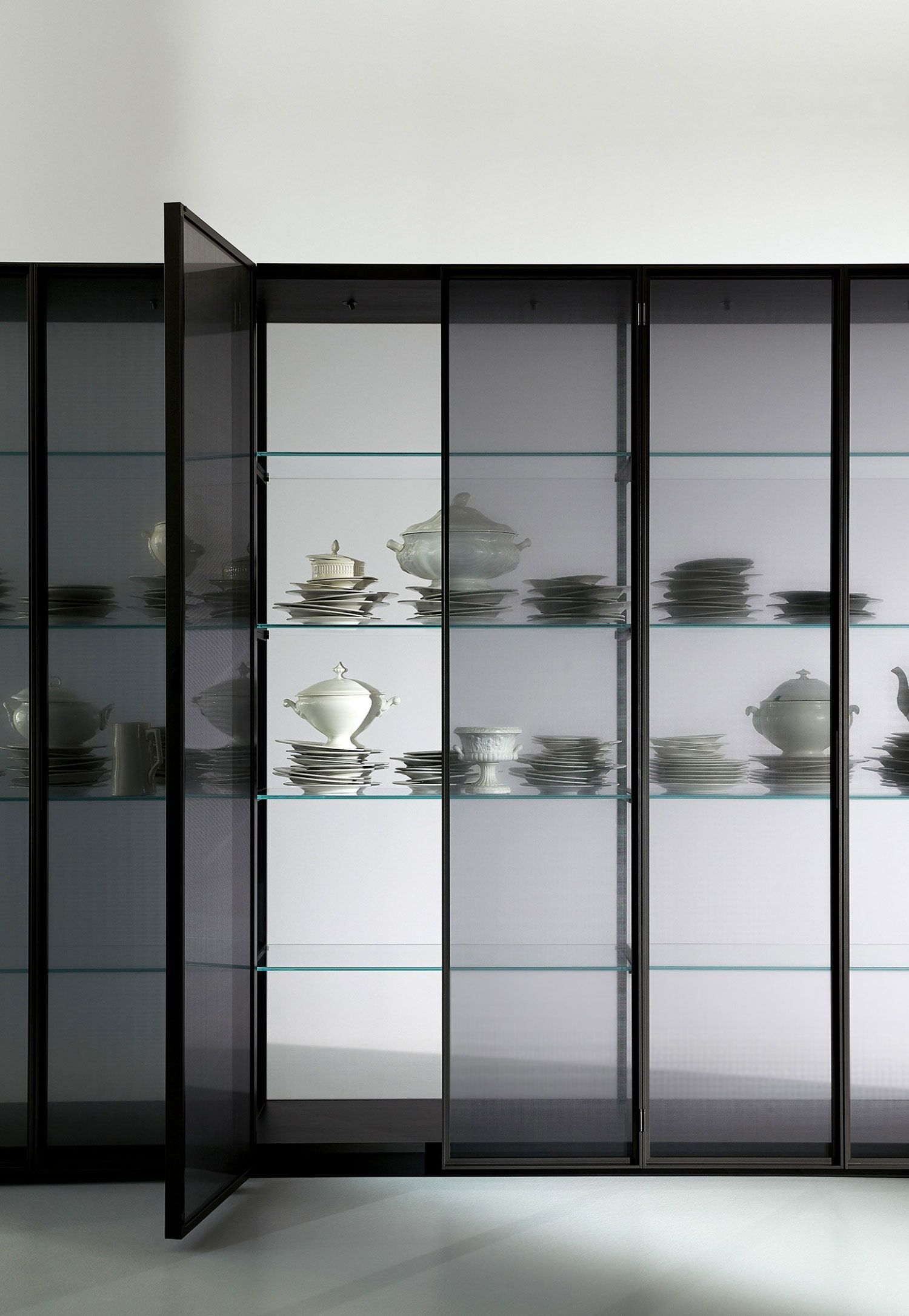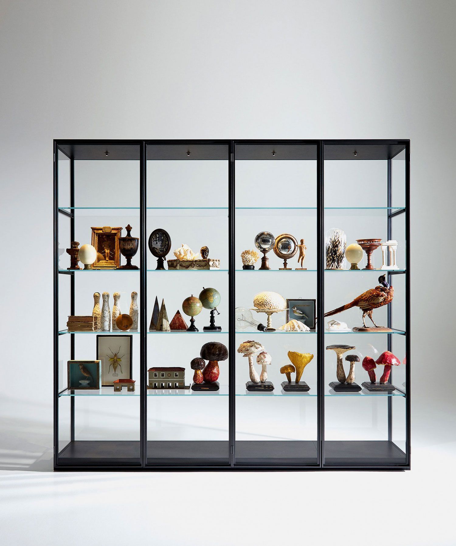Vitrina diseñada para poder almacenar y como expositor. Estructura de aluminio barnizada en efecto hierro, puertas de cristal en diferentes acabados,estantes en cristal y trasera en cristal, melamina o textil a elegir.