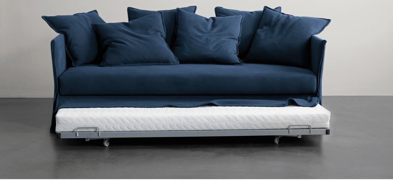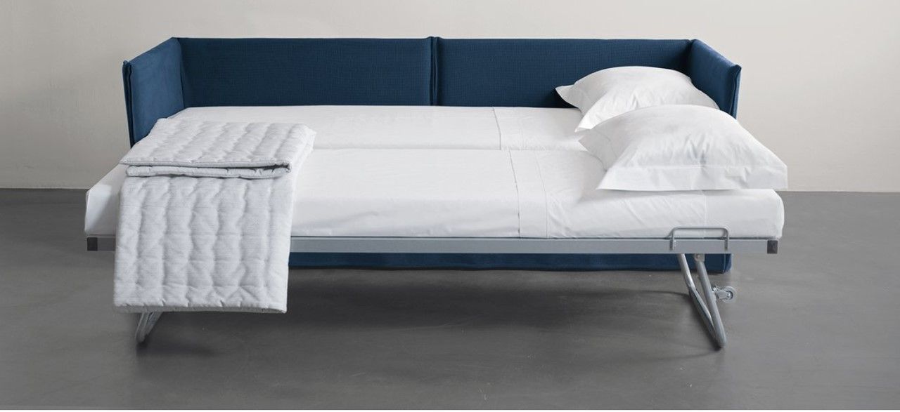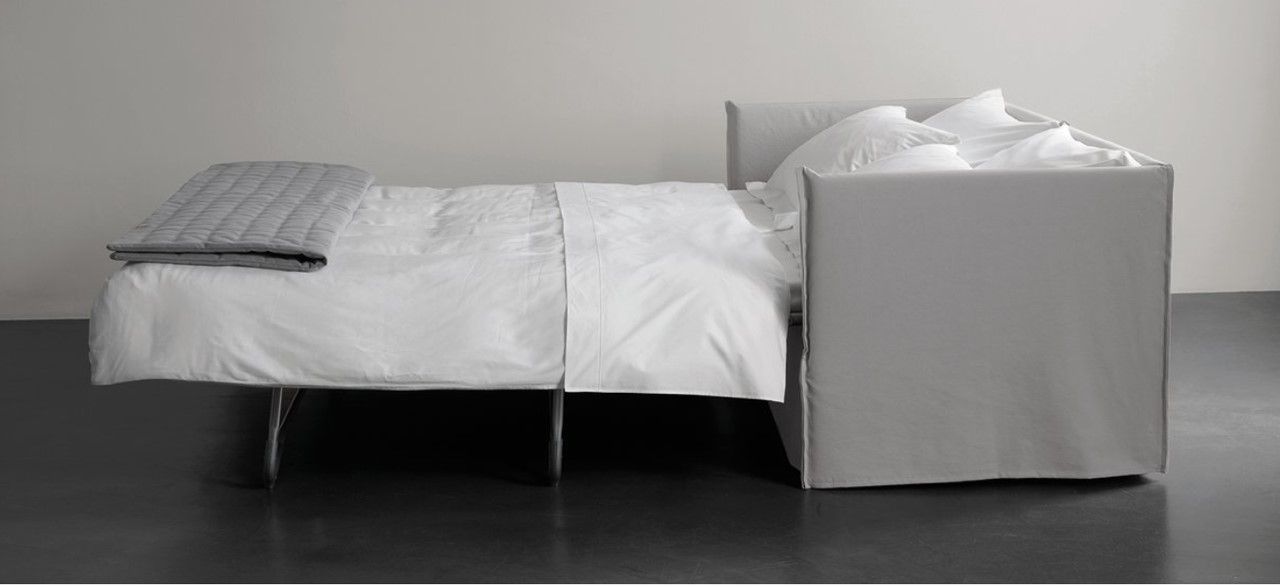 Sofá cama doble. De diseño esencial y puro, perfecto para dormitorios de invitados o estancias donde sea buena opción tener una cama para cualquier ocasión. Su lineas rectas y sencillas hacen que se adapte fácilmente a cualquier espacio.