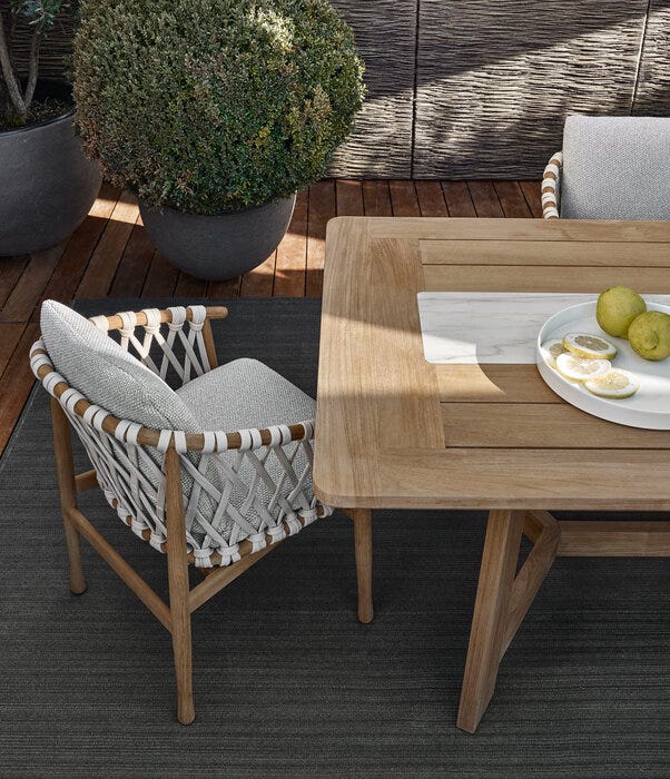 Ginestra es una colección de grandes mesas de comedor de exterior rectangulares y redondas. Realizadas en madera de teca maciza natural, las tapas se enriquecen con una inserción central de gres porcelánico que recuerda al mármol blanco Calacatta.