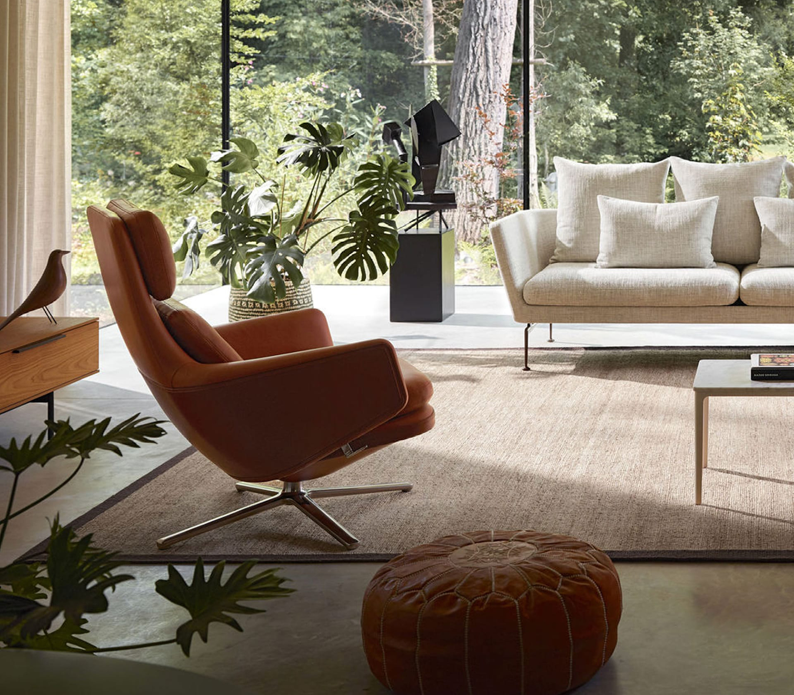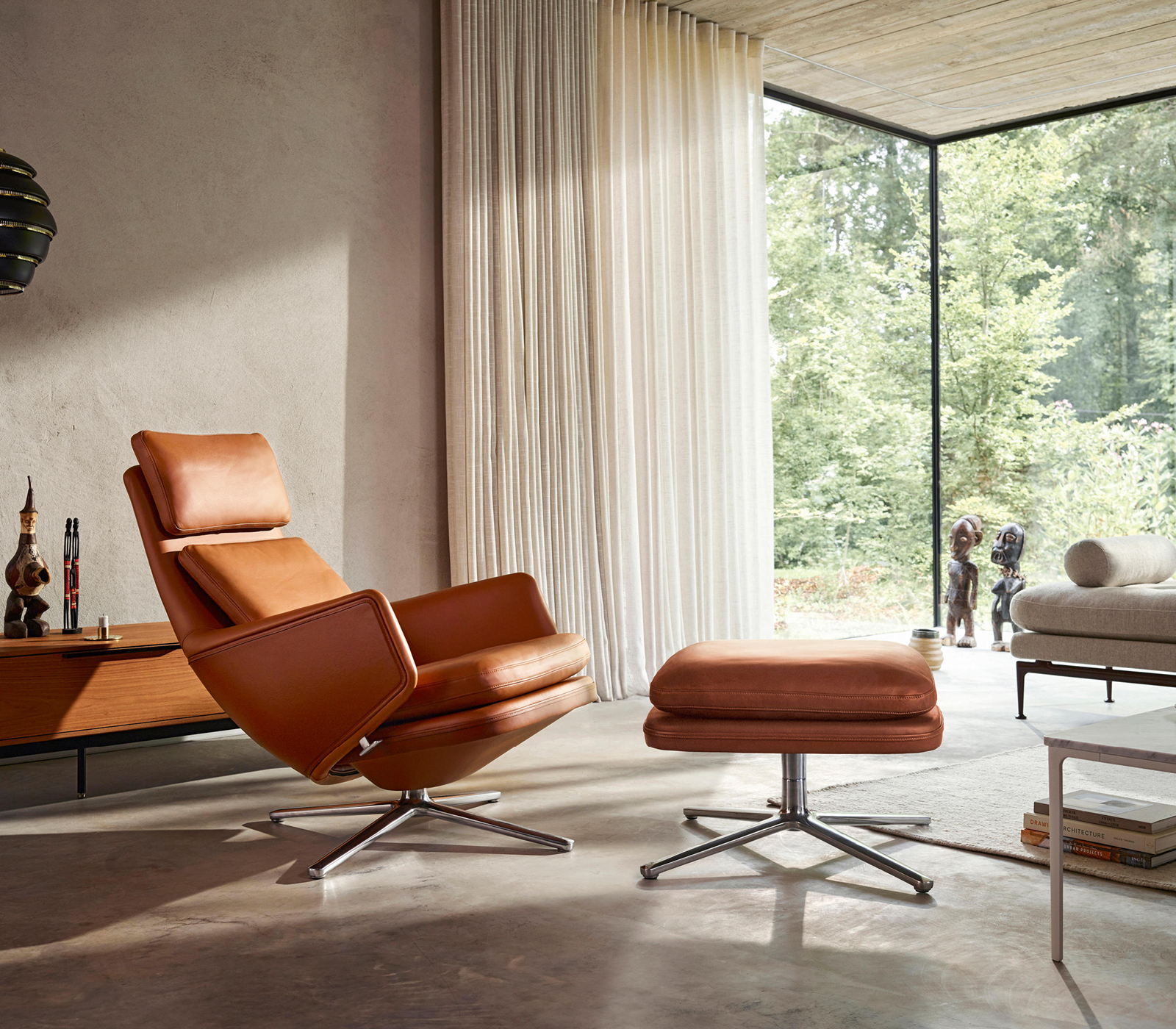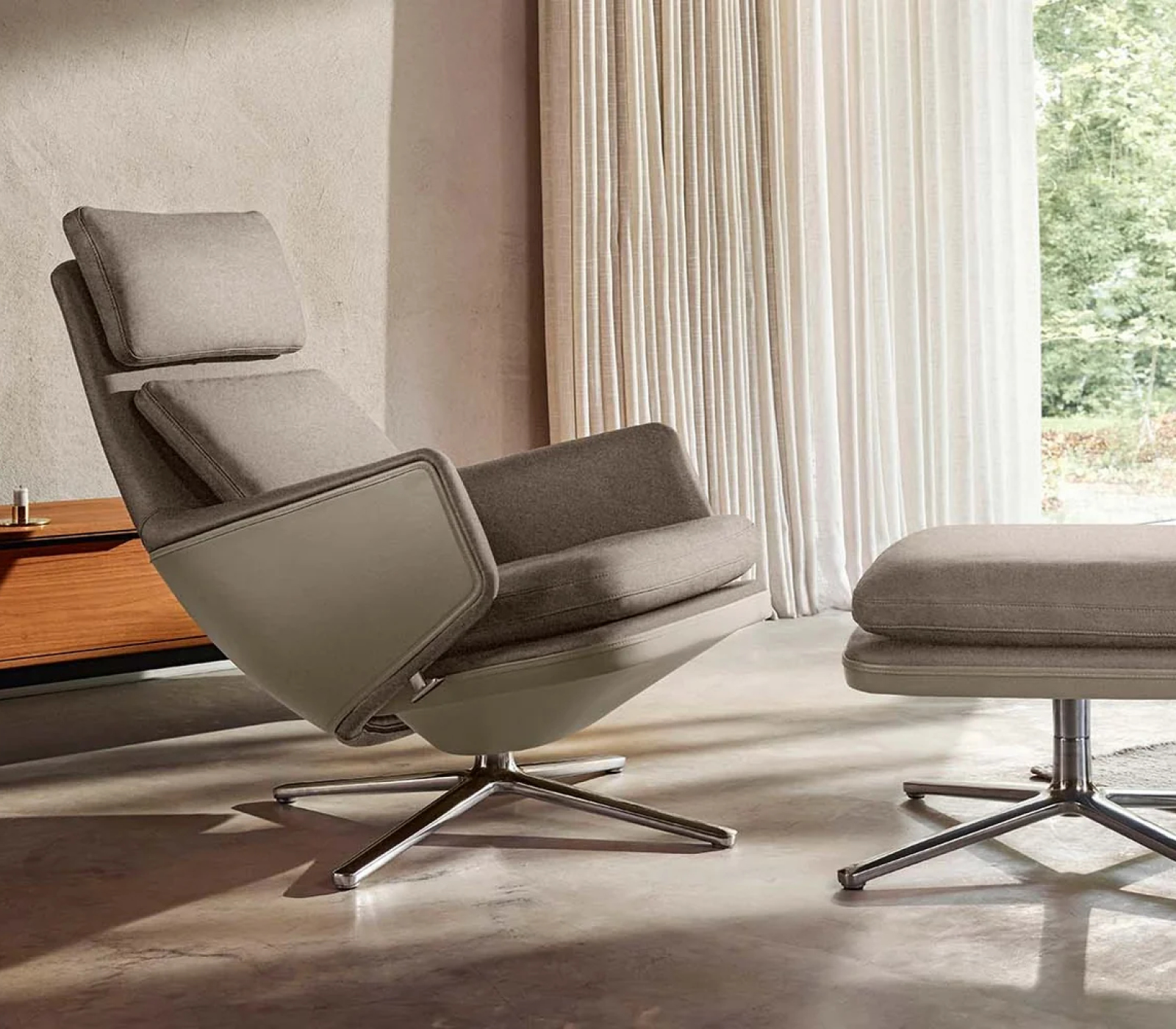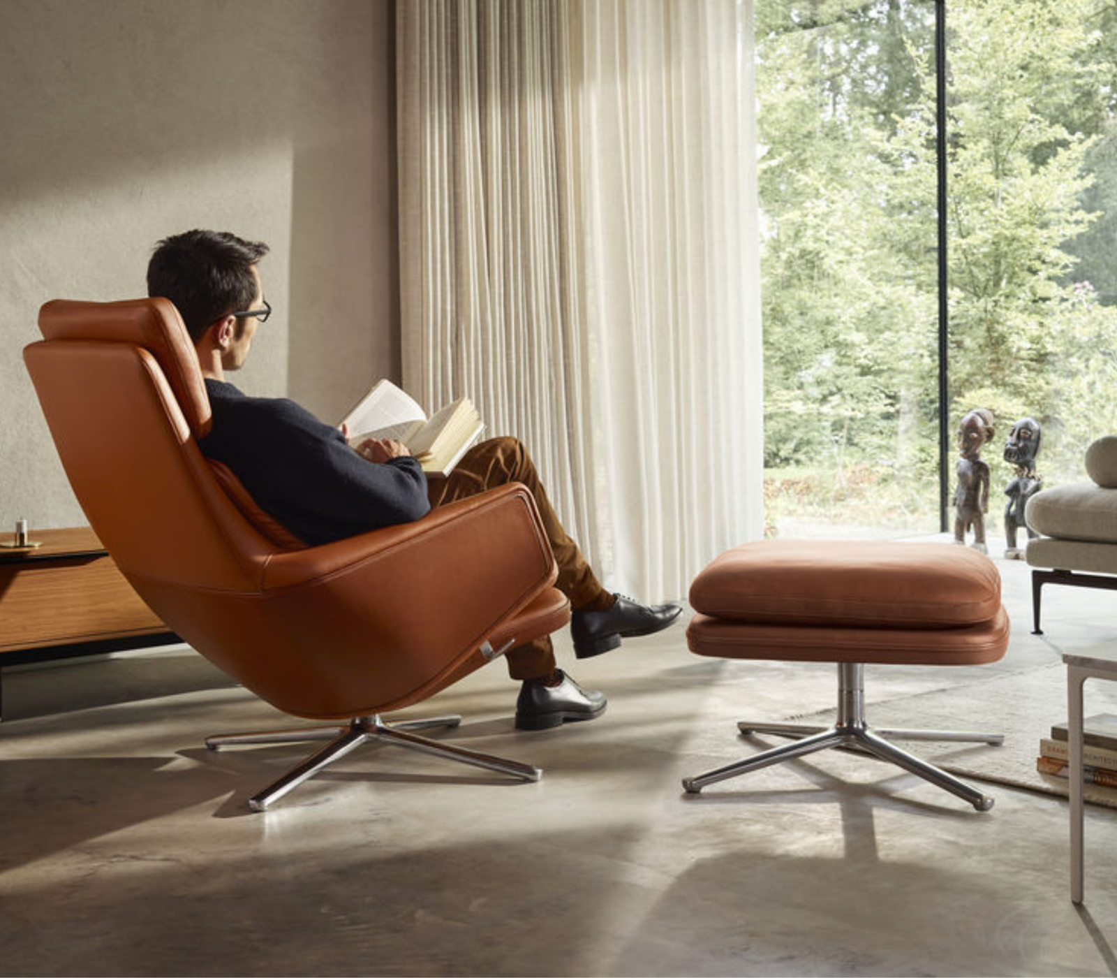 La butaca Gran relax tiene una estética muy cuidada, discreta y clásica. Reclinable, el respaldo puede bloquearse en cualquier posición. Sus cojines con camara de aire y rellenos de espuma de poliuretano y plumas de oca, haces que tenga una sensación de comfort al sentarse.