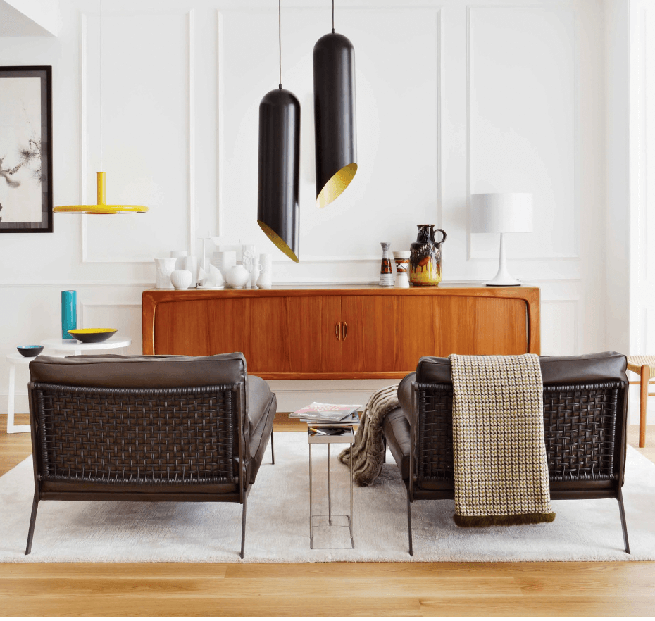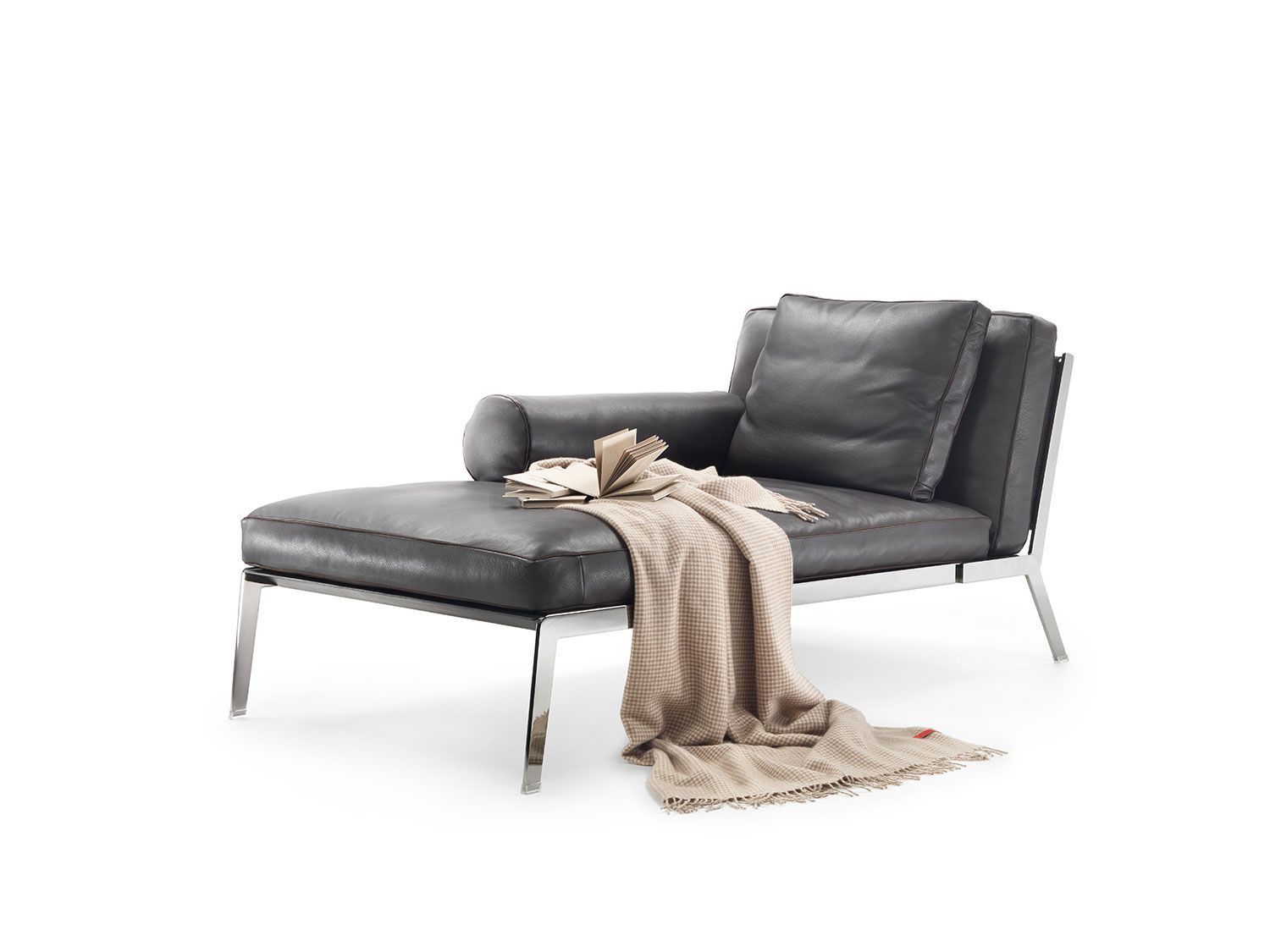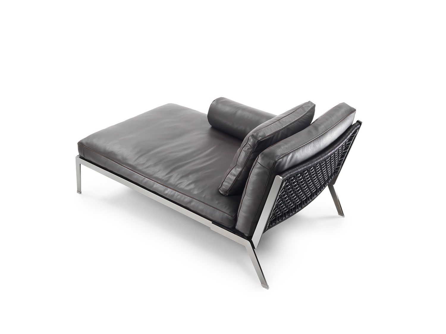 Chaise longue con un original respaldo trenzado hecho a mano. Su fina y elegante estructura contrasta con los suaves cojines rellenos de plama de ganso.