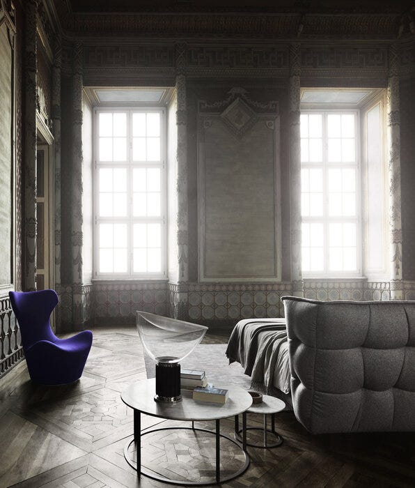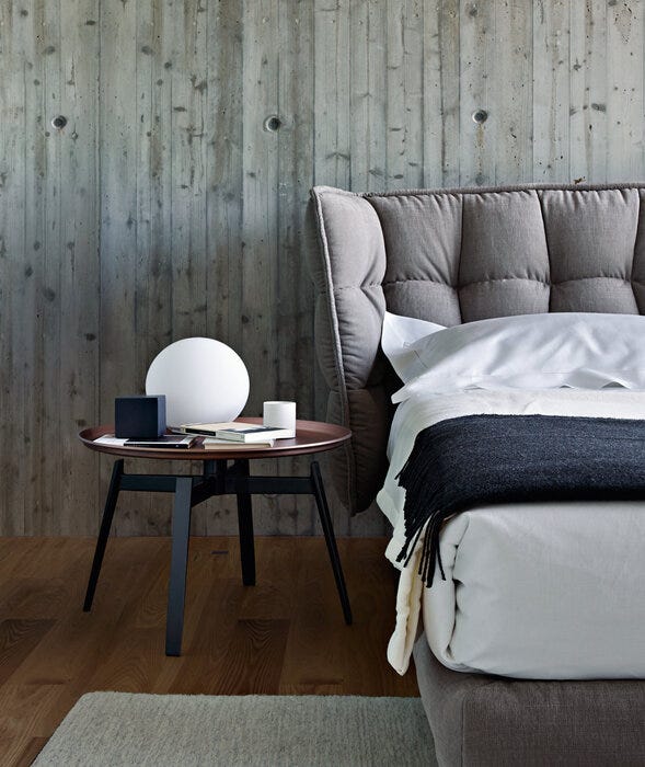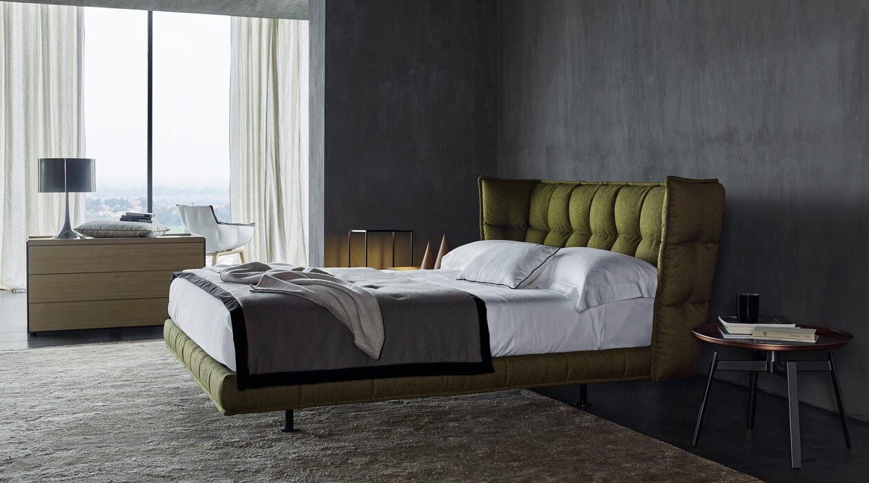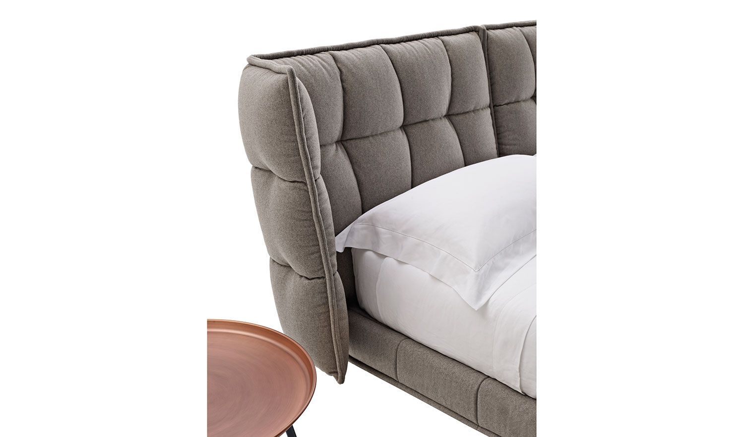La cama de diseño Husk, tapizada en tela o piel, presenta un cabecero con gran personalidad que admite un somier, disponible en cuatro tamaños. Suave y acogedor, simple pero complejo en su geometría, el cabecero está decorado con detalles de capitoné. La cama Husk refleja la misma búsqueda de suavidad y confort que inspiró al sillón del mismo nombre, origen de una colección que incluye también sofá, sillas y mesas auxiliares.