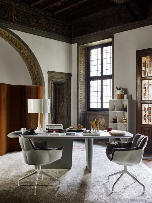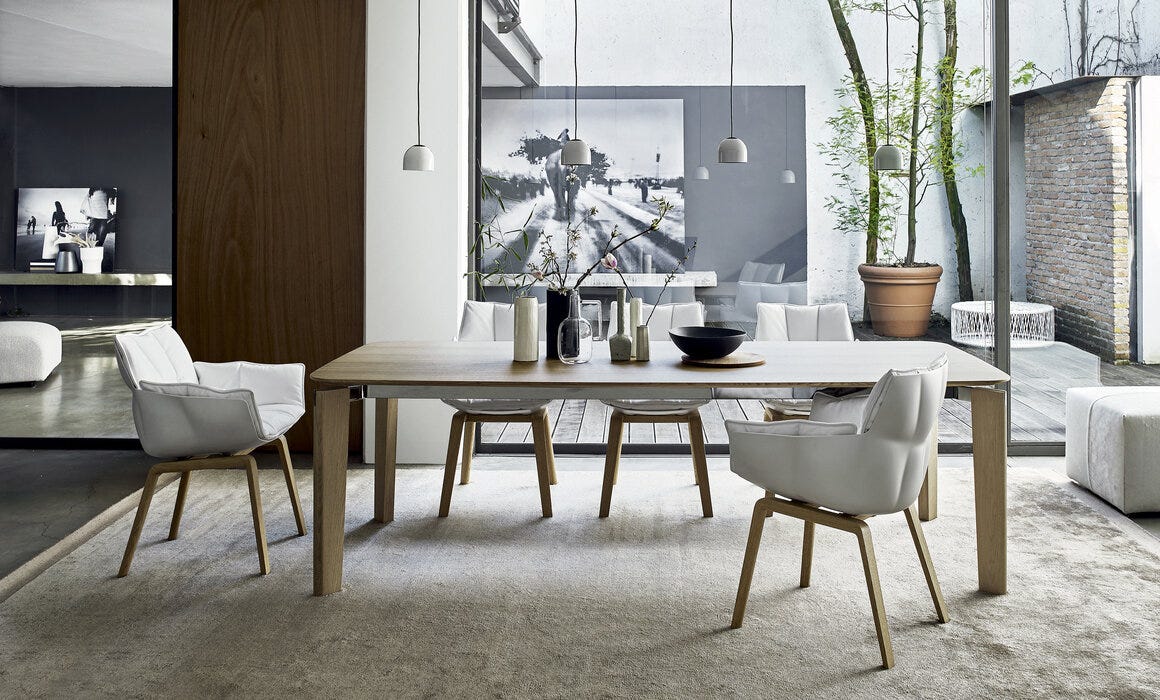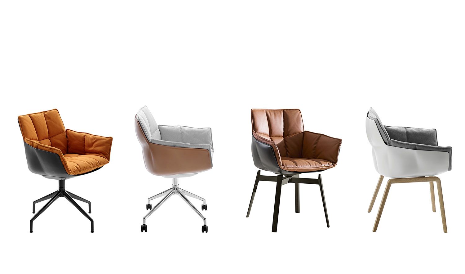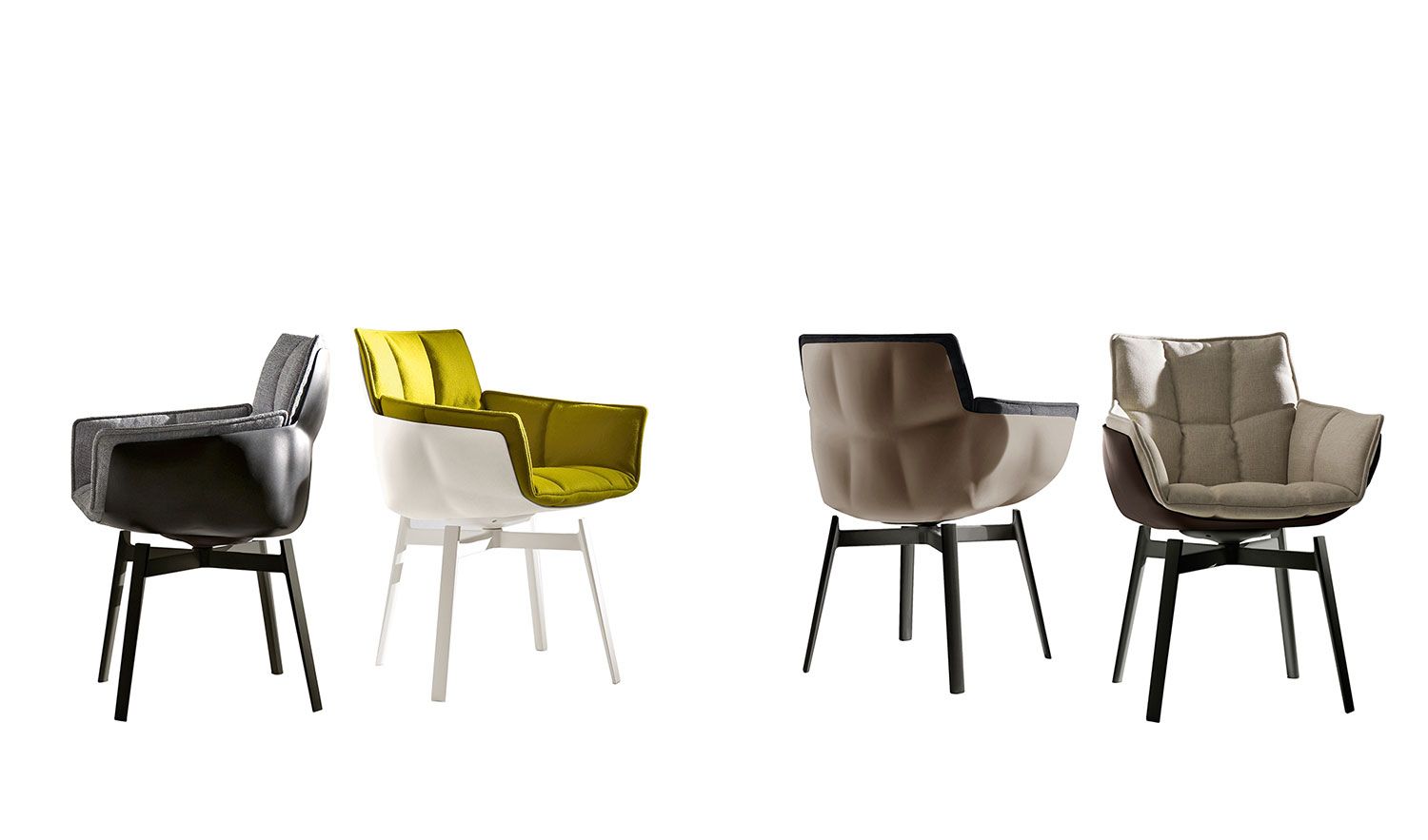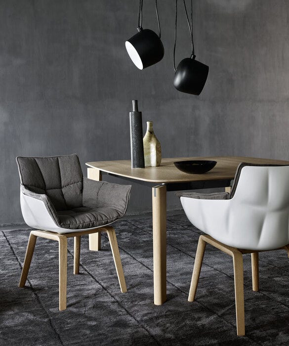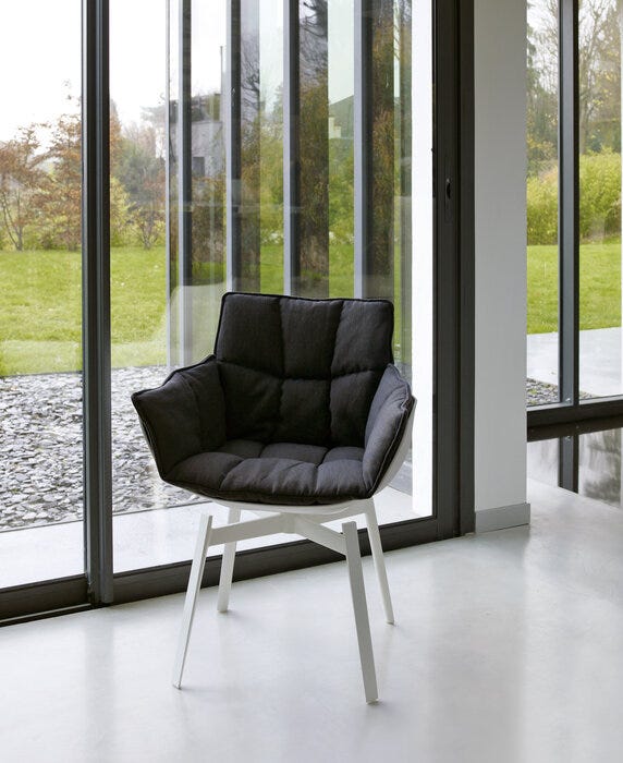 Silla con brazos, eco-sostenible gracias a su estructura de Hirek, material plástico hecho de polímeros reciclados y reciclables. Tapizado acolchado característico de capitoné.