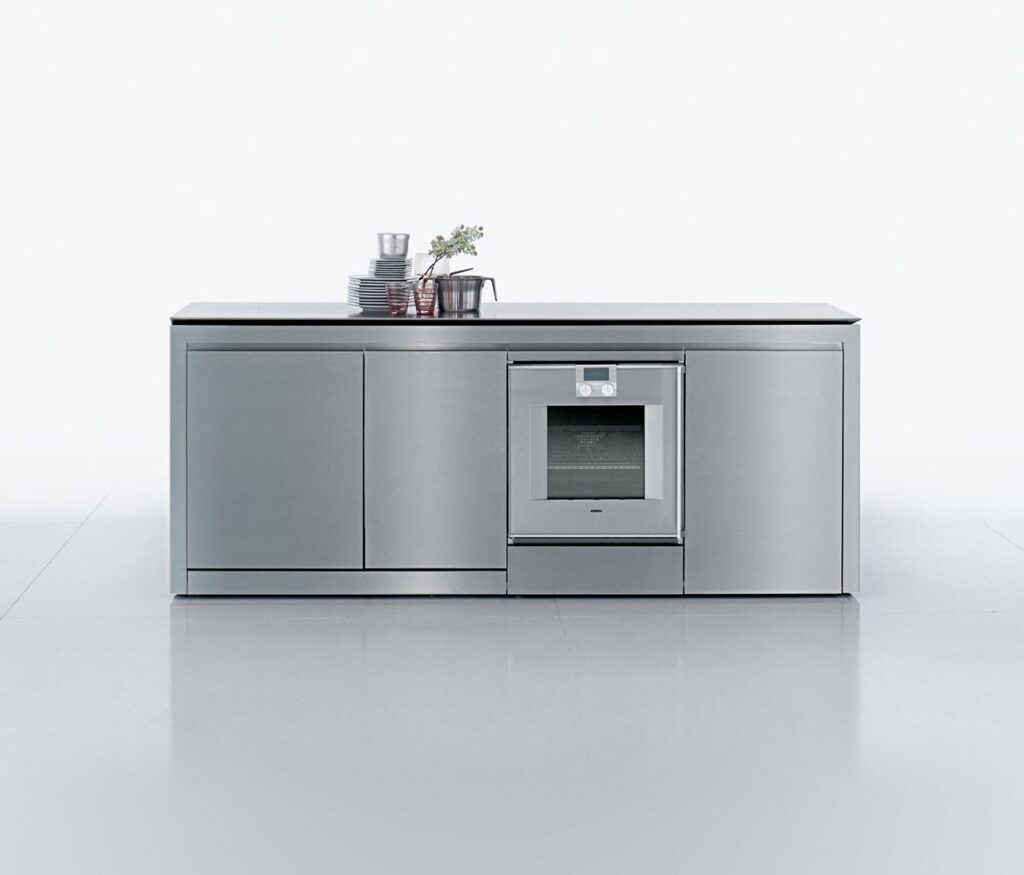Bloque de cocina con sobre superior deslizante en diferentes acabados posibles (acero inoxidable/Corian/madera chapada con canto en acero inox), y encimera de trabajo fija en acero inoxidable. Se completa con contenedores con frontales en acabados: madera (según catálogo), acero o corian. En exterior, solo puede ir en corian, y siempre en espacios protegidos por una cubierta.